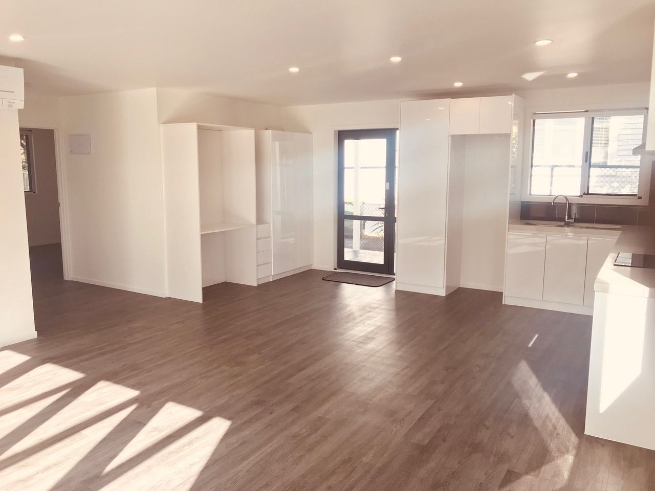 Open plan modern kitchen, dining, lounge, opening out onto sunny balcony. Laminate flooring throughout.