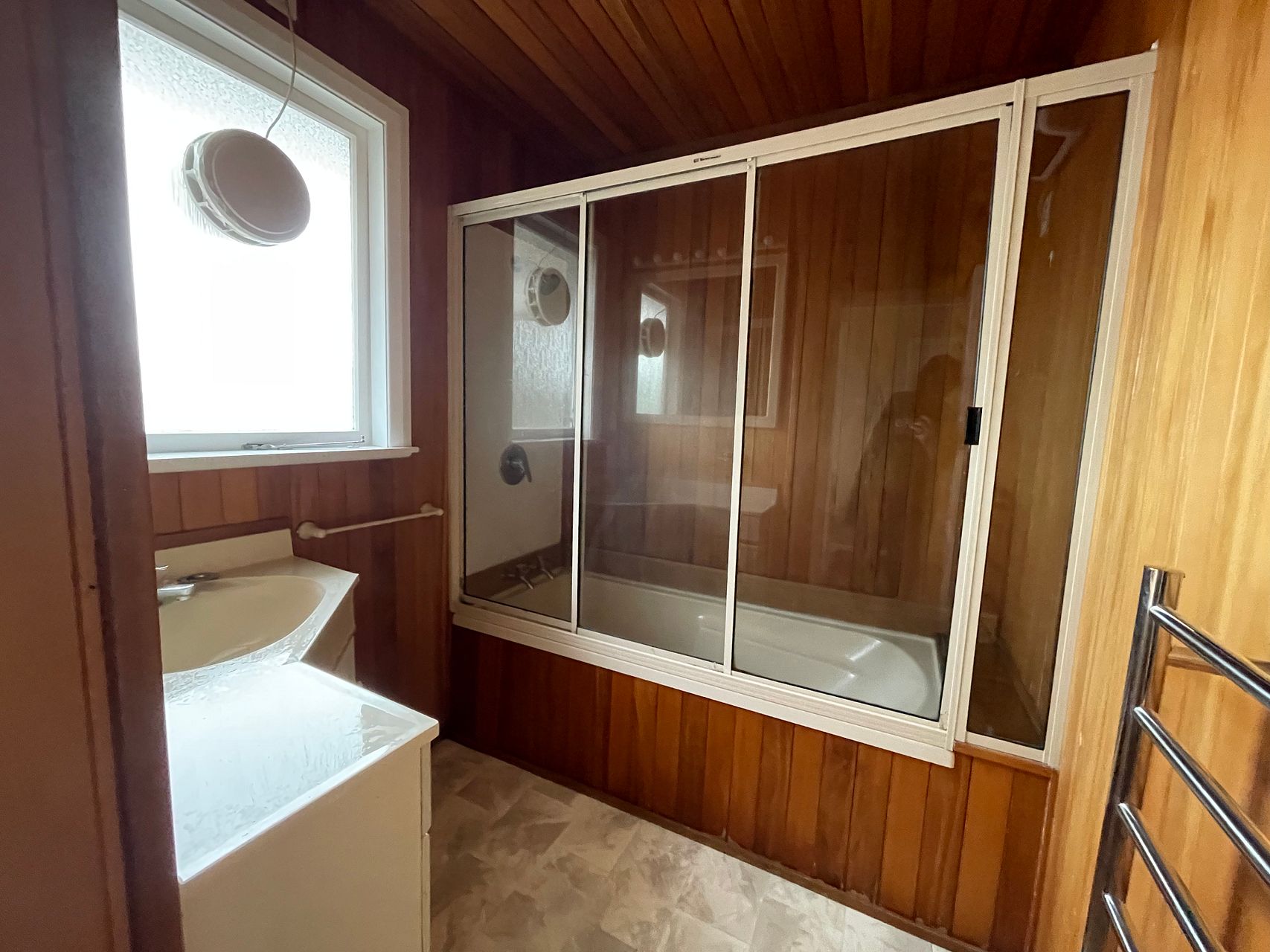 Separate toilet. Bathroom with shower over bath, heater and heated towel rail.