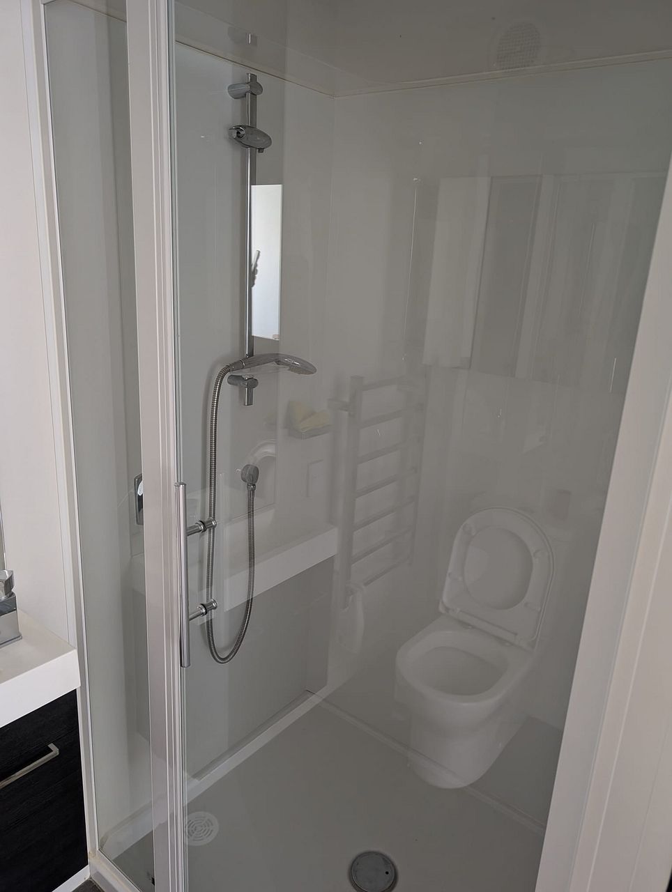 2 bedrooms with ensuite bathrooms and large built-in closets, one additional guest bathroom, storage spaces, laundry and a slim outdoor porch with drying rack and additional entrance to the unit.