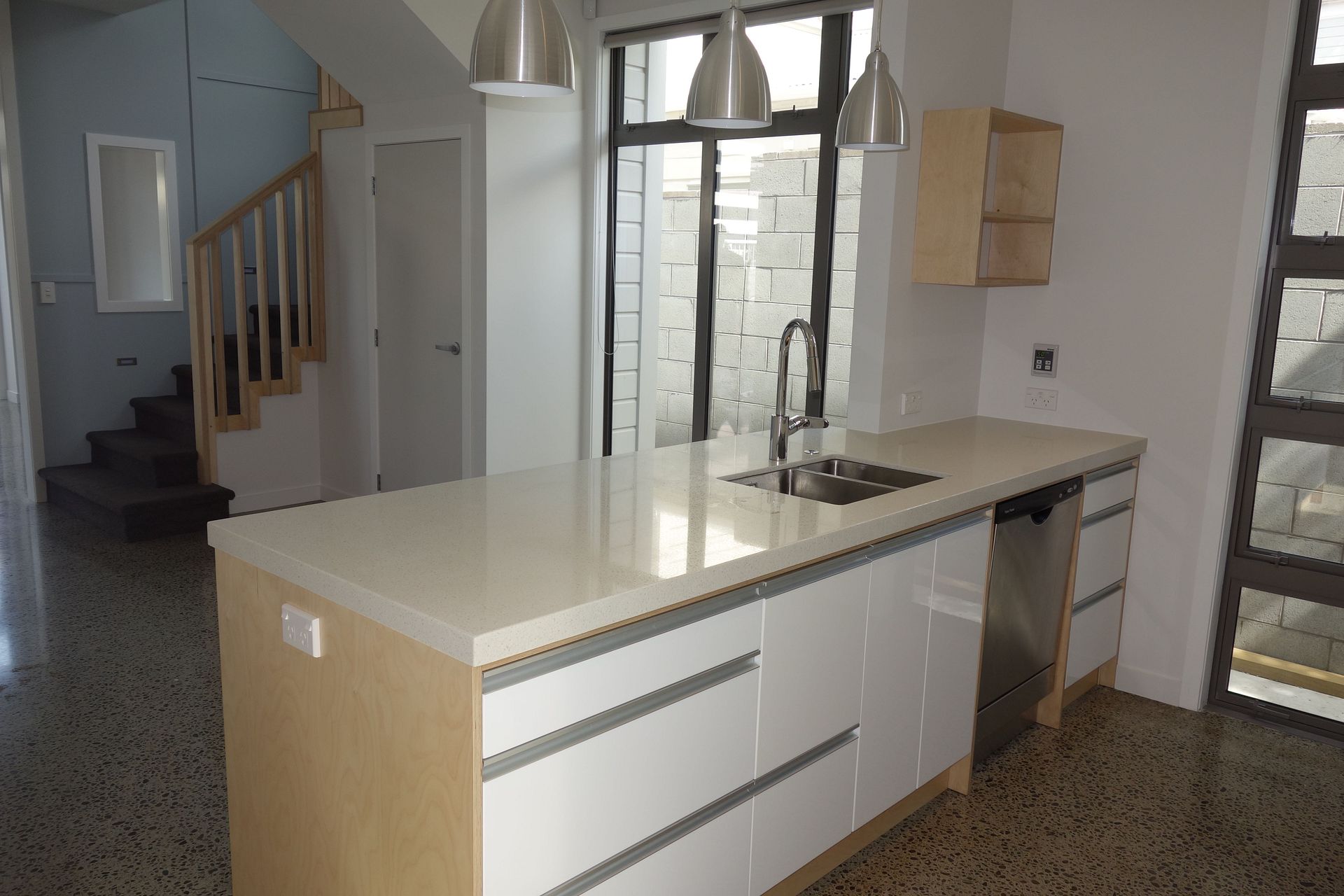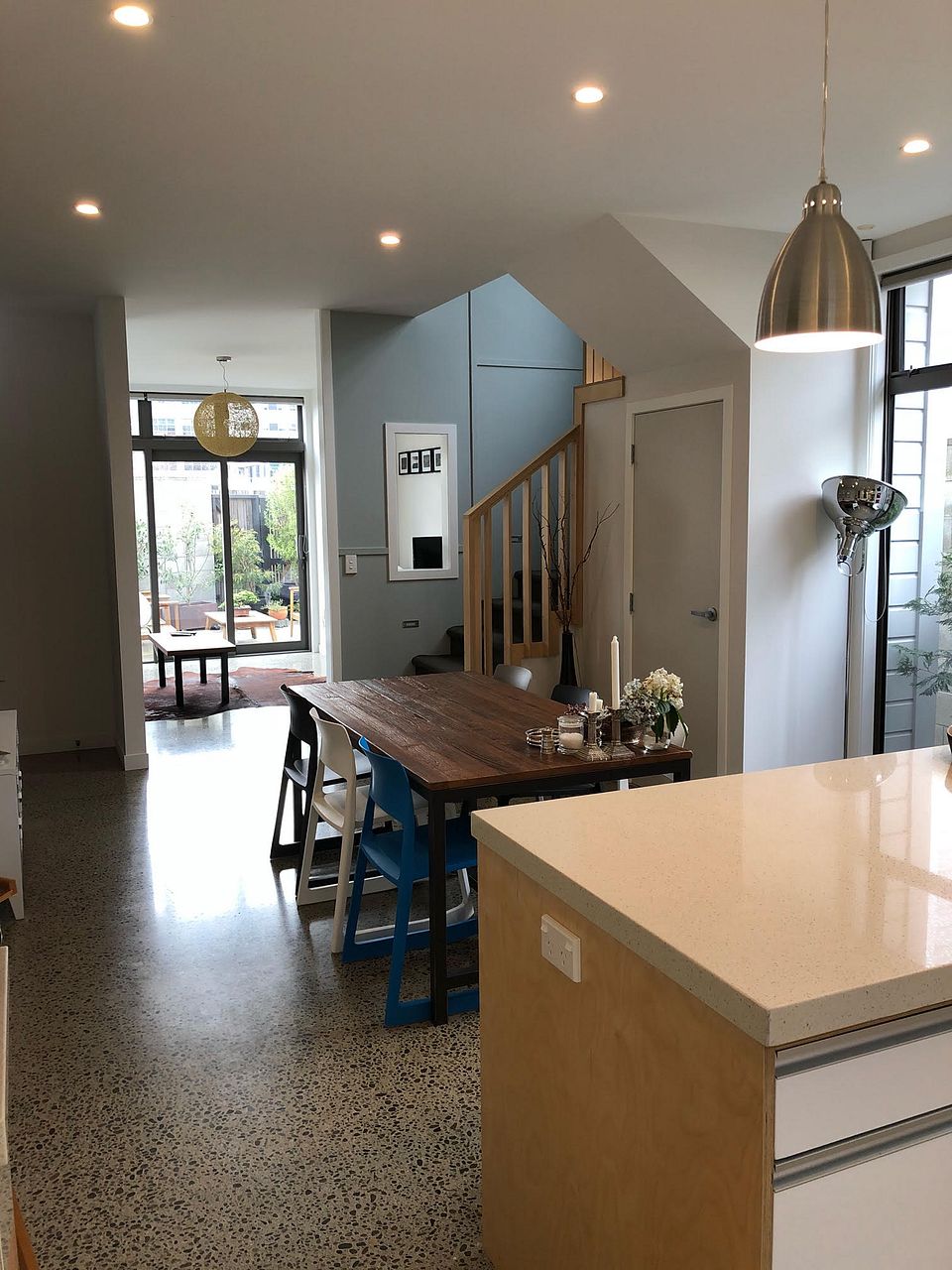 Downstairs has the open plan living room, dining, and entertainer's kitchen, plus a laundry and second toilet.
