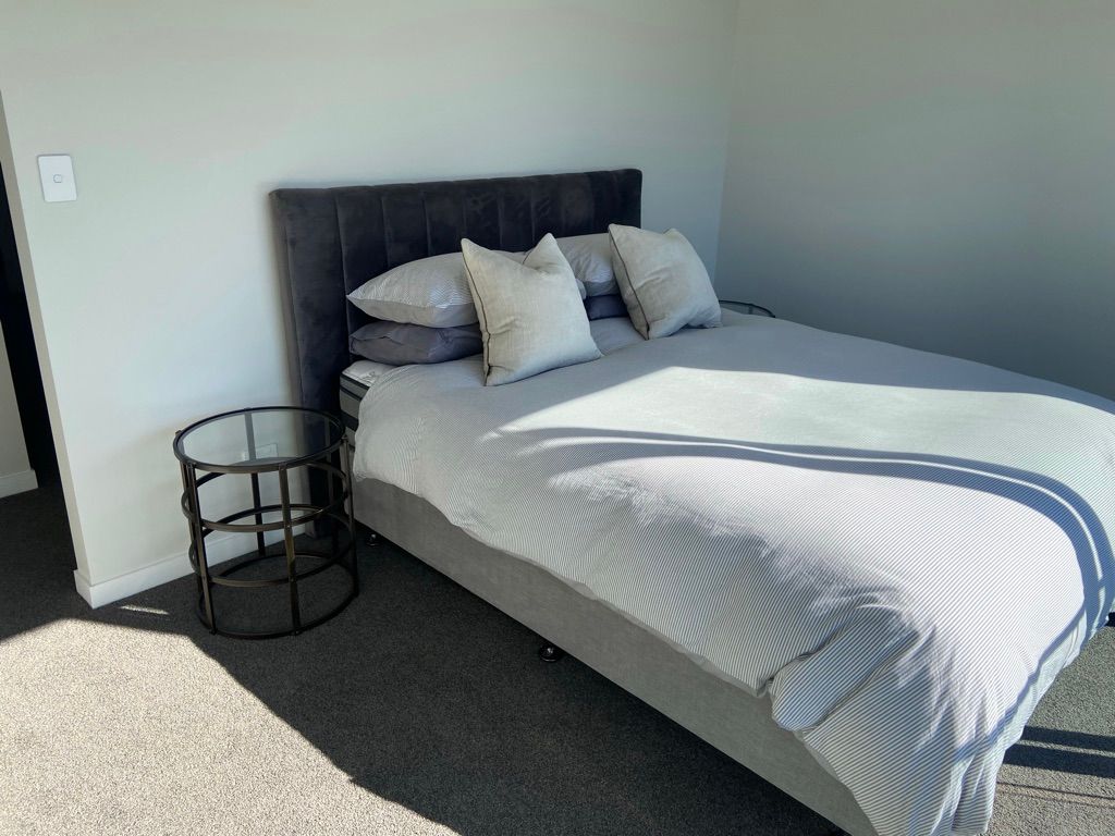 The home includes all the amenities of a new build such as a heat pump (in the living area), fully tiled bathrooms, fully carpeted bedrooms, and a designer kitchen with a Bosch fridge and dishwasher. The master suite on the upper level has a walk-in wardrobe and sliding doors opening out facing North.