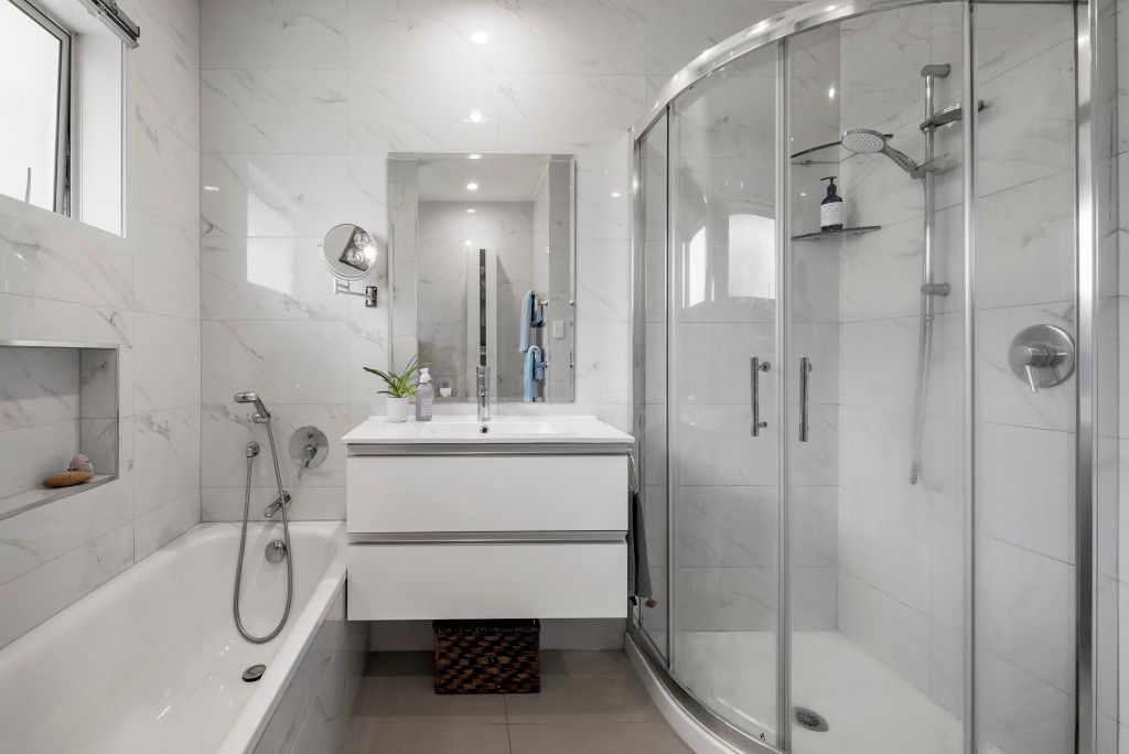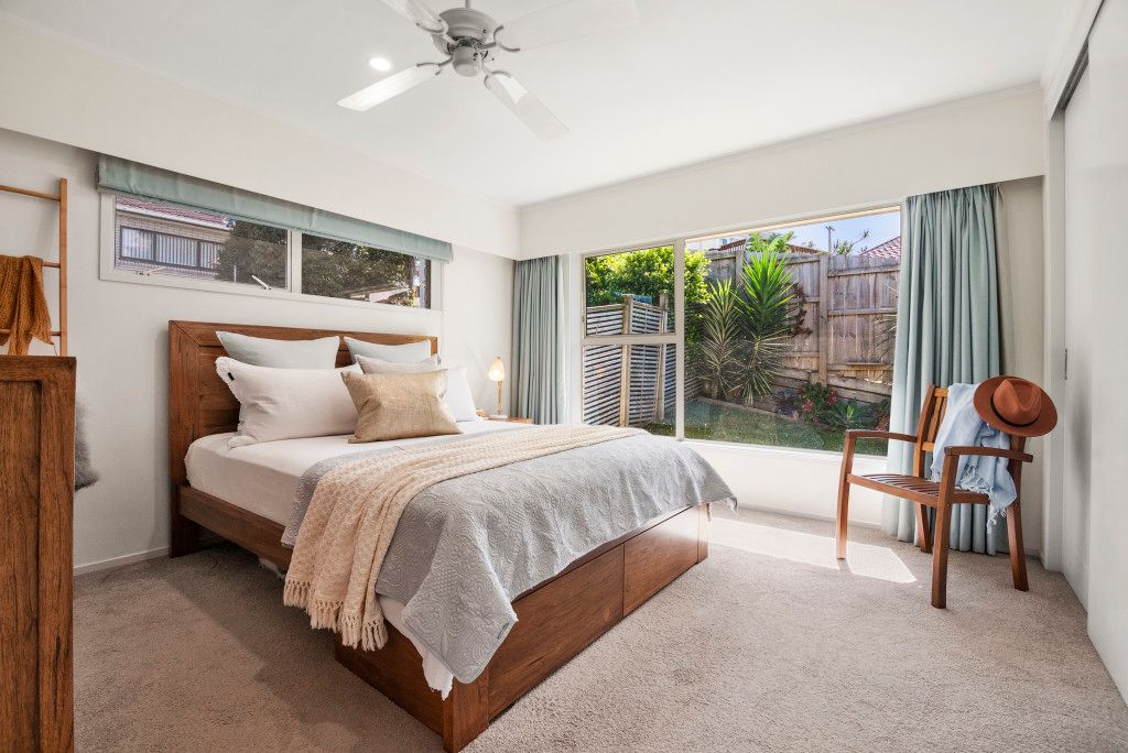 The beautifully renovated kitchen is one you would expect to find in a large family home. Take in the gorgeous views across the valley to Rangitoto. A louvre system provides a canopy over the very generous deck that extends from the already spacious living/dining area. Morning to midday sun streams into this area and night time gives you the same peaceful view over the valley this time with the twinkling of lights.