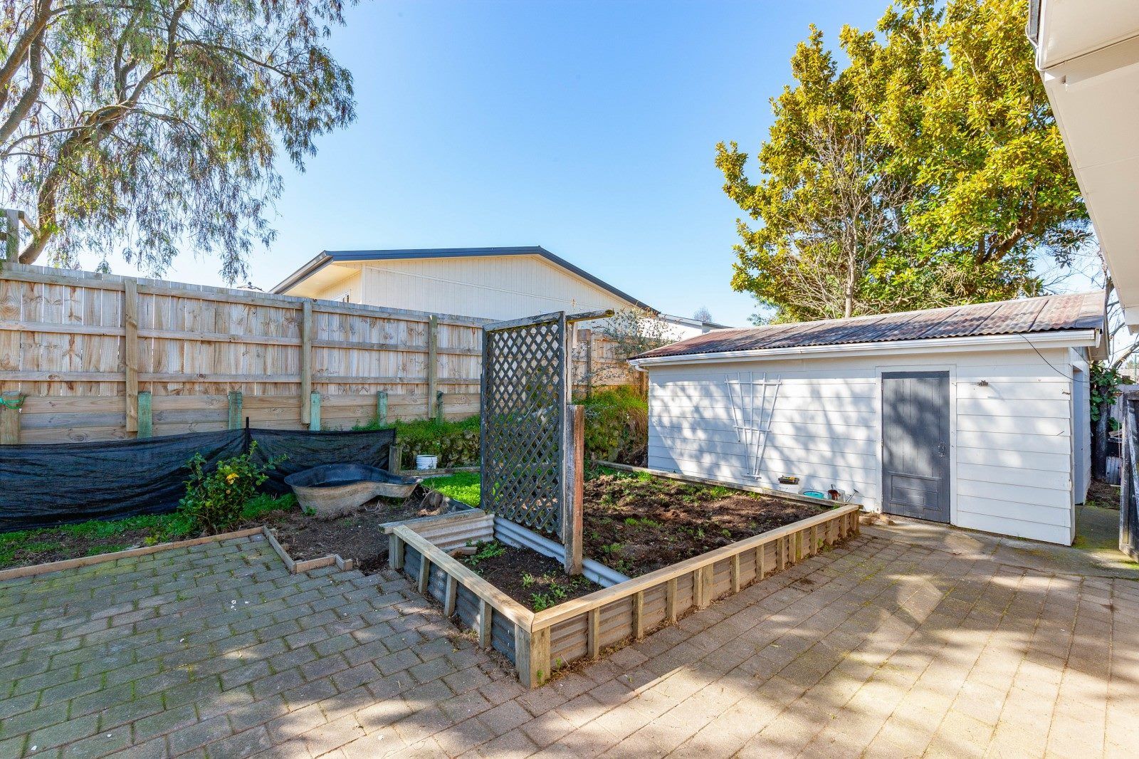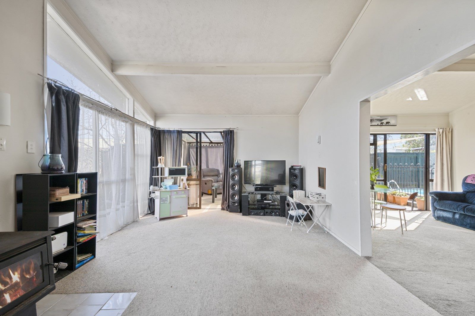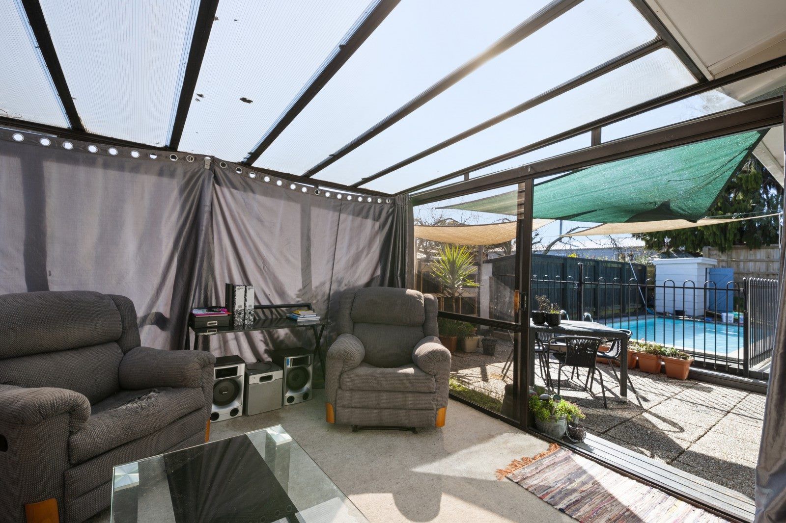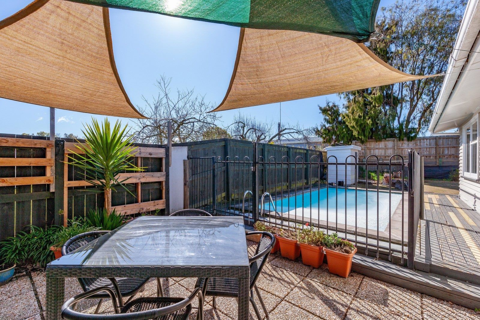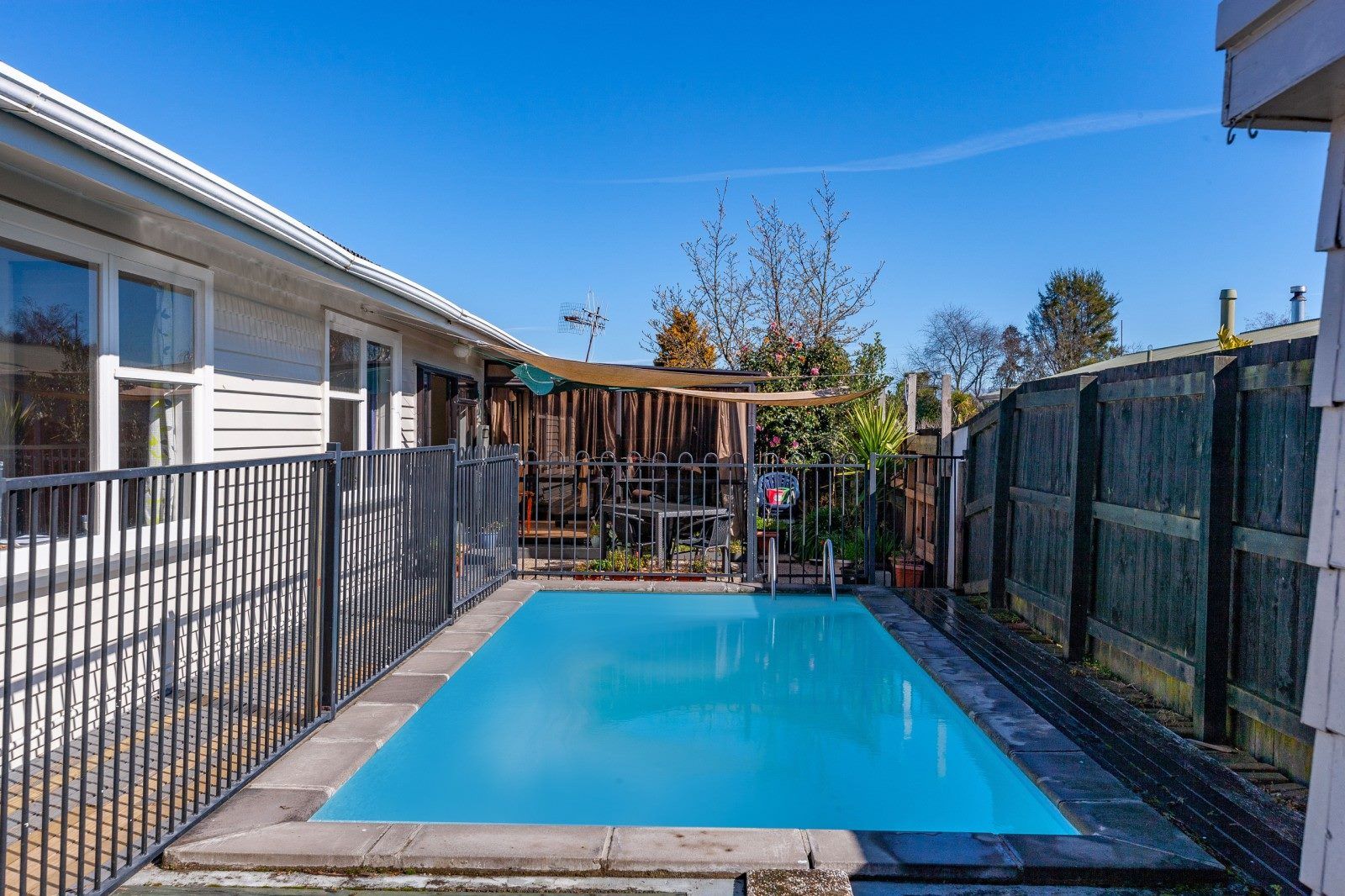 Outside, a fully fenced backyard sumptuous in-ground swimming pool and separate garaging and carport.
