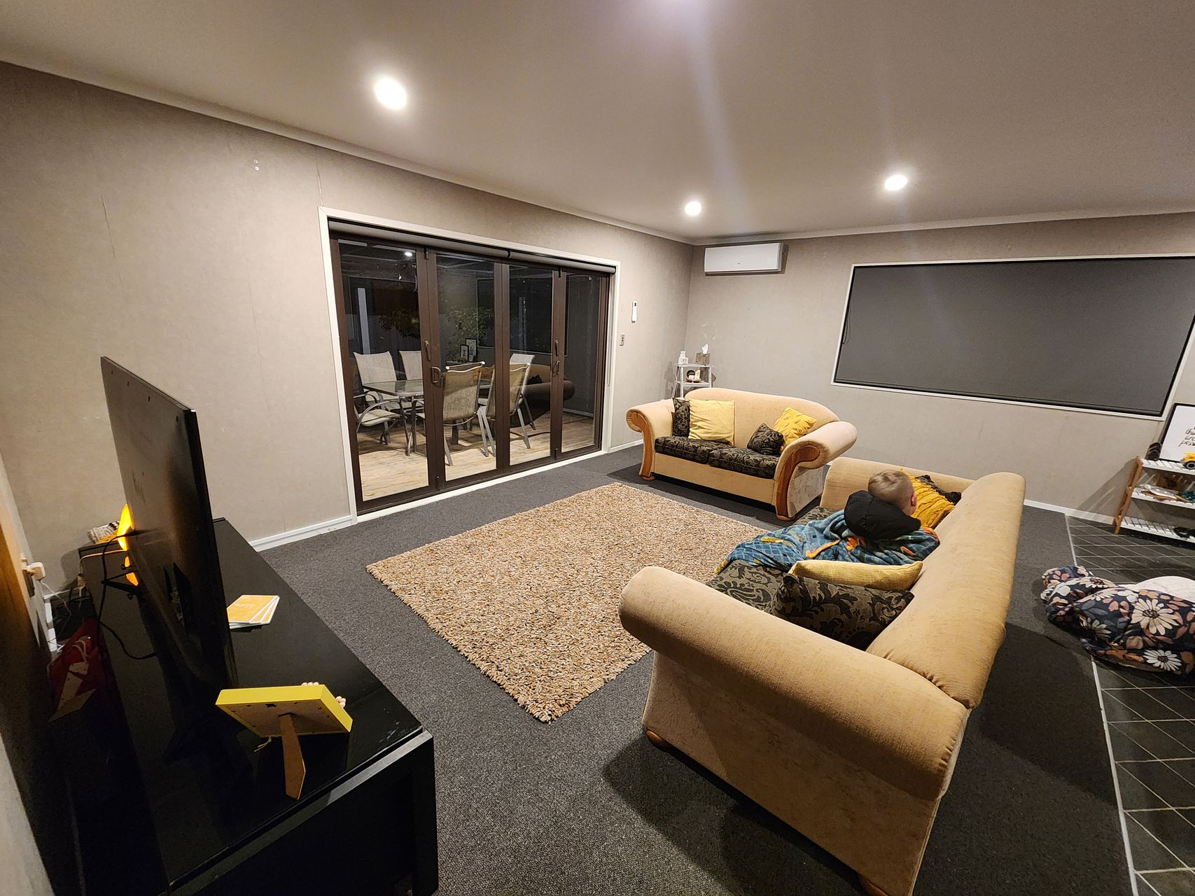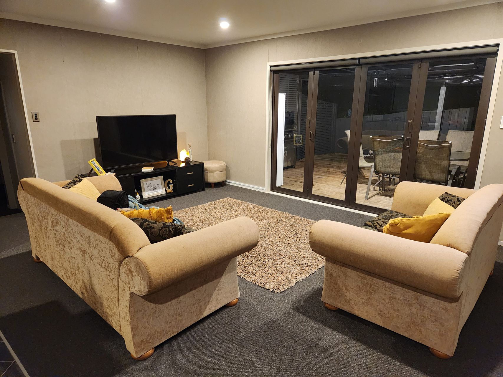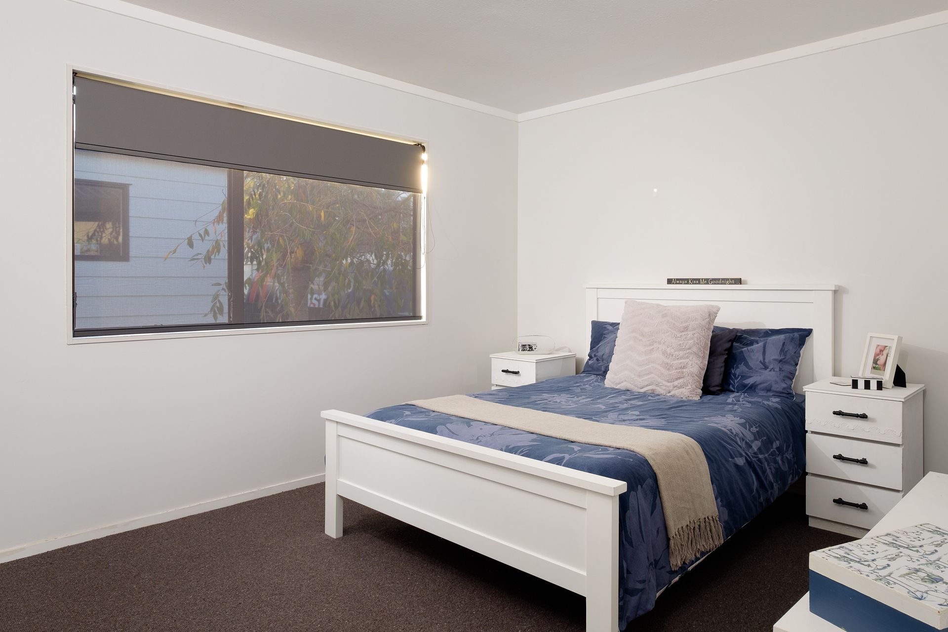 Nearly new carpet, sun filter blinds and block out blinds.