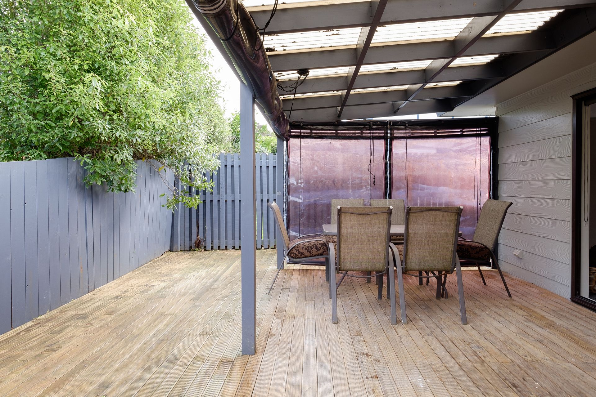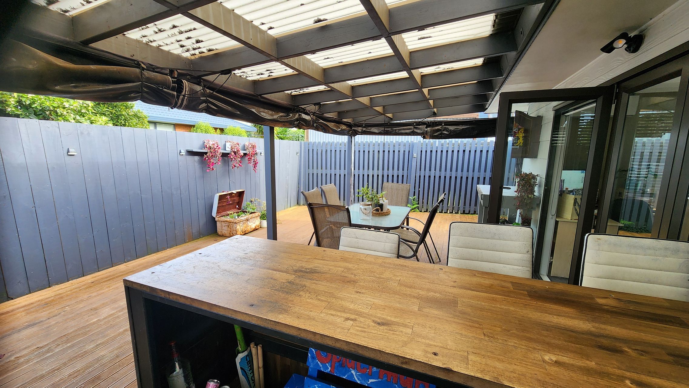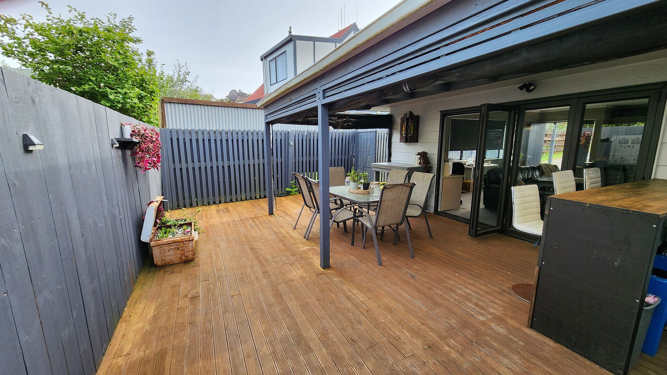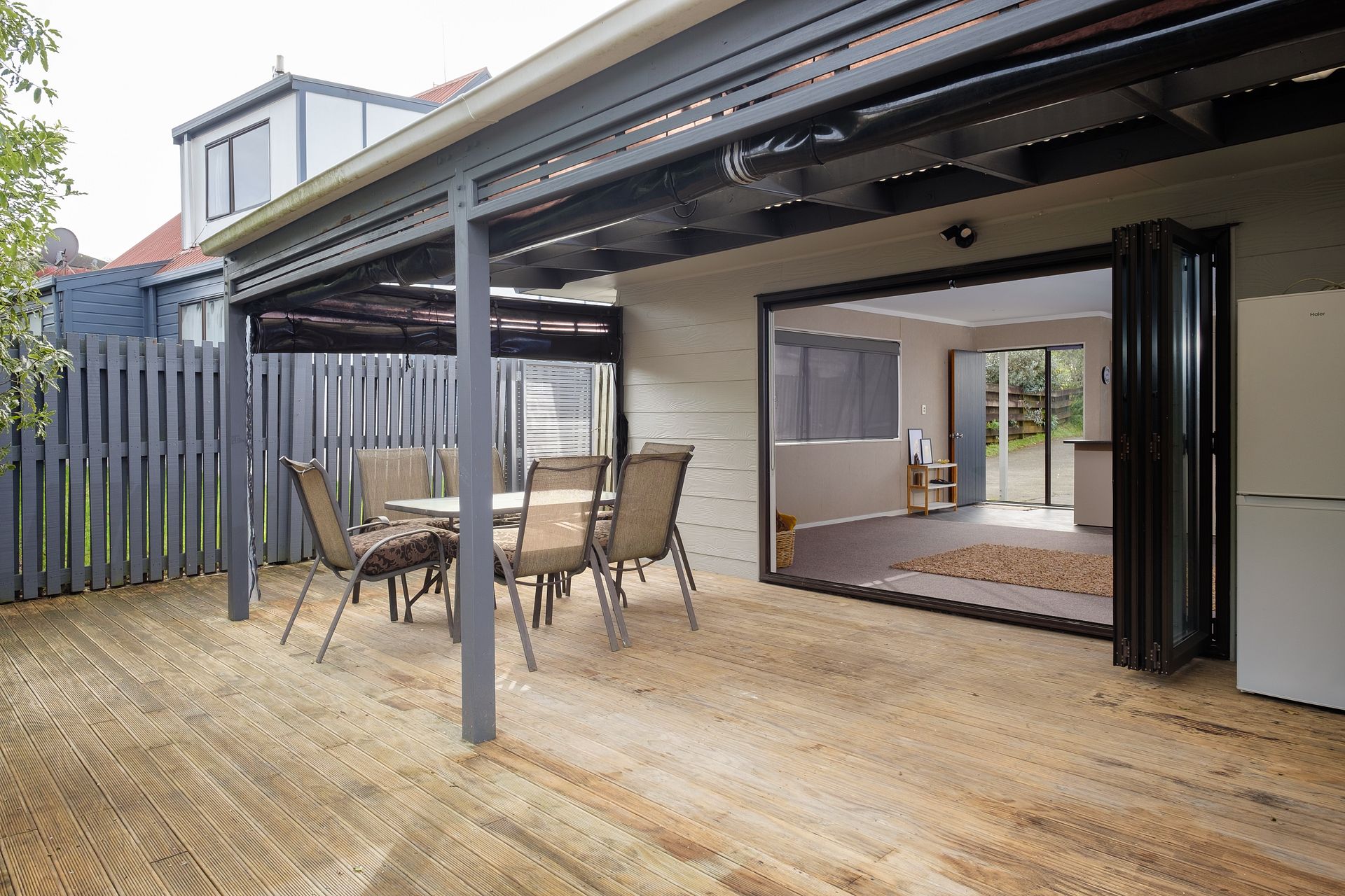 All weather entertainment area with very large deck off bifold doors from lounge. Very private with weather proof blinds on deck to draw down in wet or sunny weather.