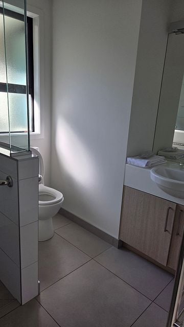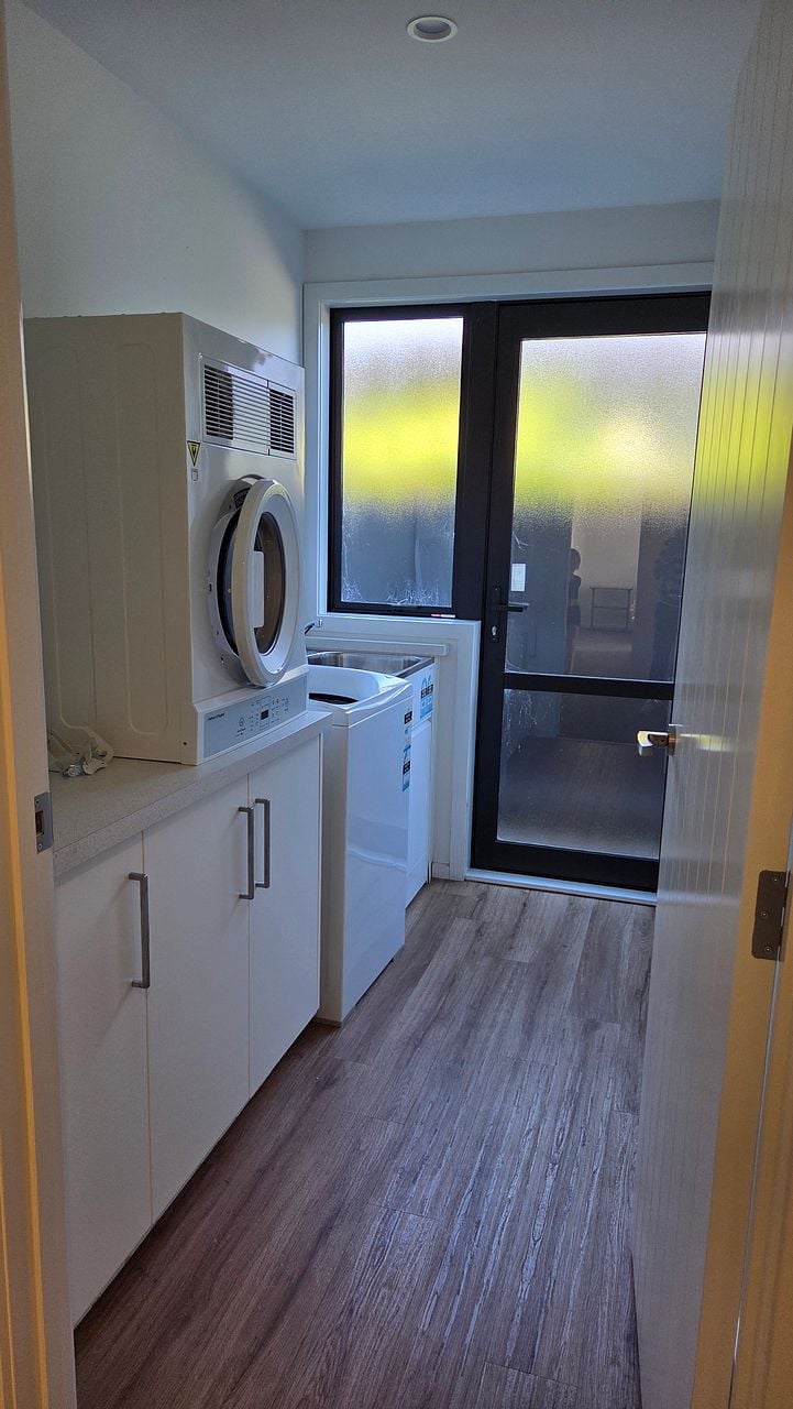 A separate laundry includes both washing machine and dryer for added ease.