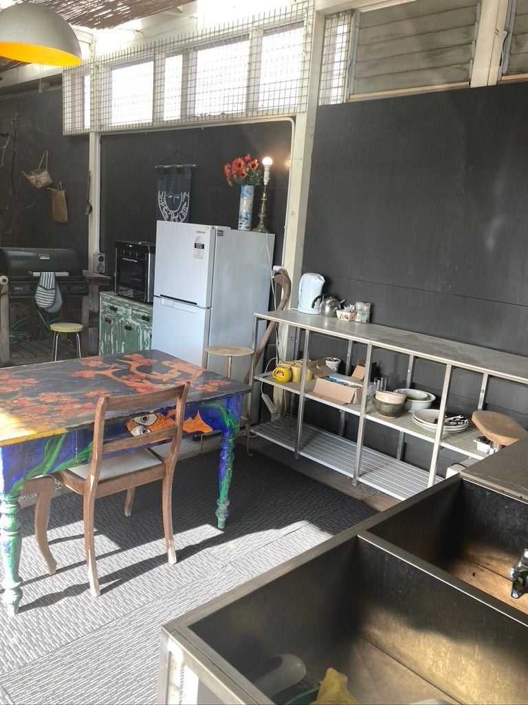 A huge fully enclosed indoor/outdoor Kitchen living space with cosy fire.