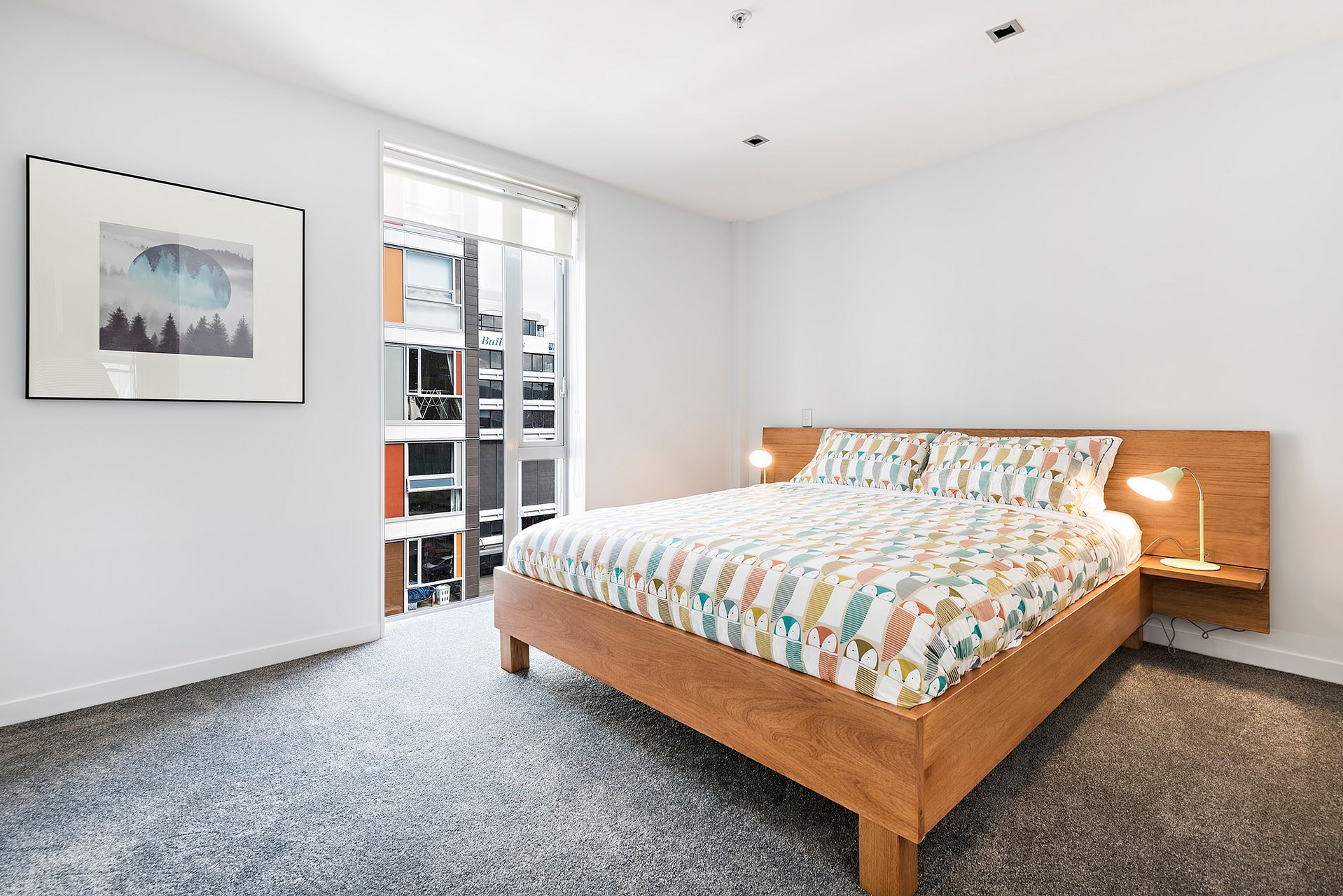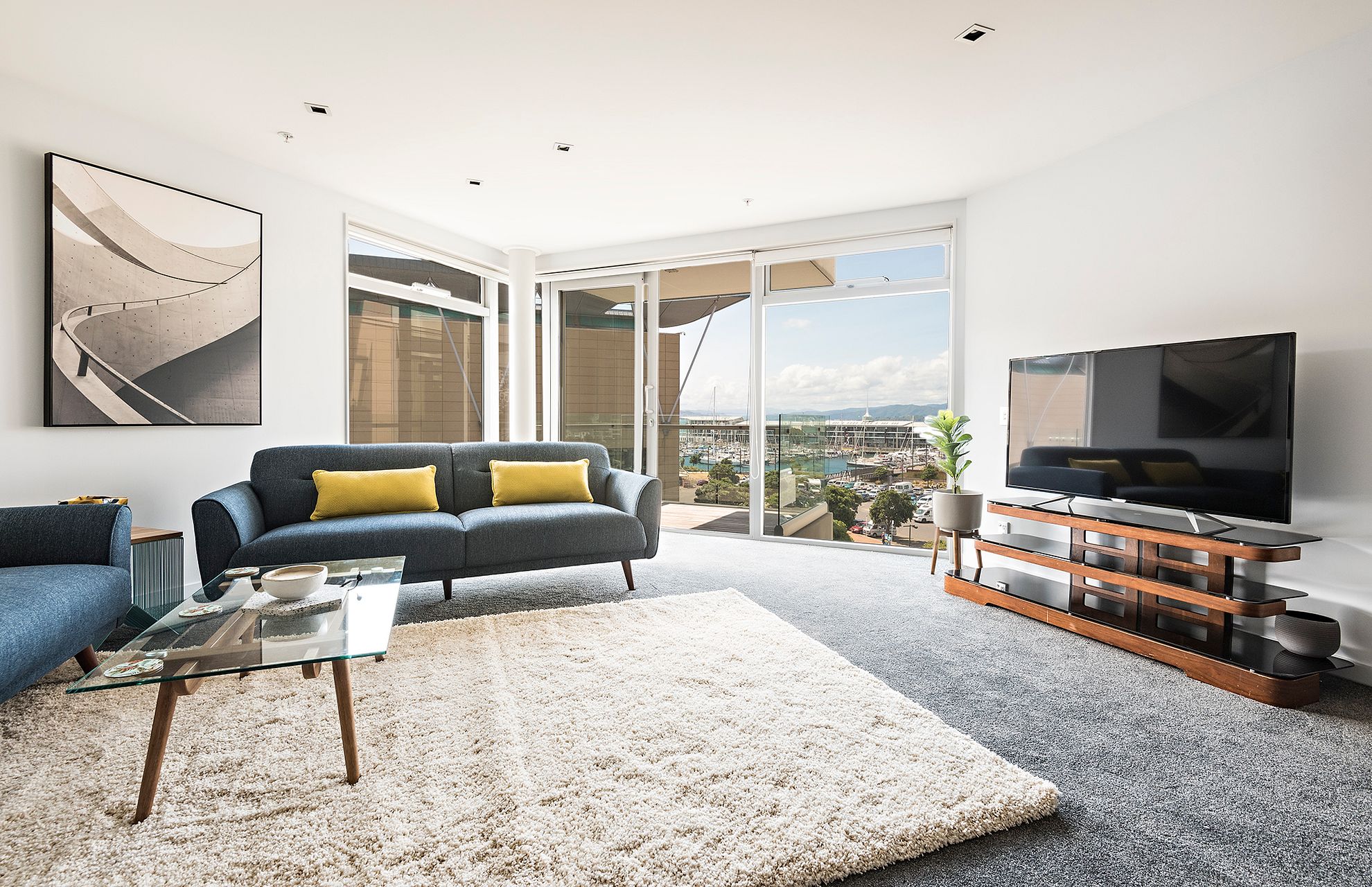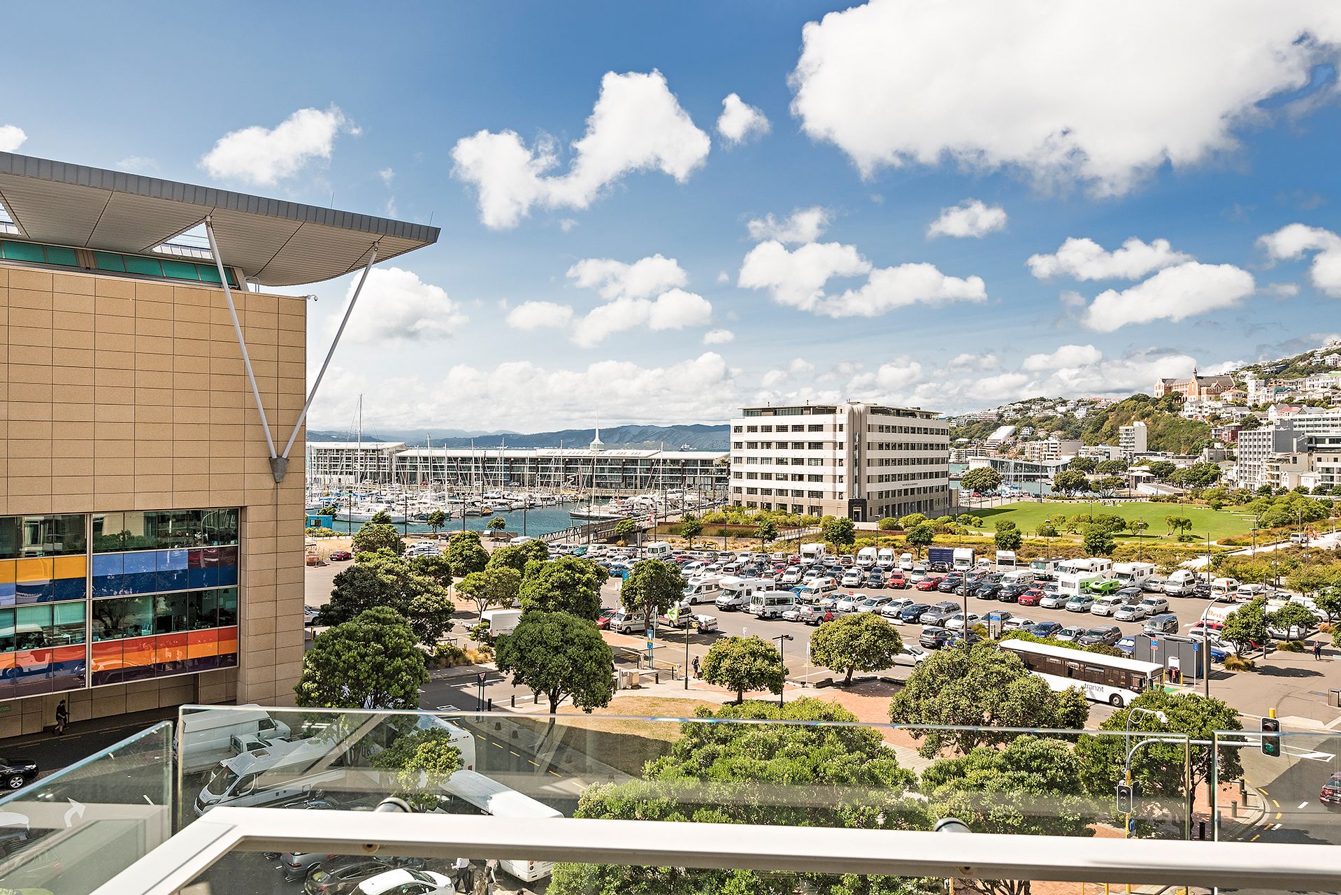 • Large floor-to-ceiling sliding glass doors lead out onto the balcony with stunning Wellington City views