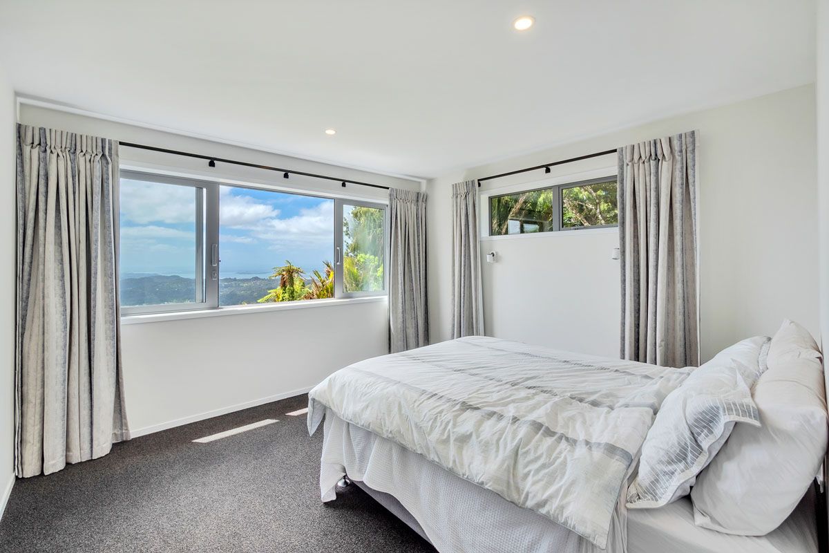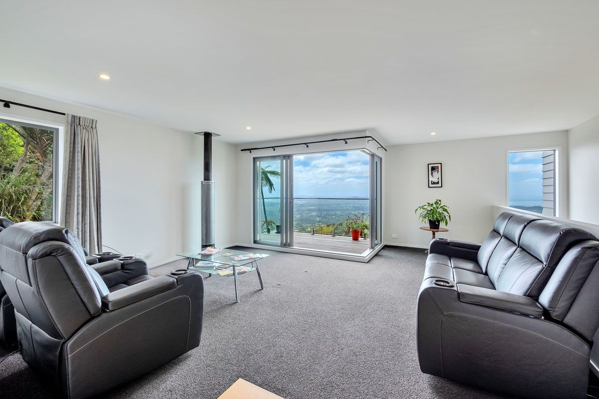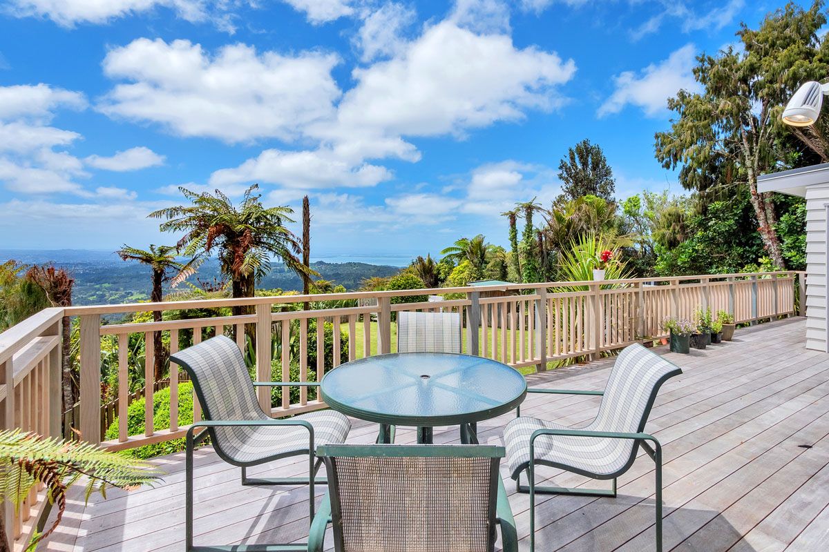 Set in the majestic tranquility of the Waitakere ranges, this four-bedroom home sits on its own hilltop with panoramic views from every room.
