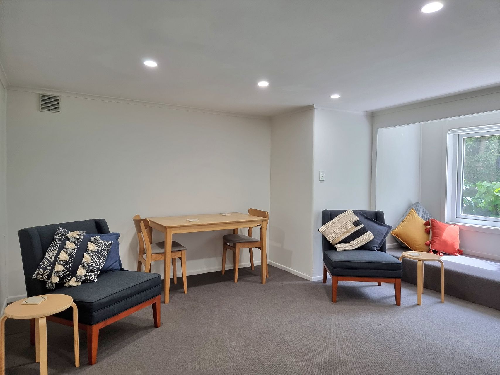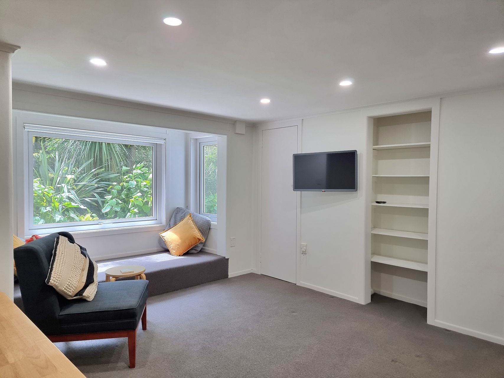 A sunny lounge with a bay window and pleasant garden outlook.