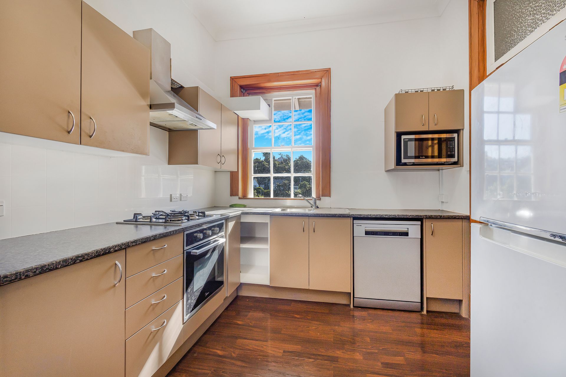The modern kitchen comes fully equipped with quality whiteware including a fridge/freezer, dishwasher, washing machine and dryer.