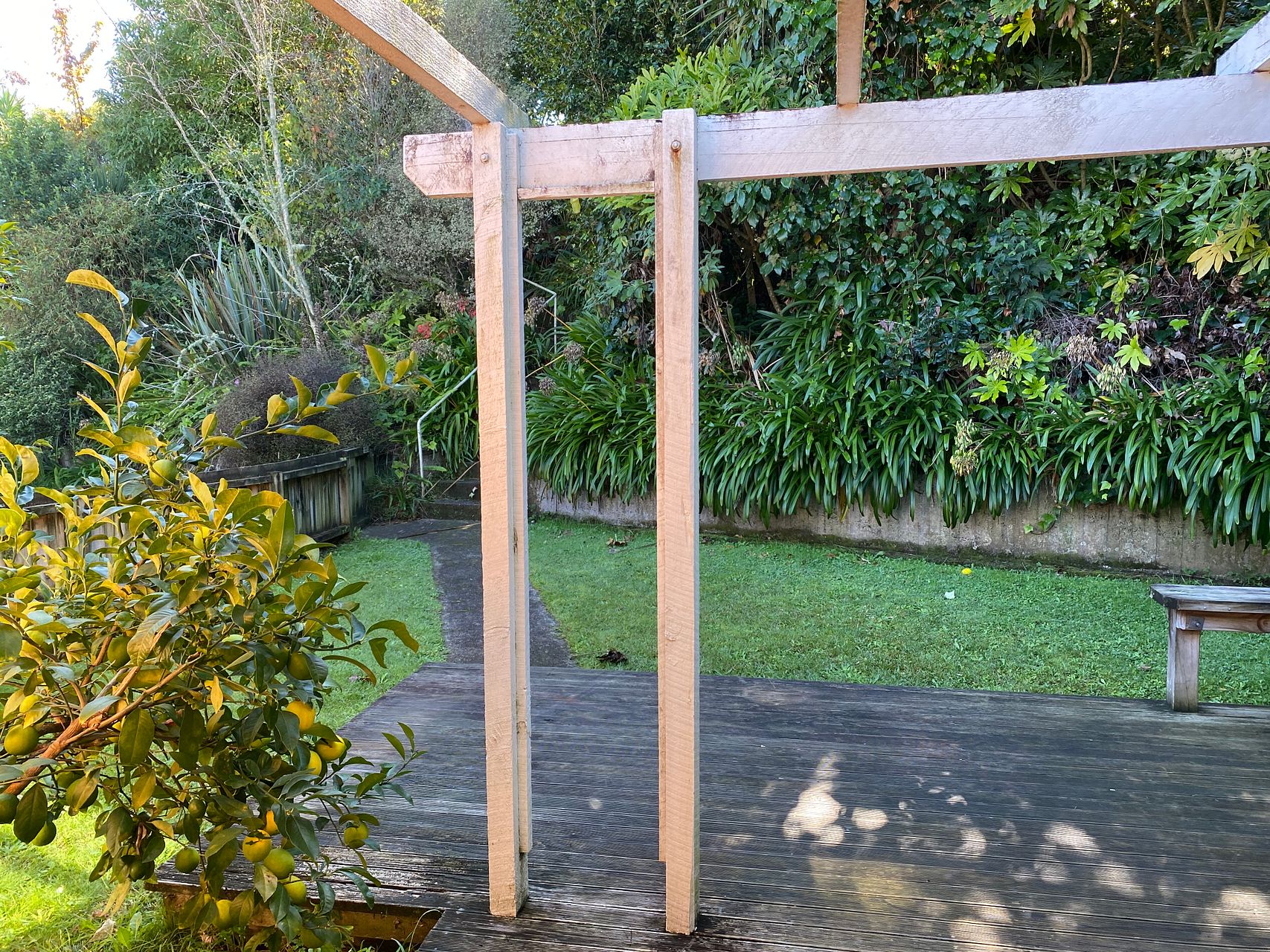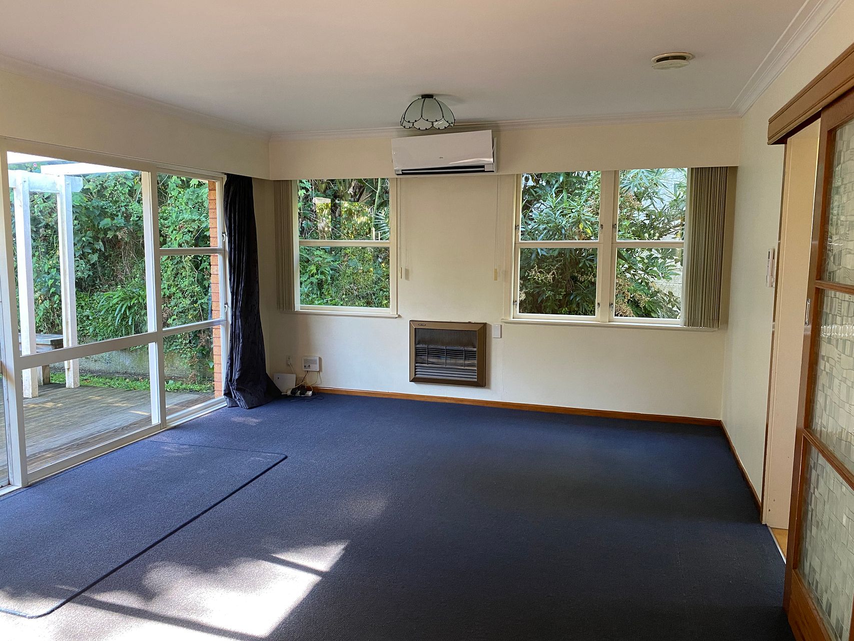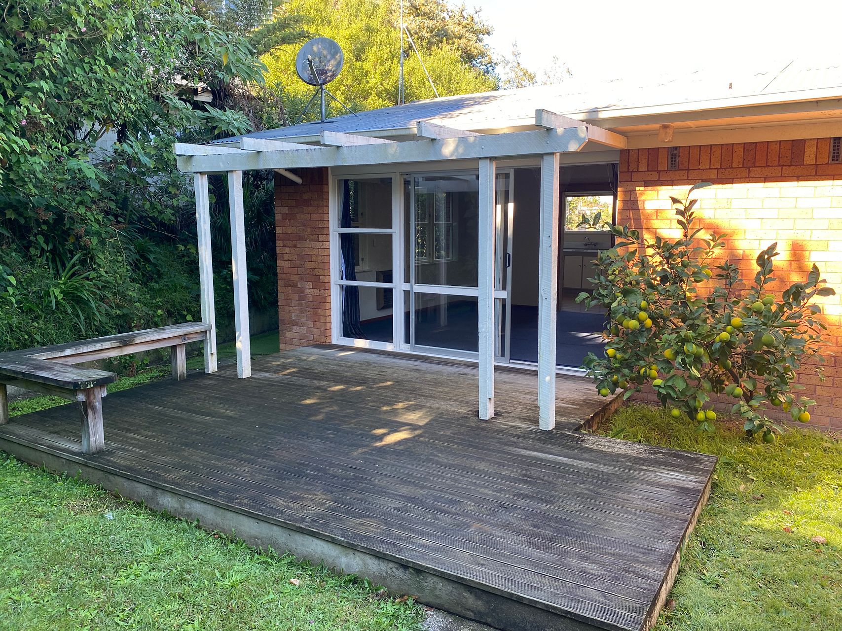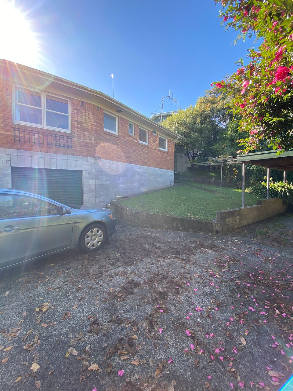Home is healthy homes compliant. It has a HRV system and a heat pump in the living area. There is a north facing wooden deck off the living room (deck roof now covered with clear corrugated polycarbonate not shown in photo). Below the home is a single garage with automatic door (no internal access) and a covered carport. House is not fully fenced. Therefore not suitable for dogs.