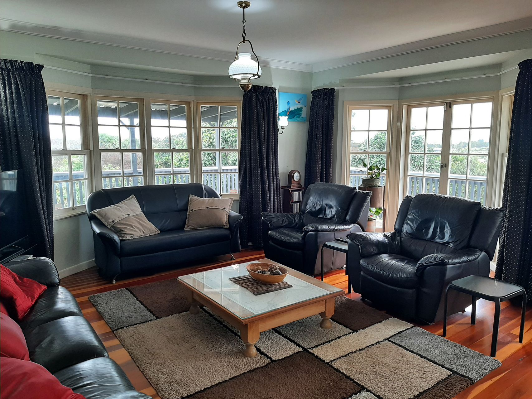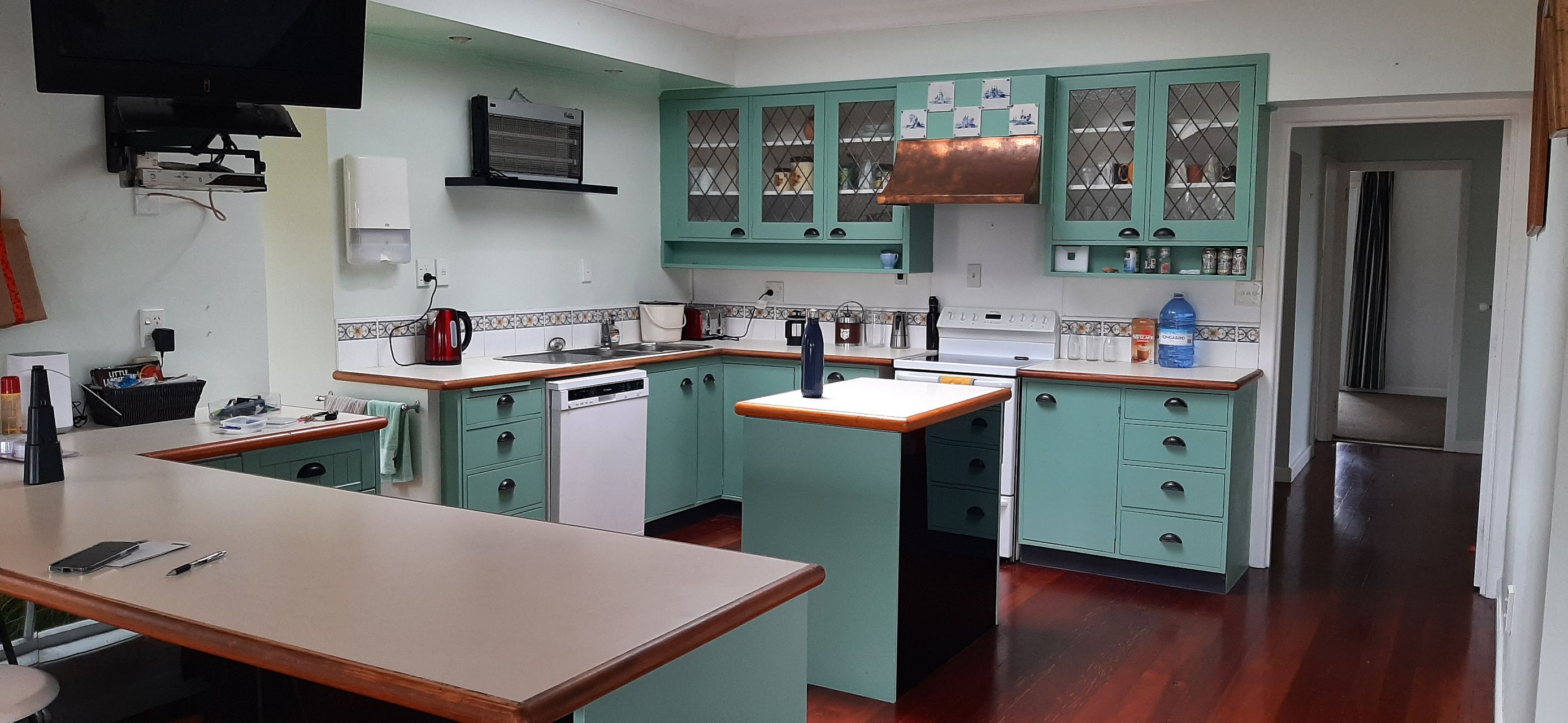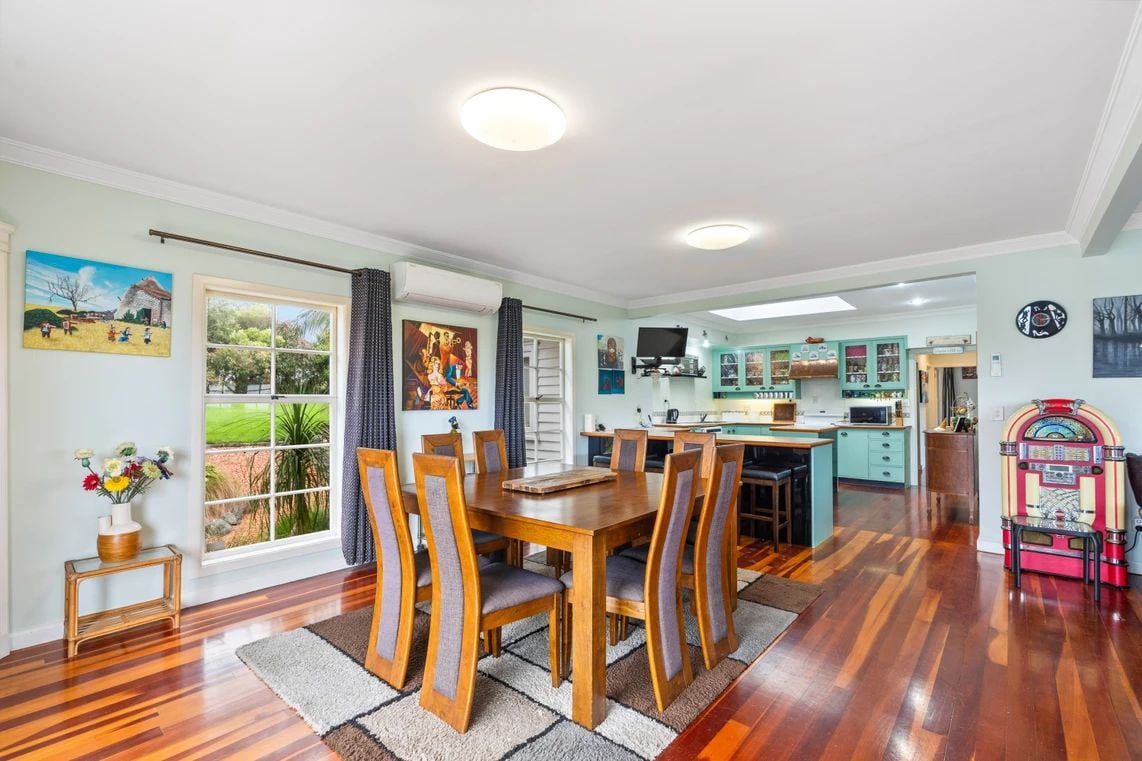 Large functional country style kitchen, open plan living and dining, which opens out onto wrap around deck.