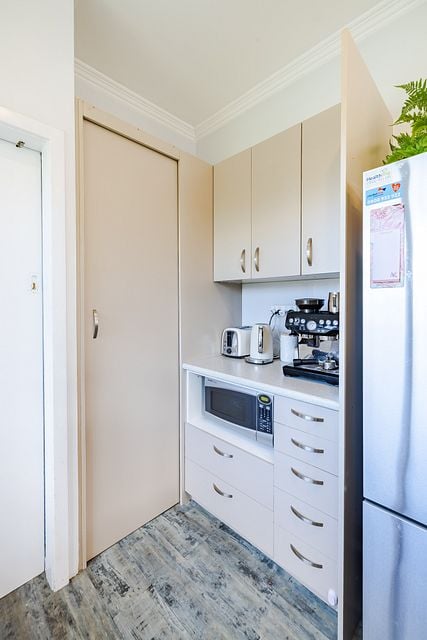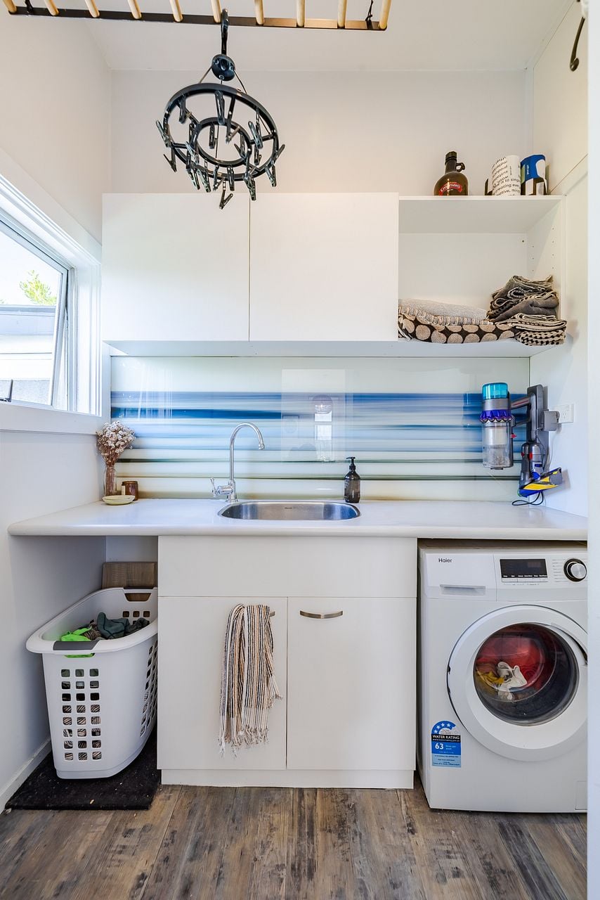 Fridge/freezer, washing machine, dishwasher, and microwave.