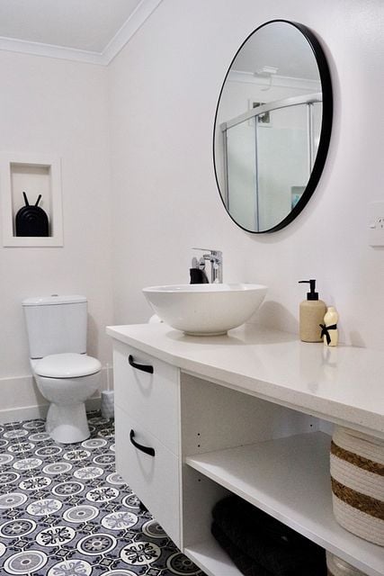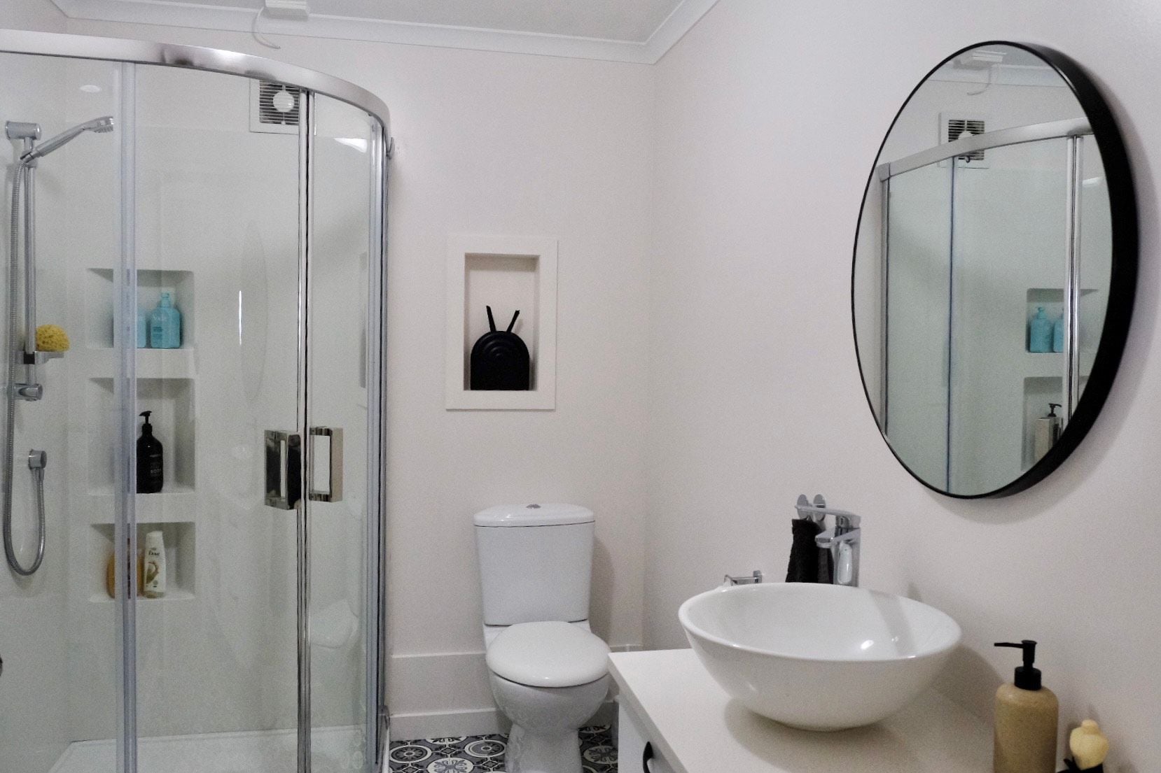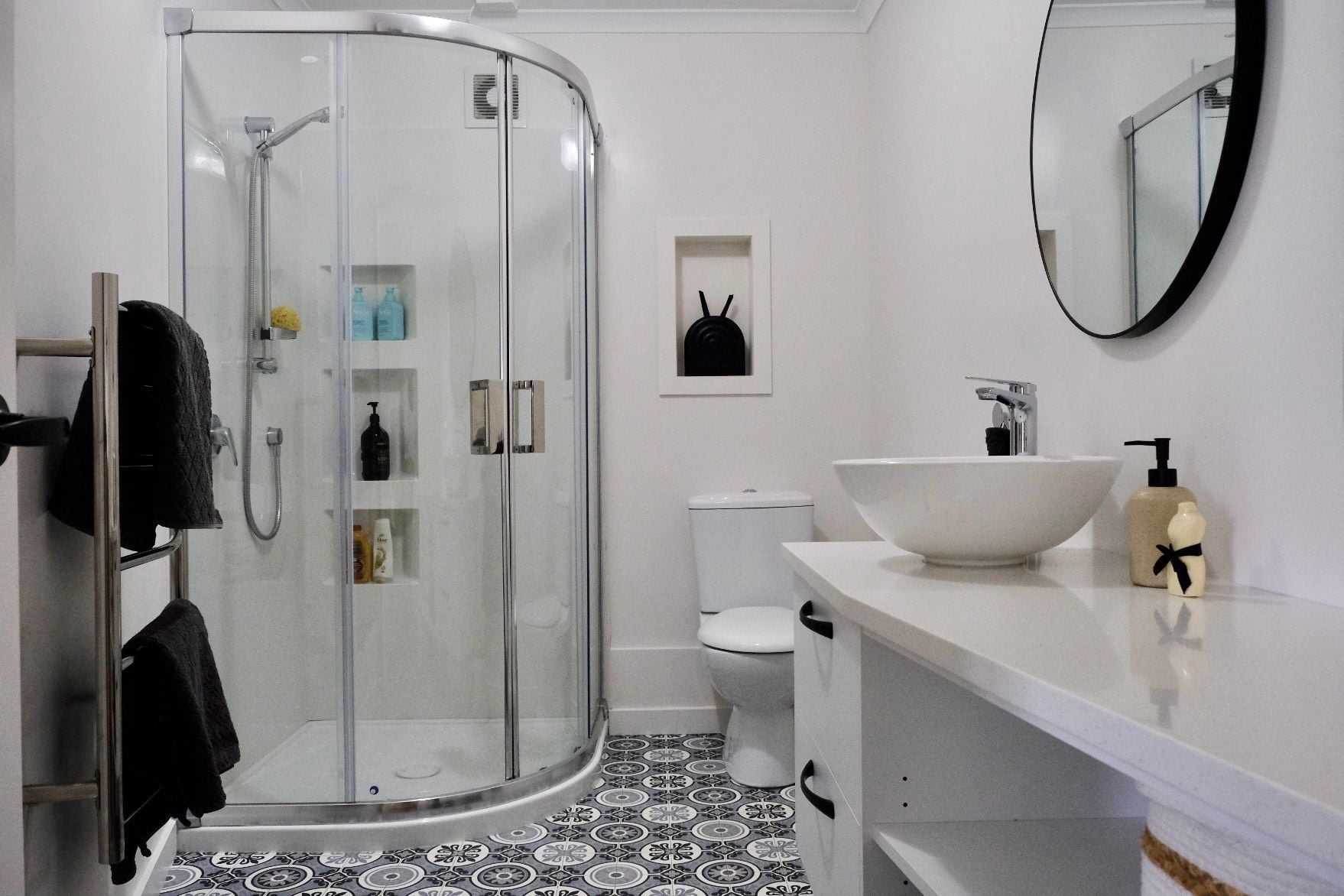 The bathroom has a shower with good water pressure, a generous vanity with storage below, a heated towel rail, extractor fan and mirror and toilet.
