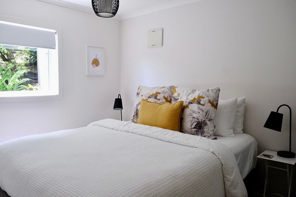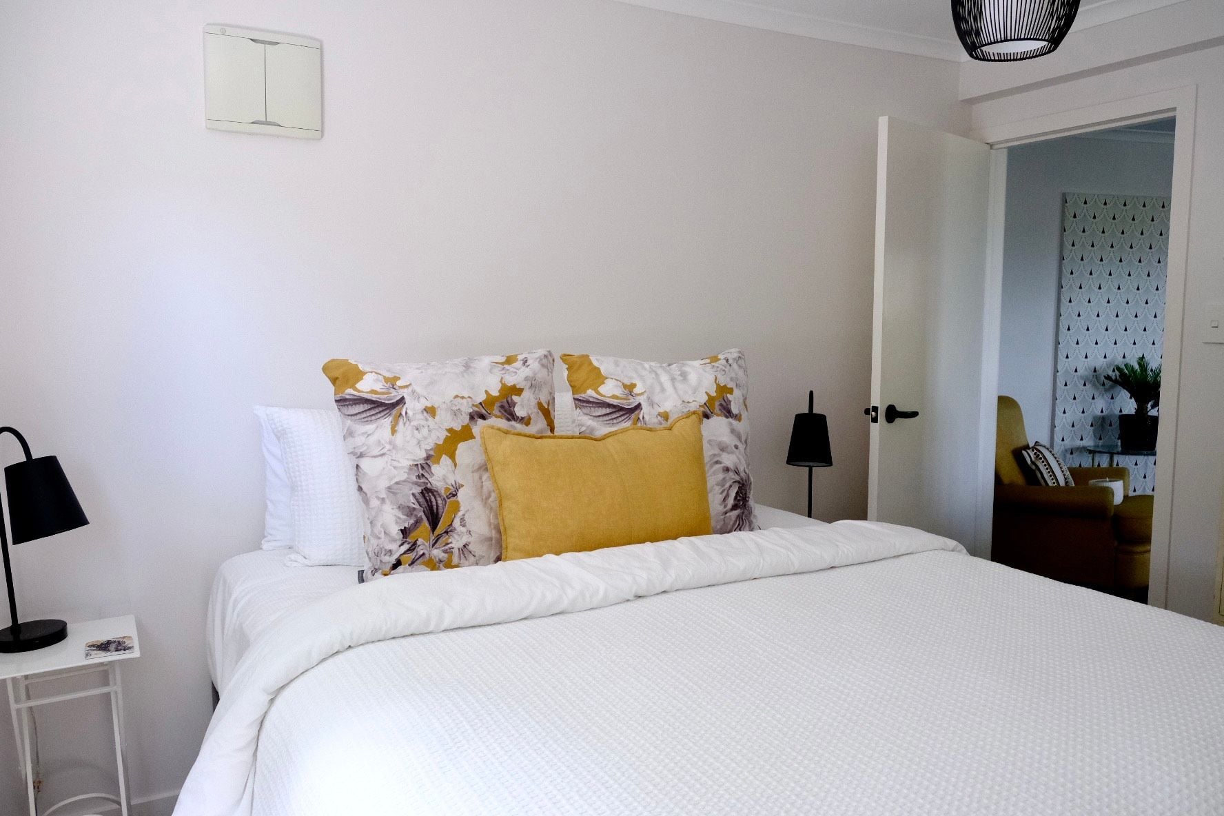 The bedroom has a very comfortable king bed, a wardrobe and another storage cupboard, chest of drawers, bedside tables and bedside lights.