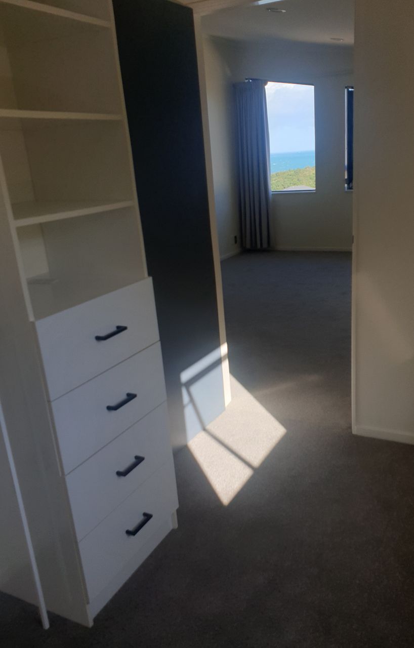 -- Take the stairs up to the large master bedroom which has a generous walk-in wardrobe, ensuite with shower, toilet, vanity, heated towel rail and extractor fan. There are sea views from the bedroom and also from the loo if you open the glazed window :-)