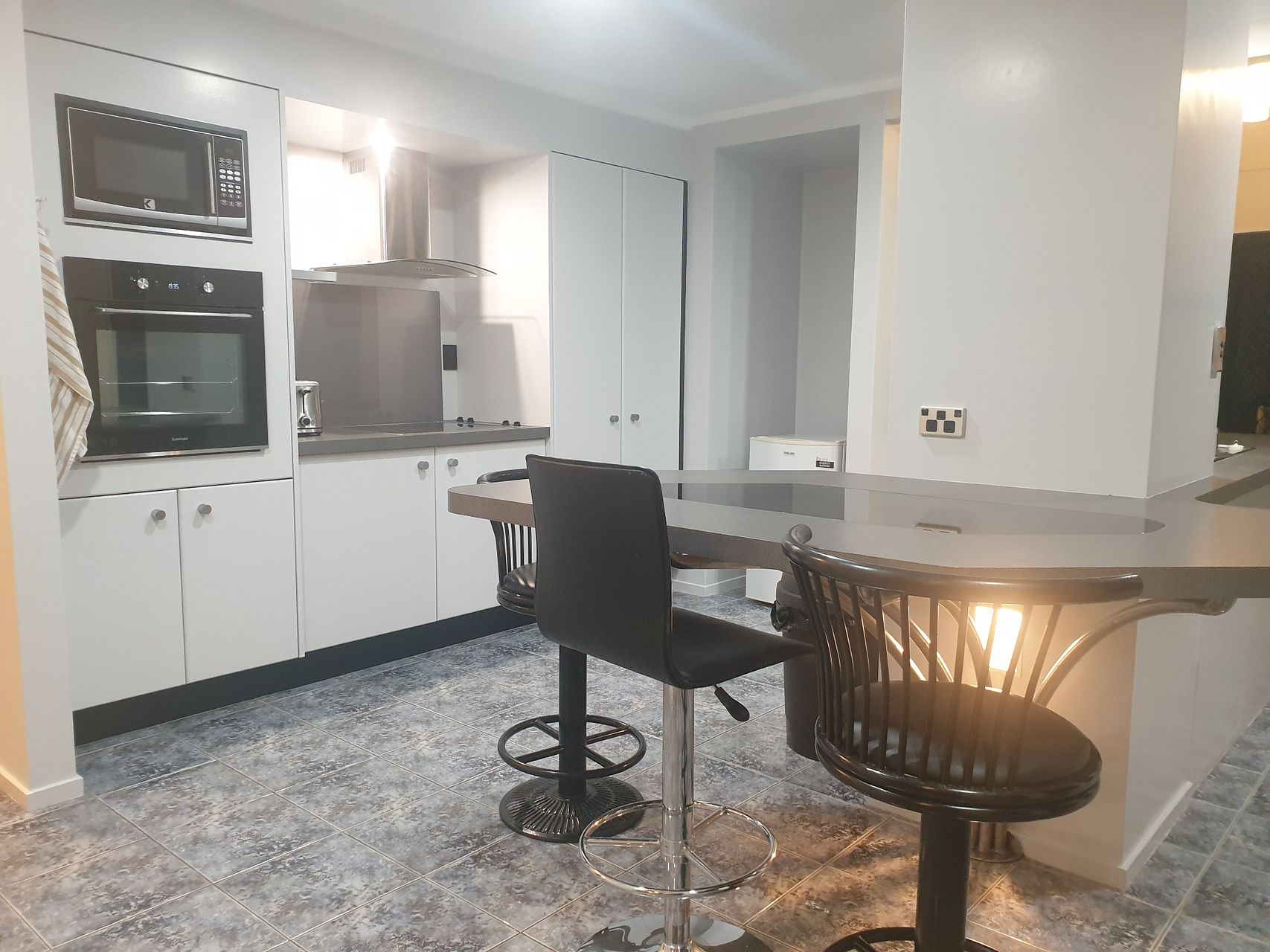 -- Downstairs the kitchen features a breakfast bar/table, dishwasher, hob, rangehood & built in oven with a tiled floor.