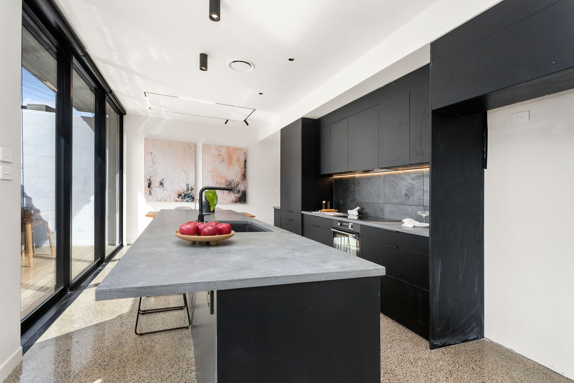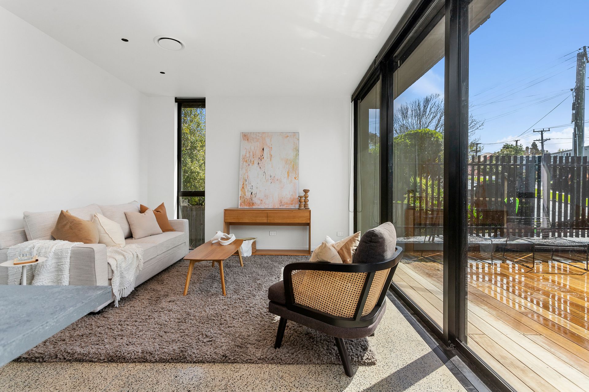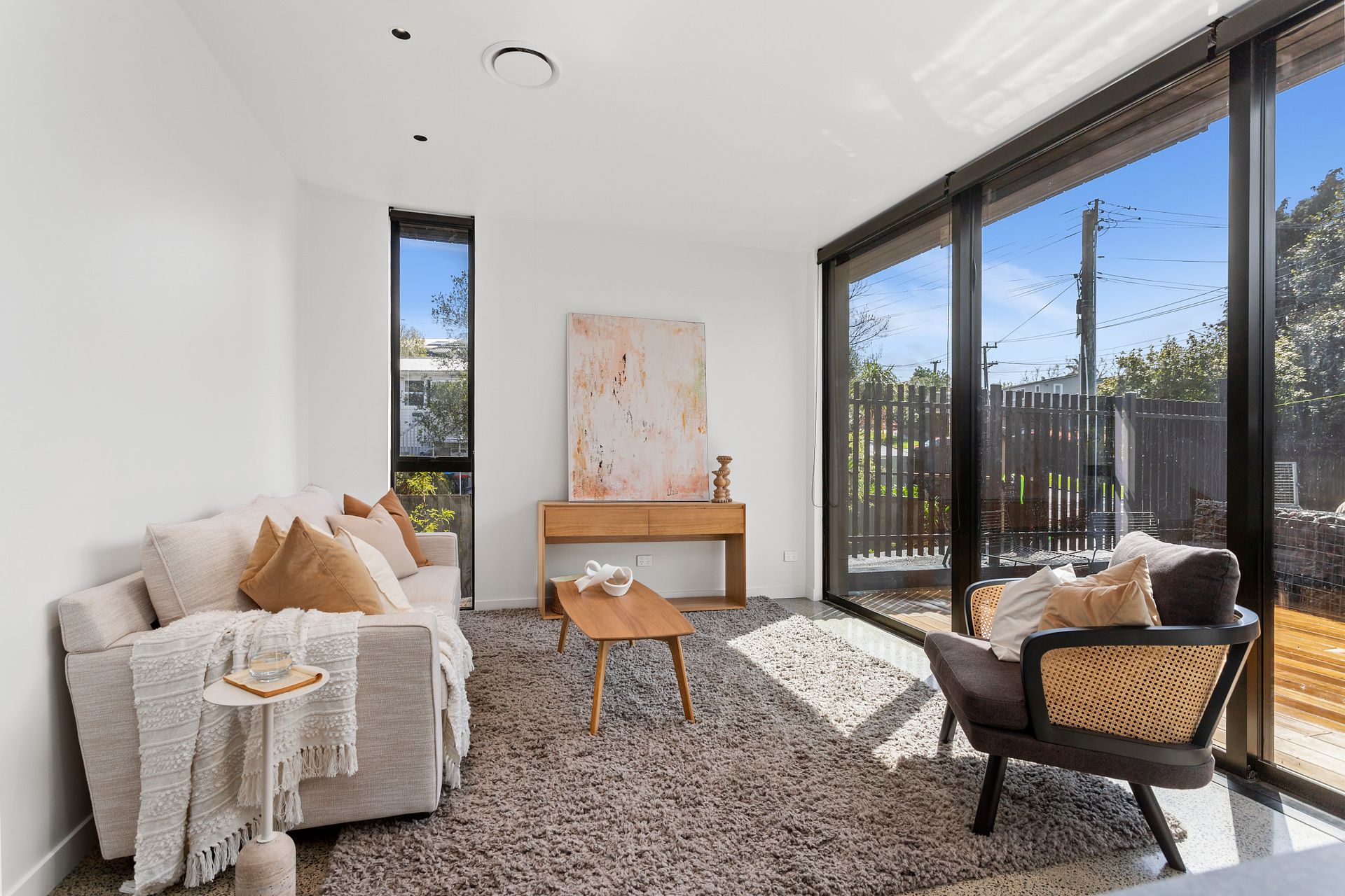 Enter through a stunning green marble clad entrance to the open-plan north facing living, dining, and kitchen area complete with brand new appliances, high ceilings, and polished concrete floors. Step out through the full height glass sliders onto the north-facing deck and take in the beautiful indoor/outdoor living experience.
