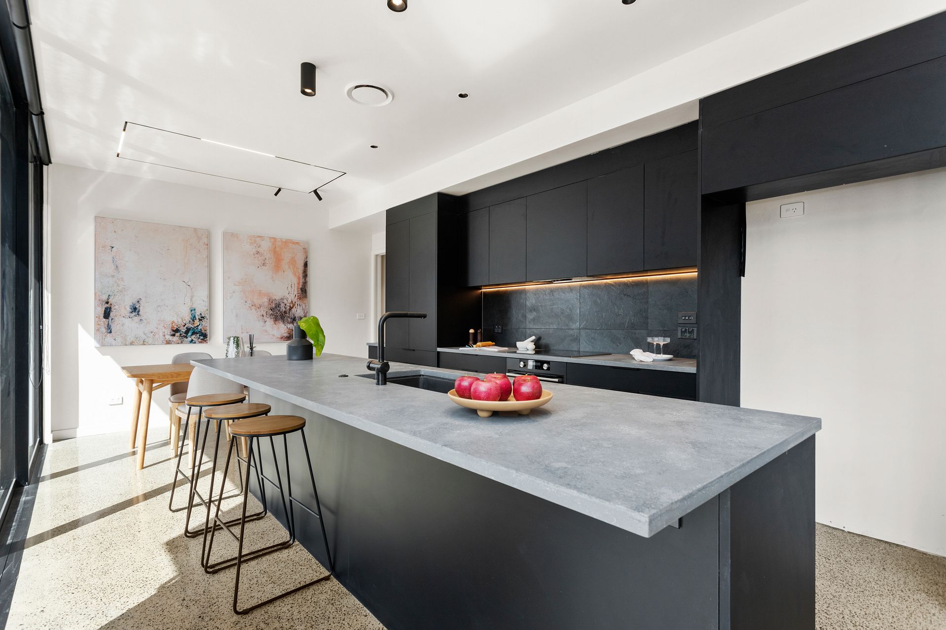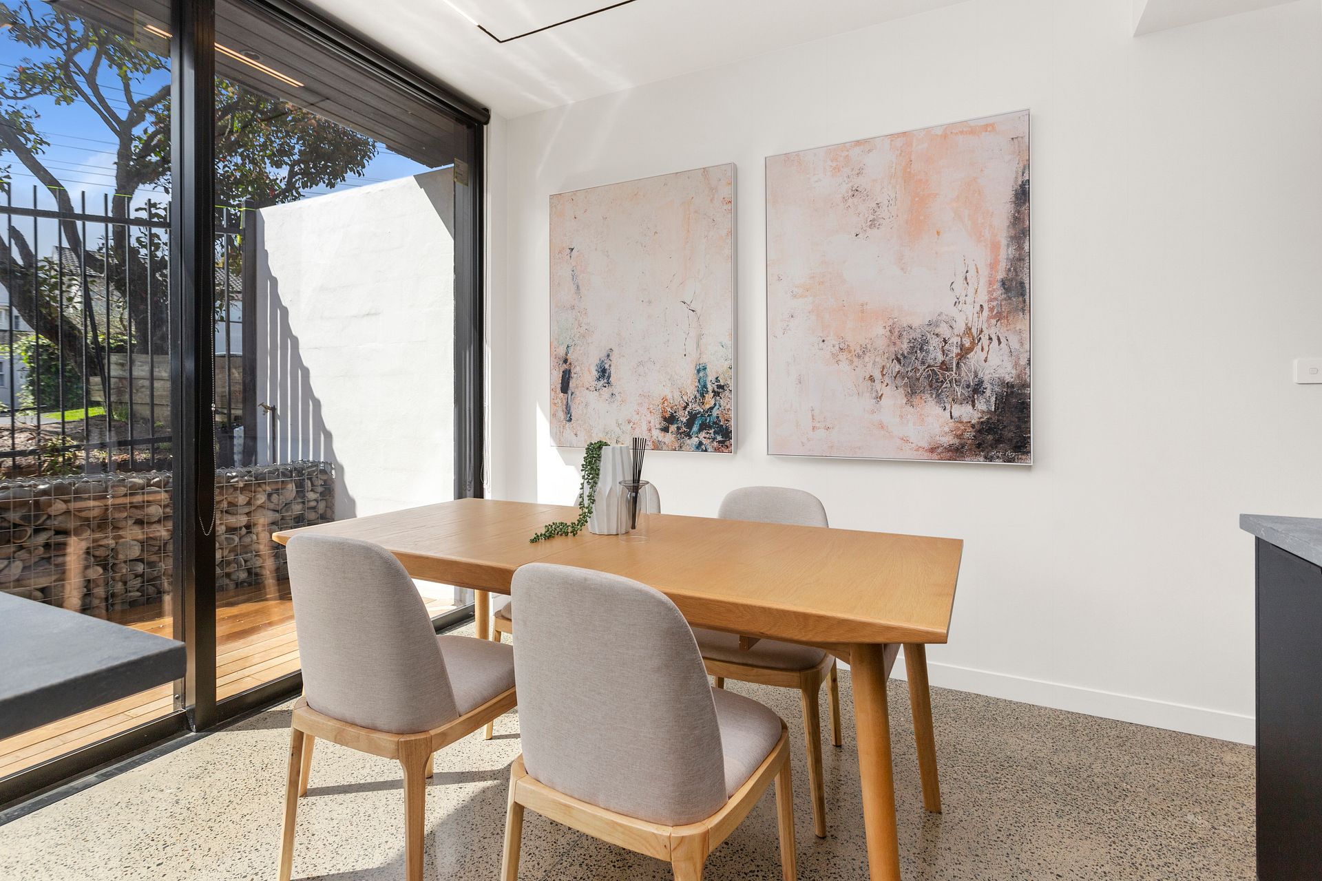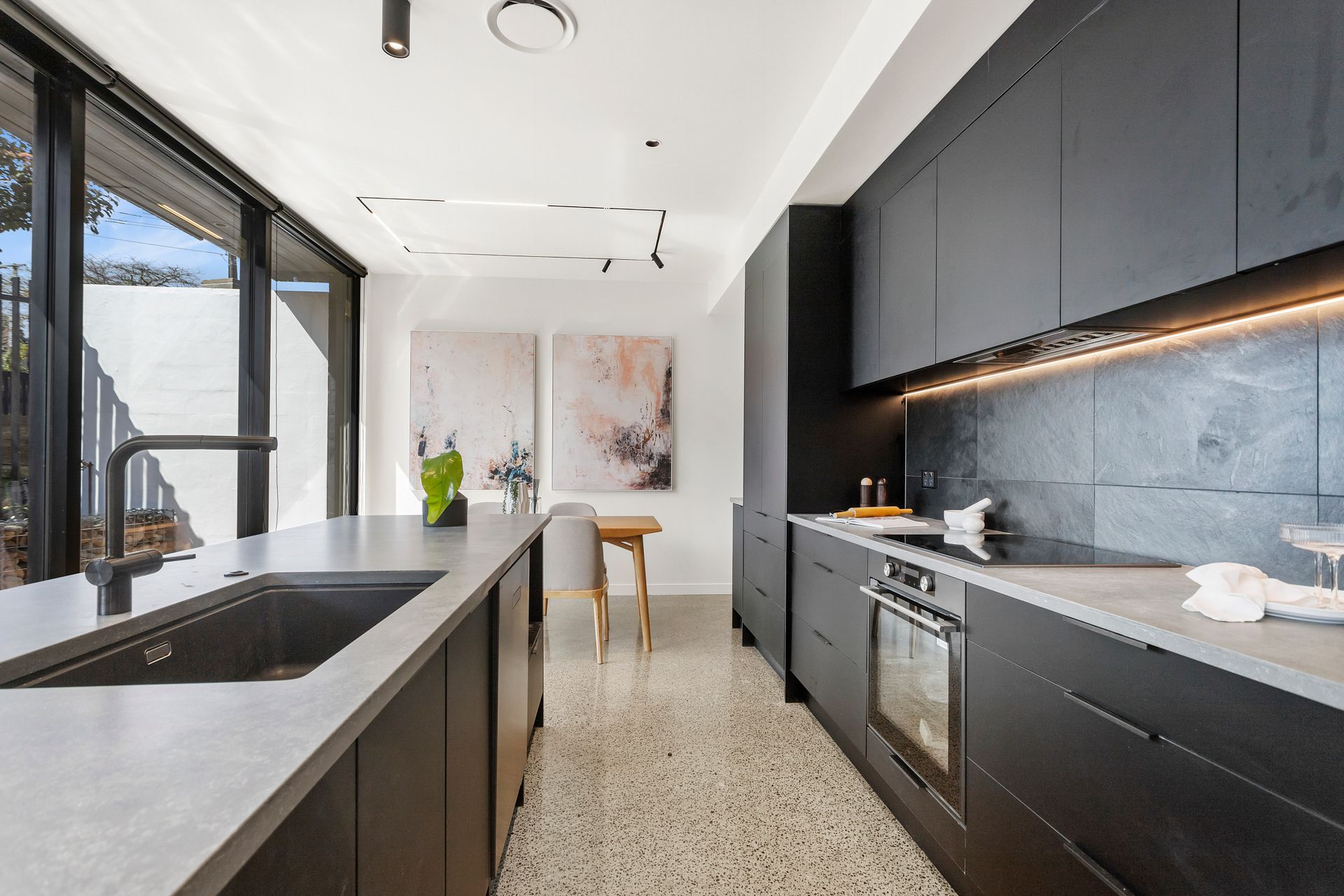 Enter through a stunning green marble clad entrance to the open-plan north facing living, dining, and kitchen area complete with brand new appliances, high ceilings, and polished concrete floors. Step out through the full height glass sliders onto the north-facing deck and take in the beautiful indoor/outdoor living experience.