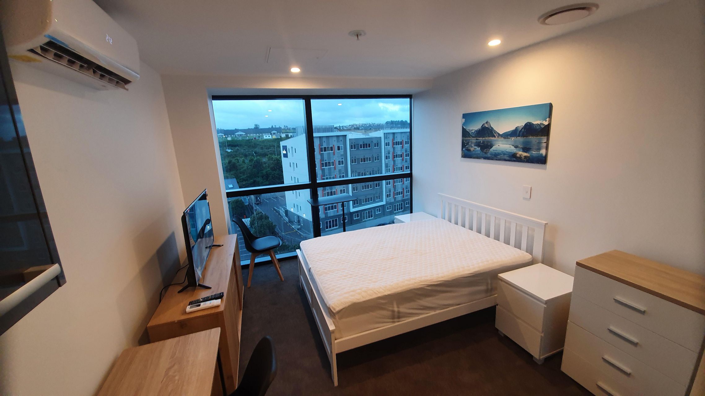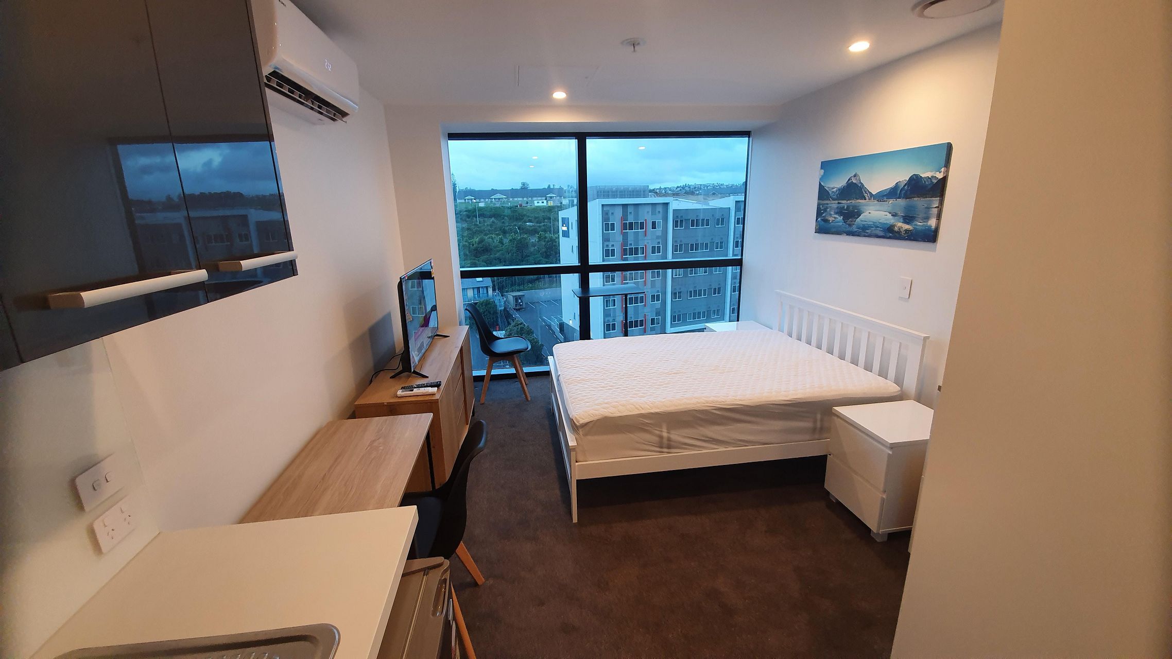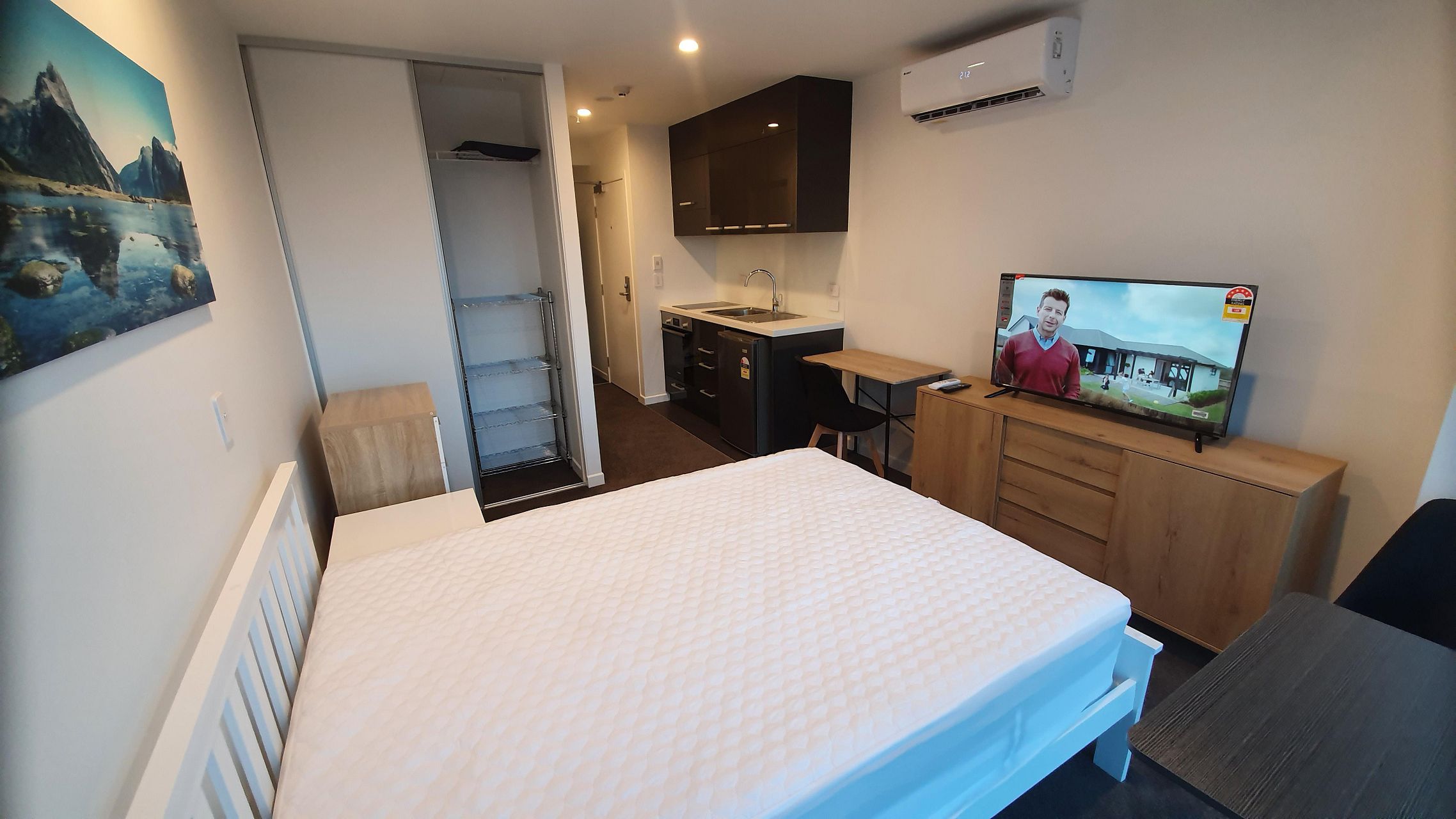 The brand new Studio apartment is fully furnished with a brand new deluxe double-sized bed, matching bedside cabinets, tallboy 4 drawers, a 40" smart tv, buffet unit, and more.