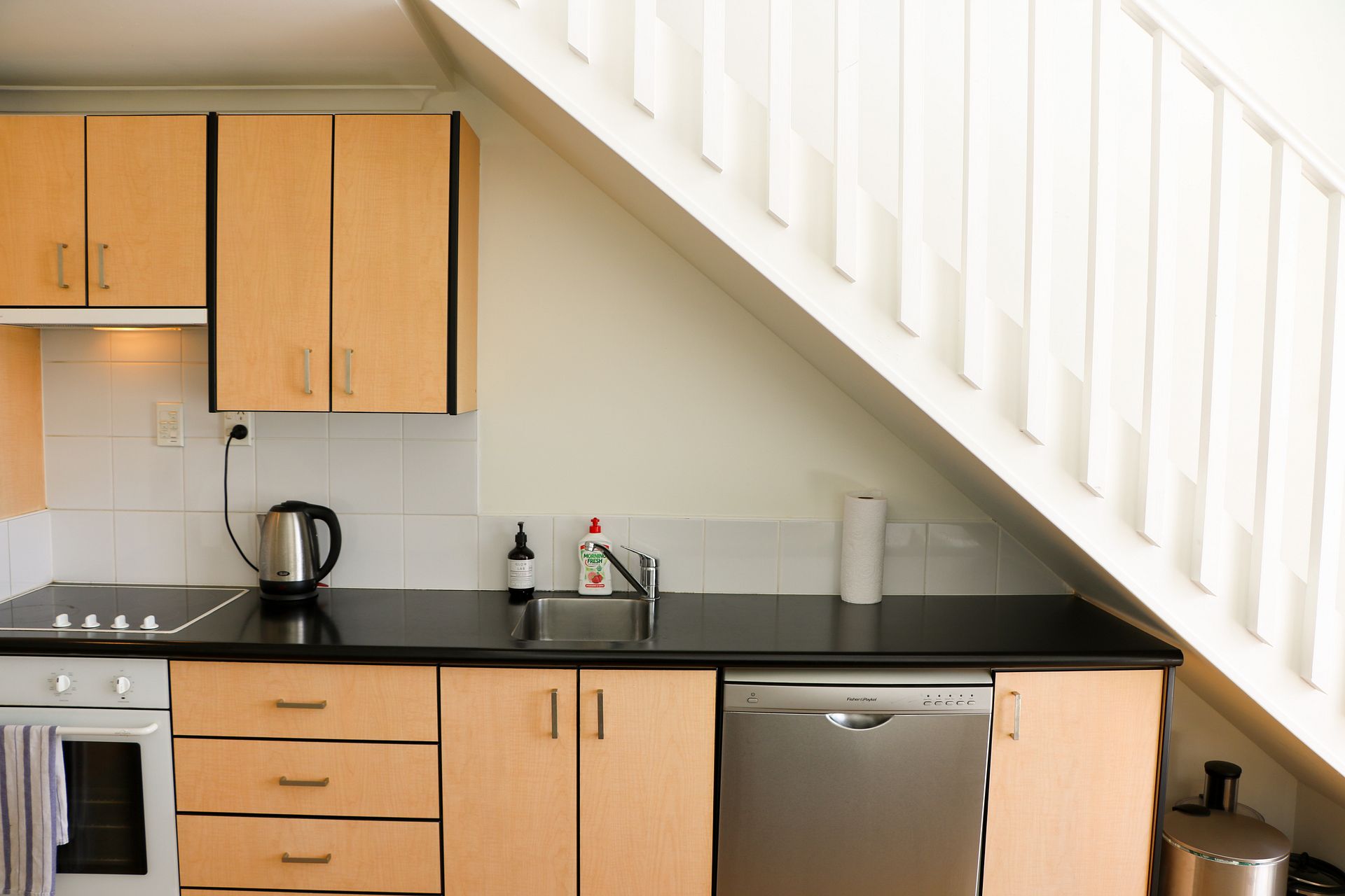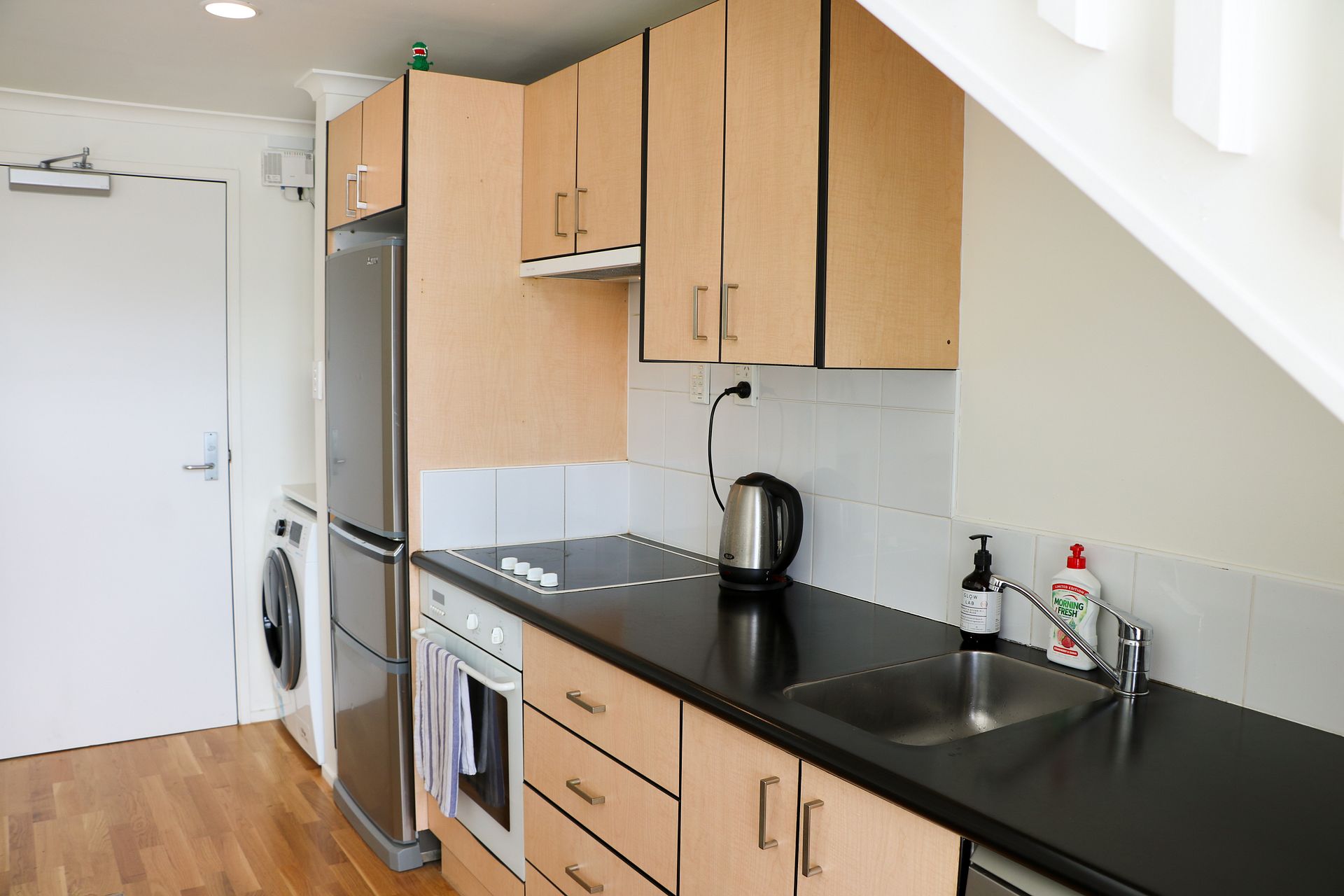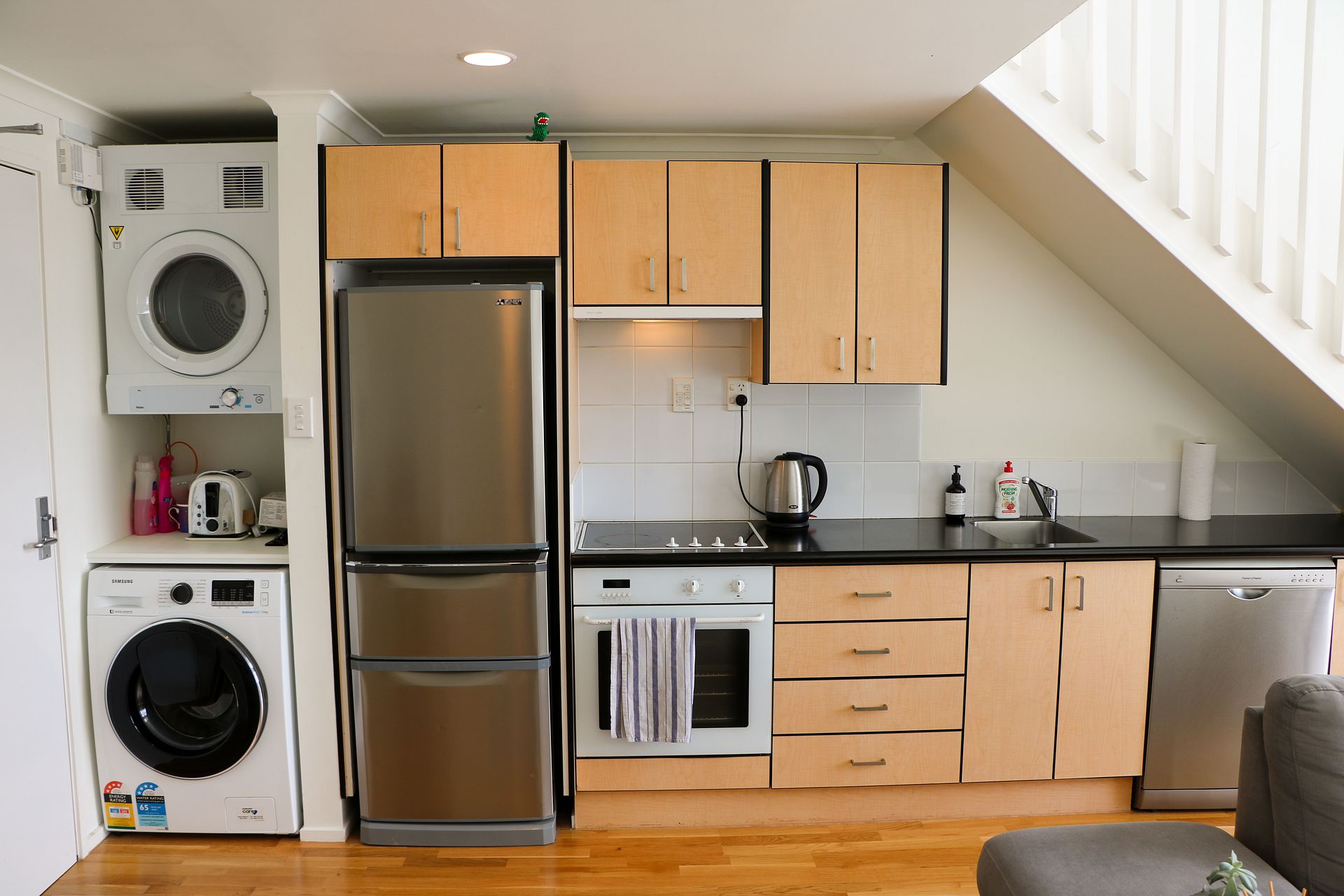 The downstairs living area is complete with modern appliances, new wood flooring and carpet.