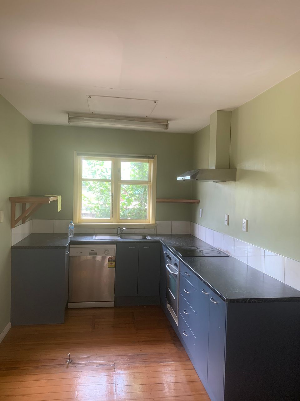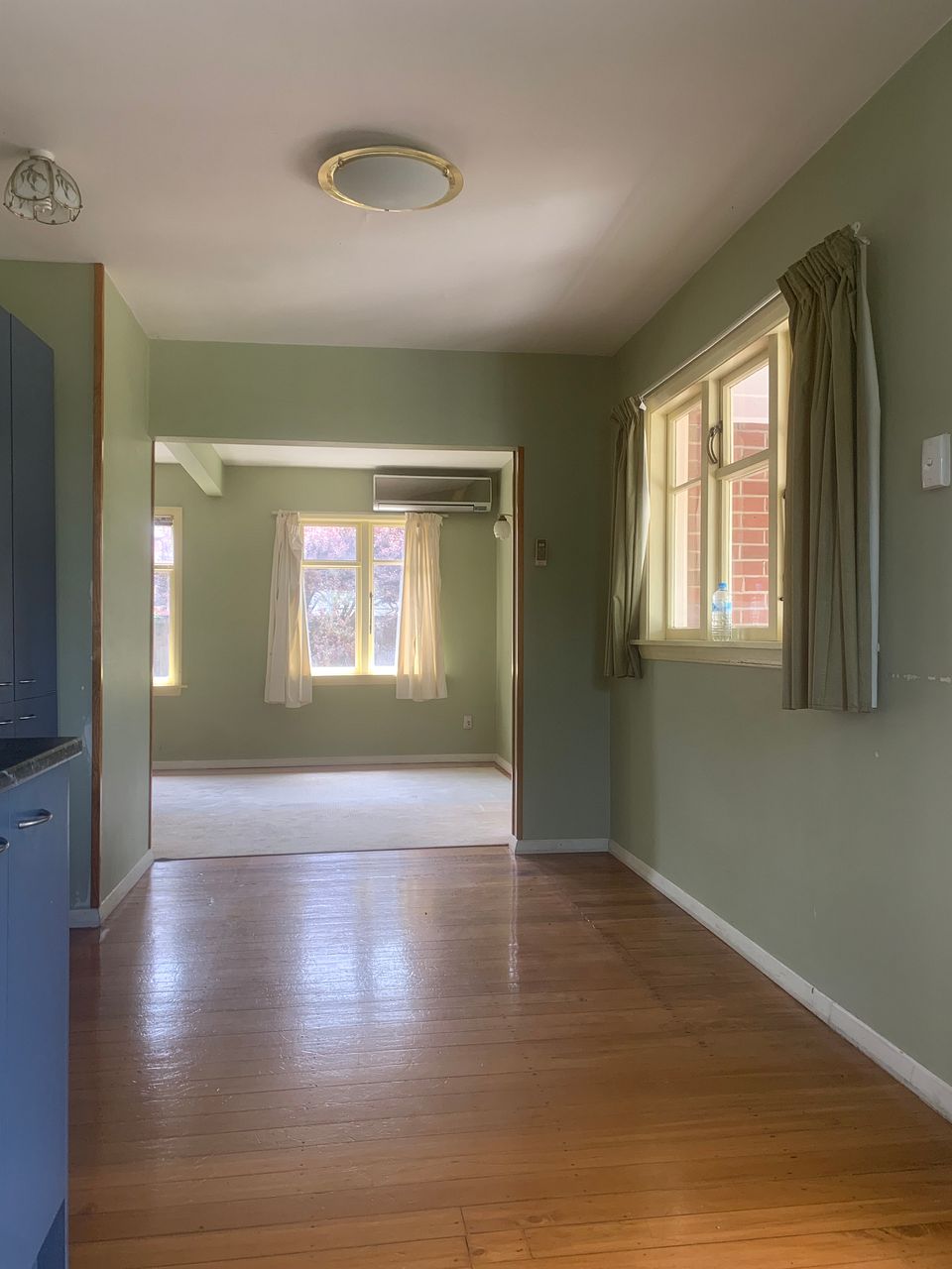 Modern kitchen with open plan living and dining area. The heat pump in the living area will keep you warm in winter and cool in summer.