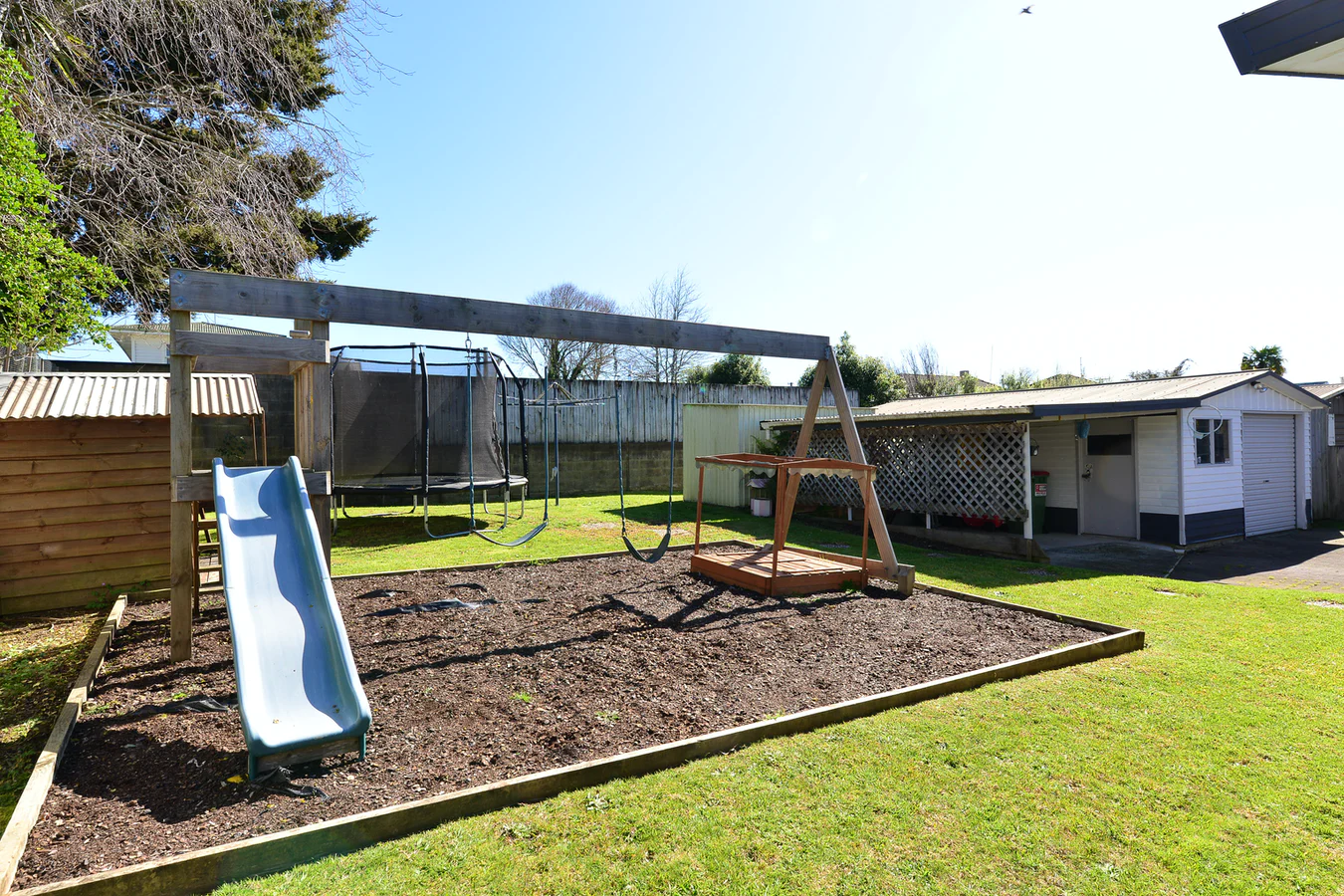 Fully fenced section perfect for keeping kids safely contained, the spacious backyard features a playground and playhouse. Outdoor garden shed can keep all your garden tools out of sight and secure and a wood shed for extra storage.