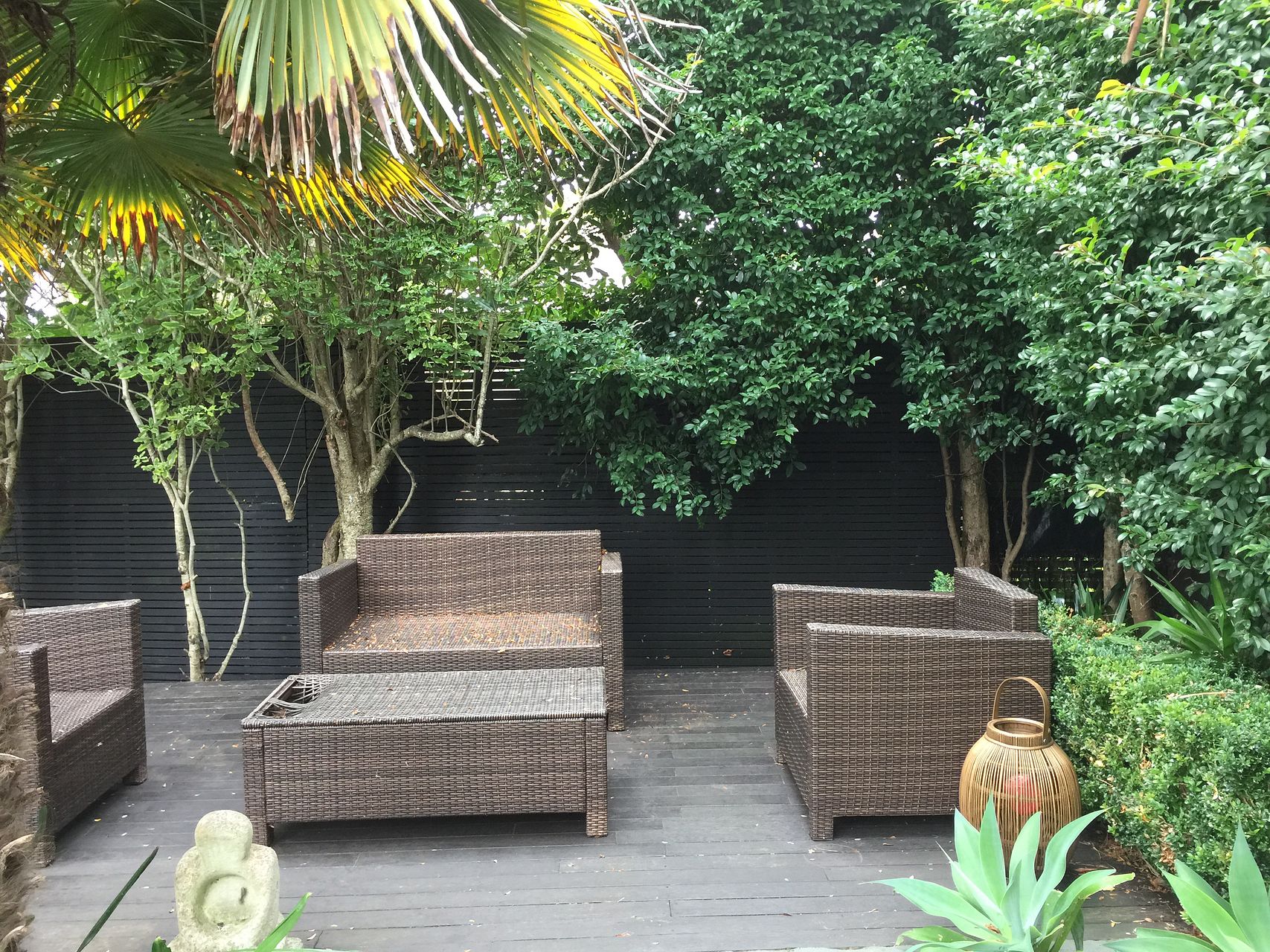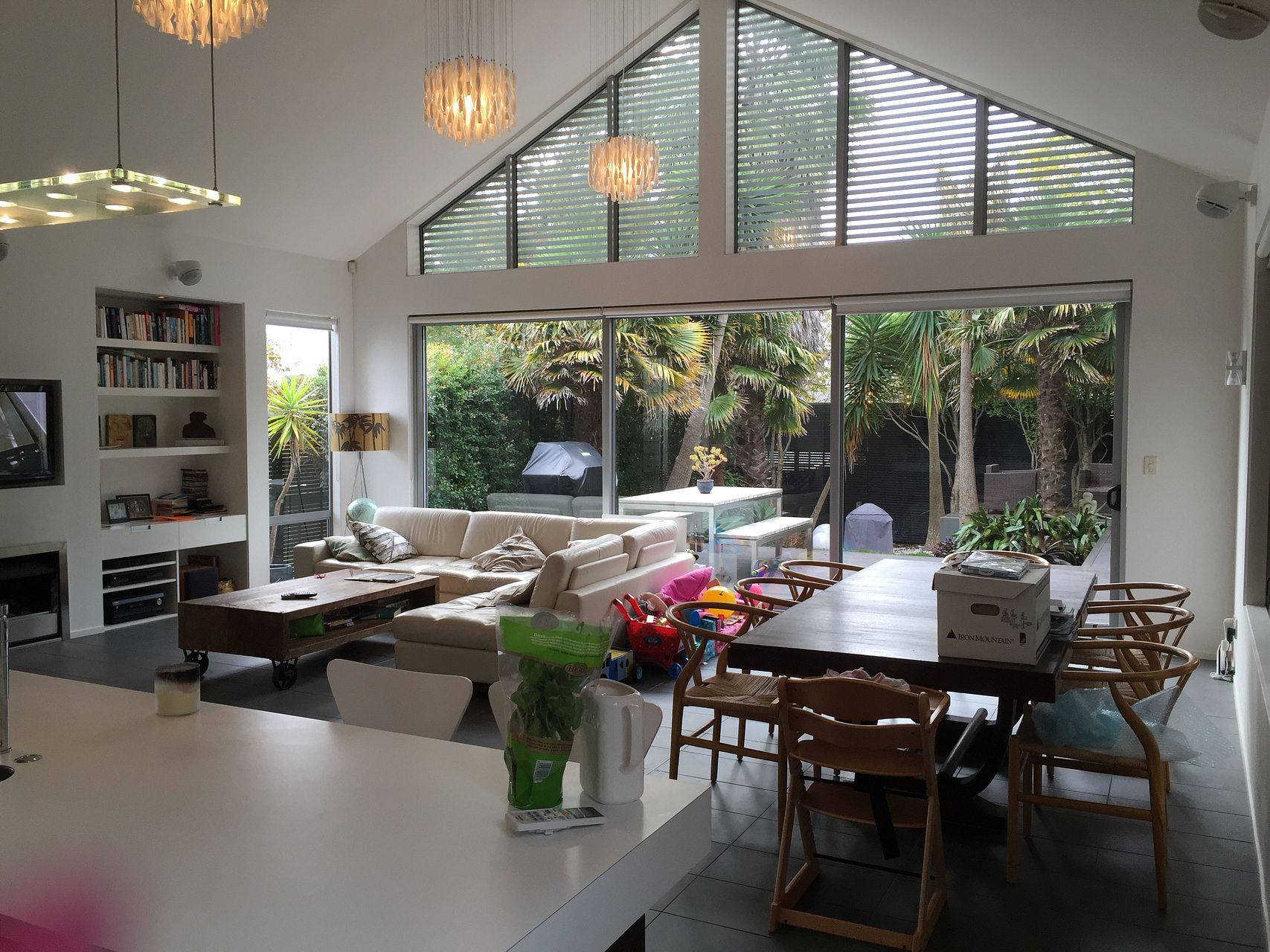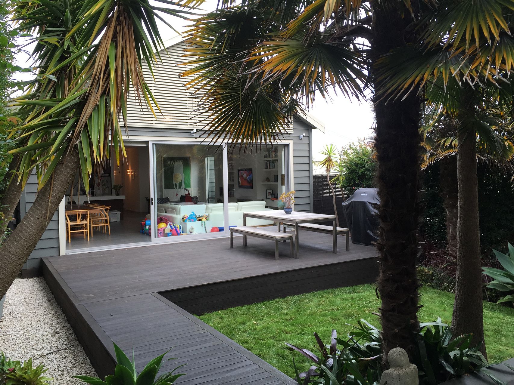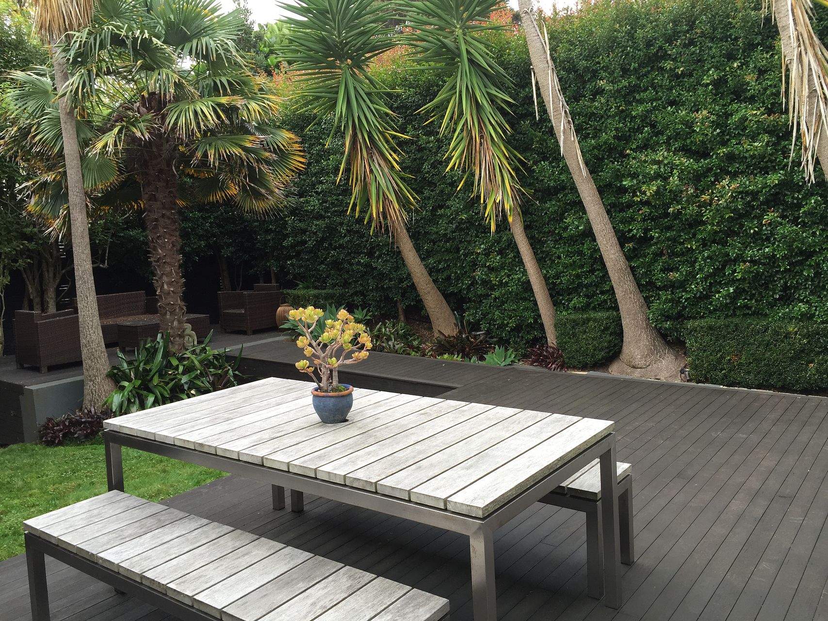 The north facing DECK off the large dining area overlooks a tall green hedge that gives privacy, a perfect spot for relaxation and entertainment.