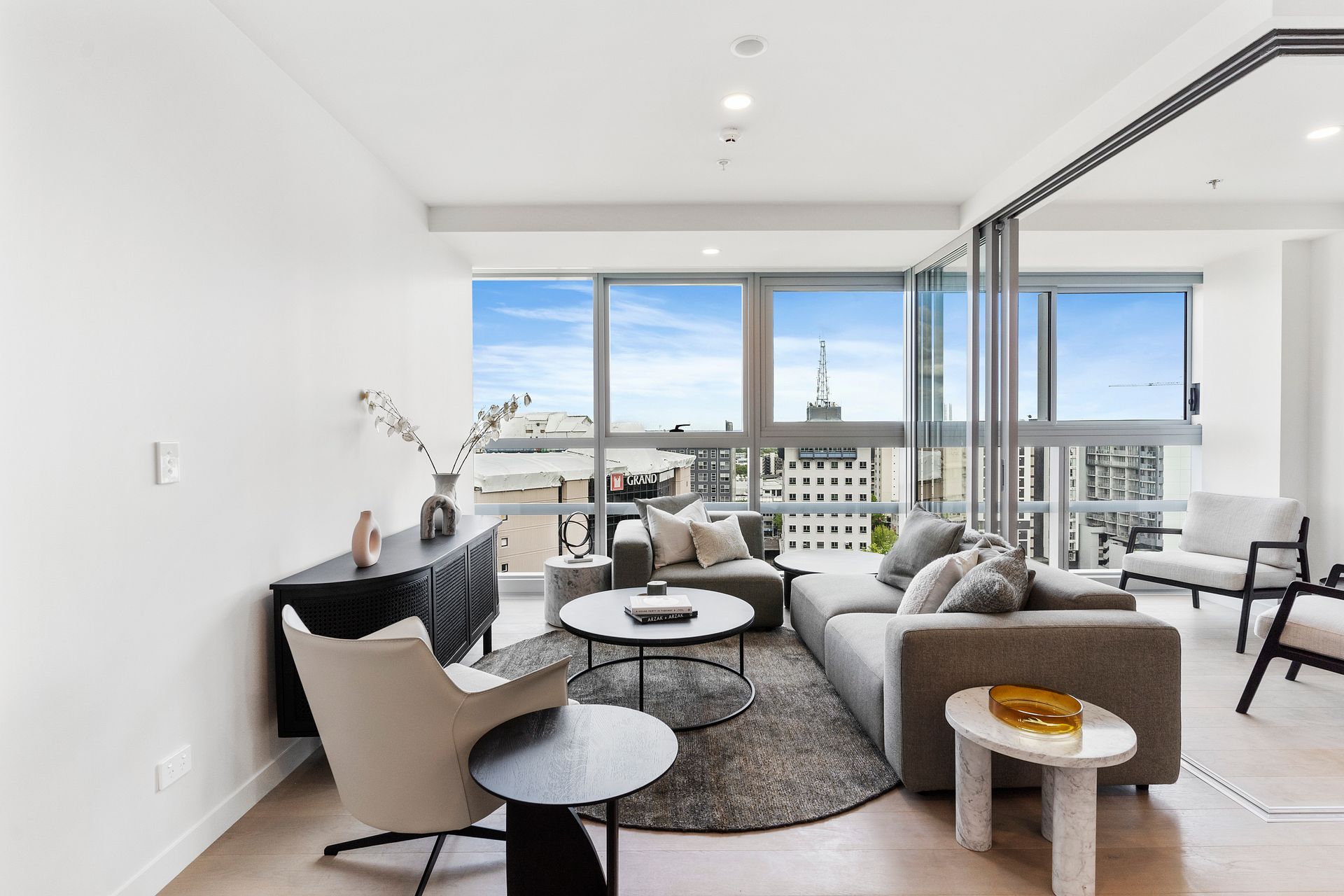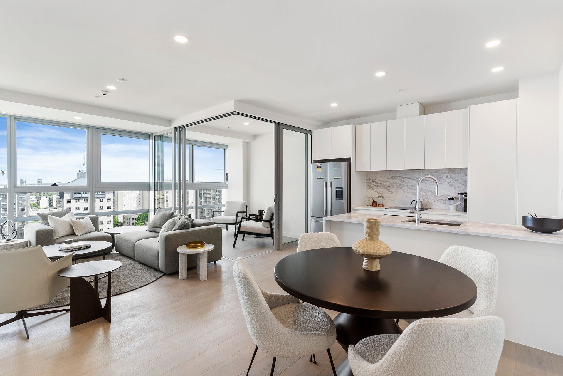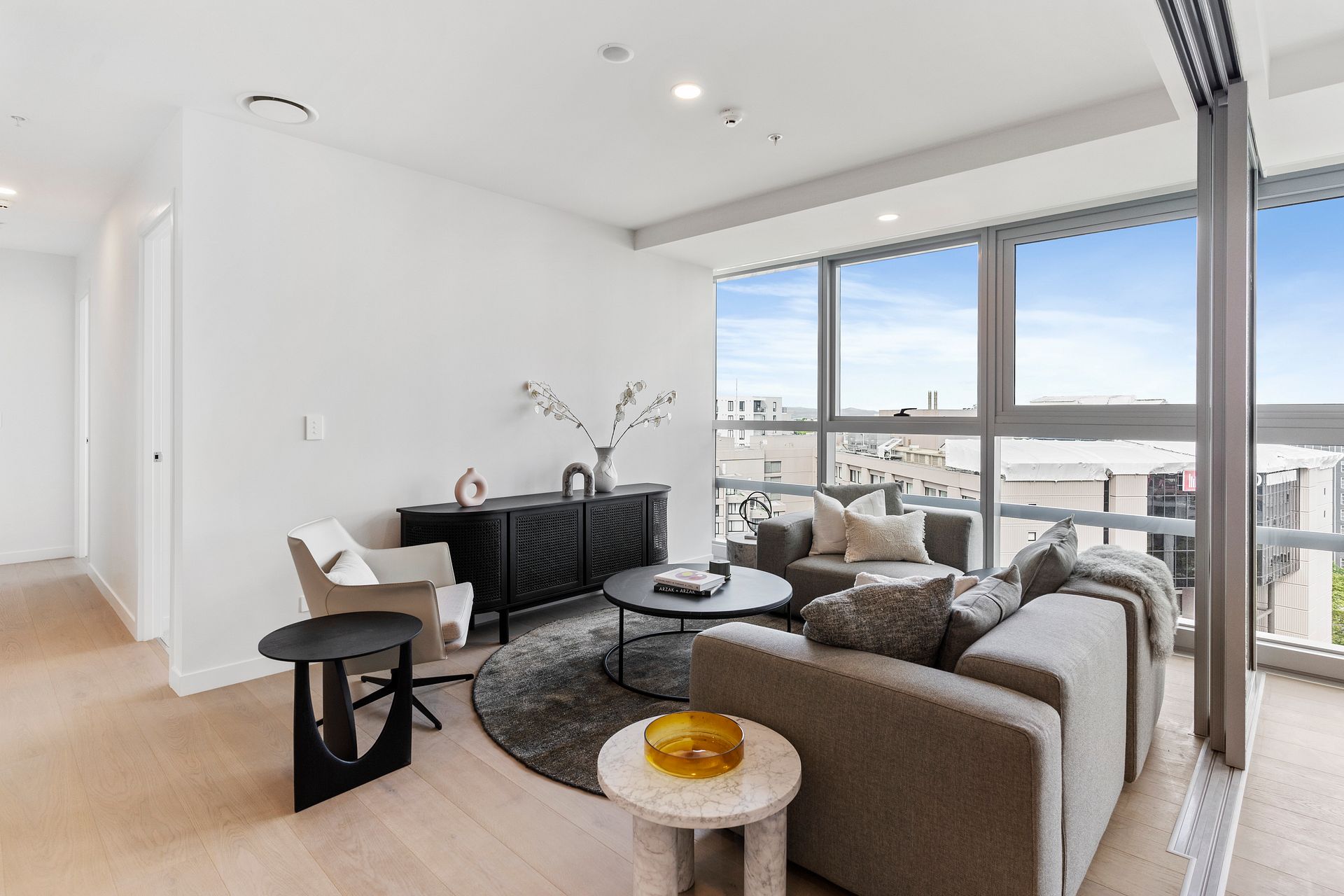 This furnished apartment makes moving in easy, with two queen beds and your lounge and kitchen ready for you to use. A full Soren-liv designer furniture package makes this a stunning space.