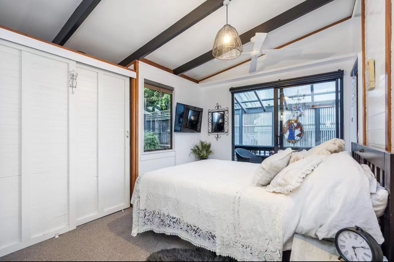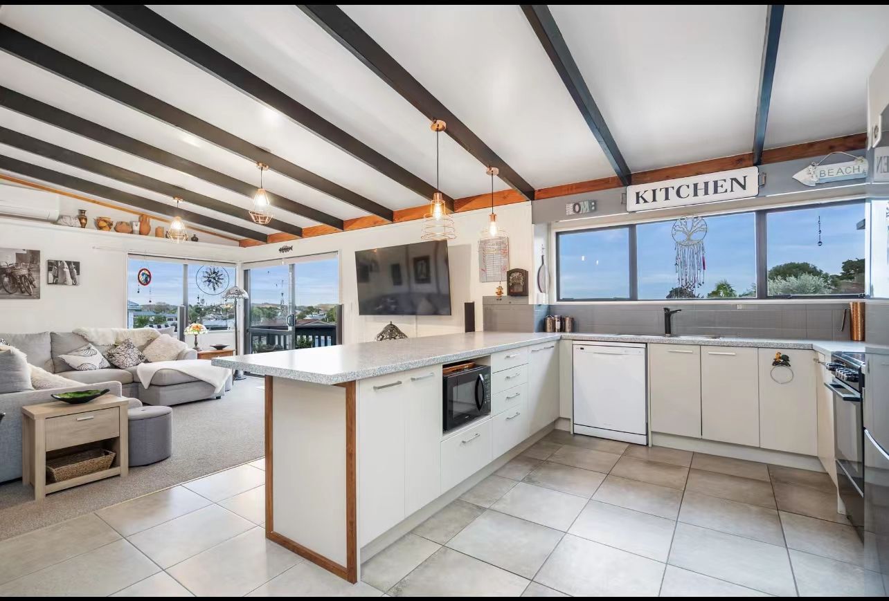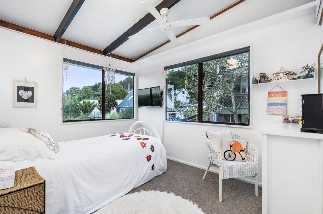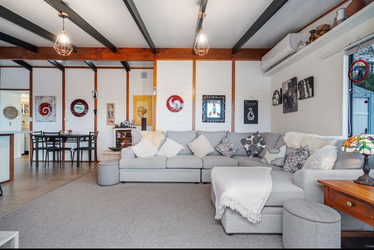 The main living is located on the upper level of the property. Comfortable open-plan living space was kept cozy with a heat pump. All bedrooms are decorated in neutral colours, with two bedrooms having ranch sliders. The modern stylish kitchen is equipped with dishwasher, and good storage.