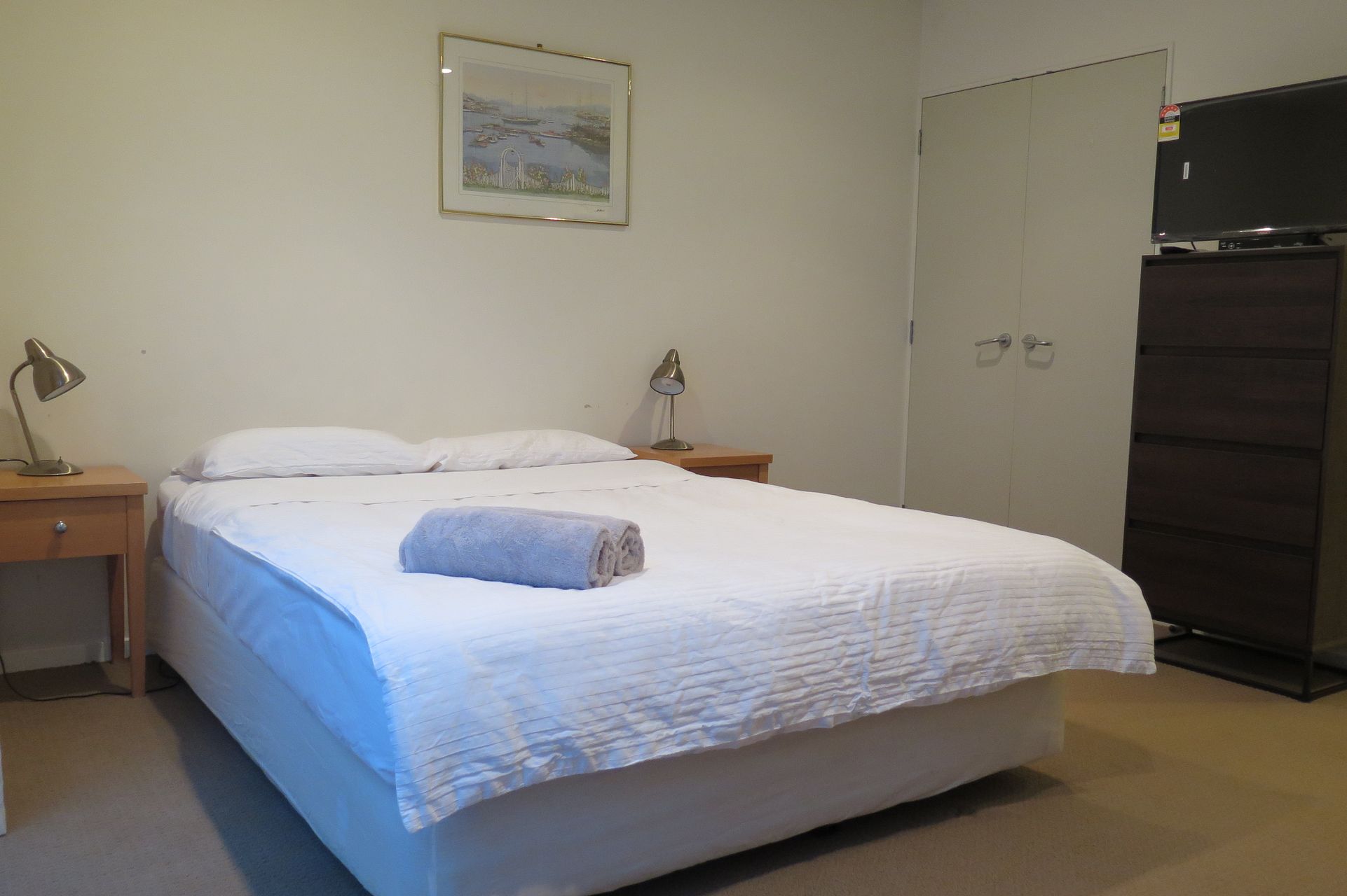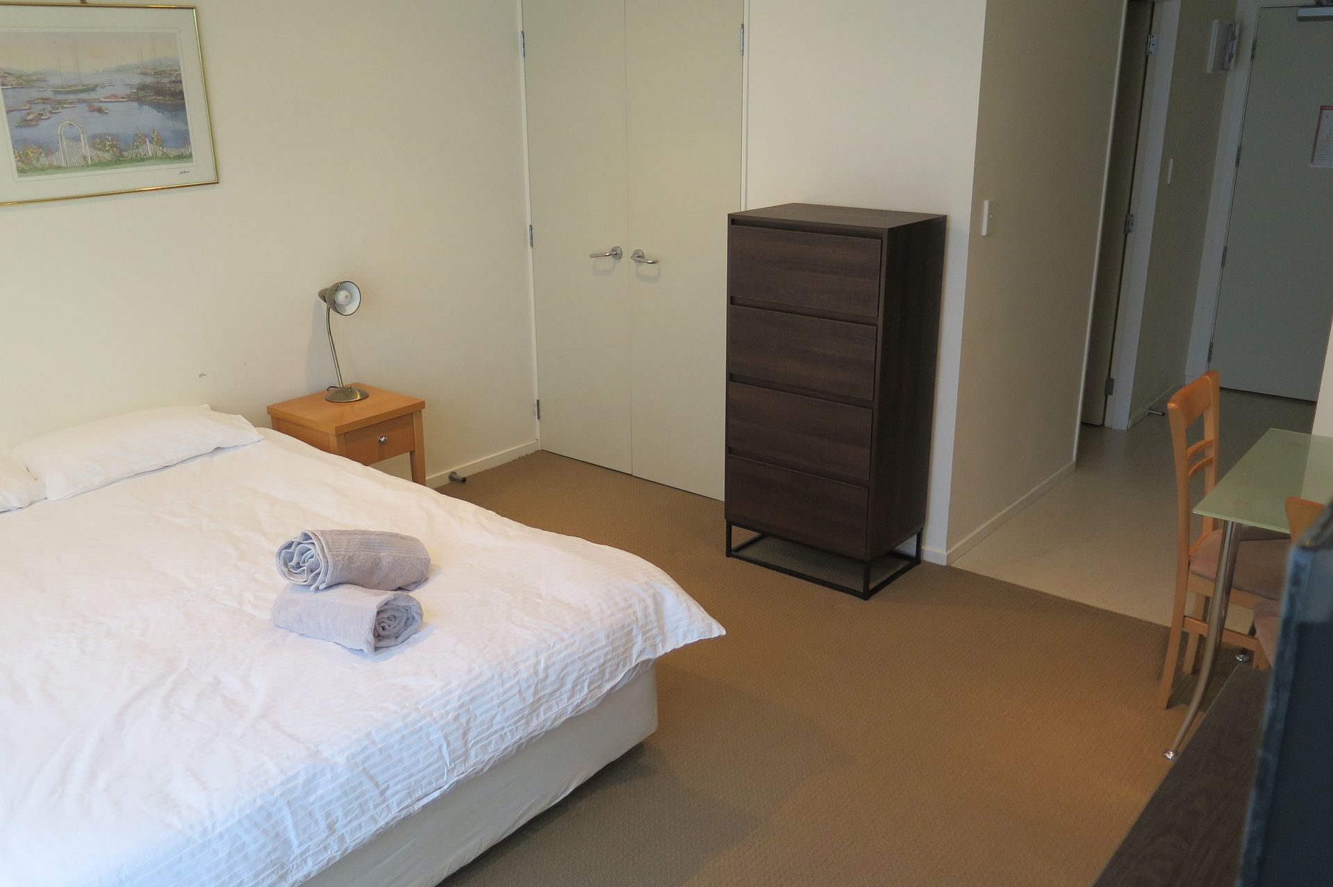There’s a double in-built wardrobe and 2 tallboys for storage. It's furnished with a washer/dryer, fridge/freezer, microwave, kitchen appliances, queen bed with bedding, dining table and chairs, etc. The fully equipped kitchen comes with quality Fisher & Paykel appliances.