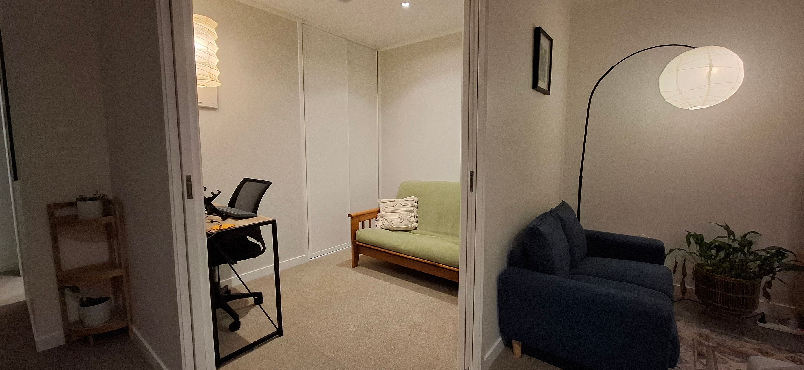- Desk with chair and double-size couch-to-bed futon in study