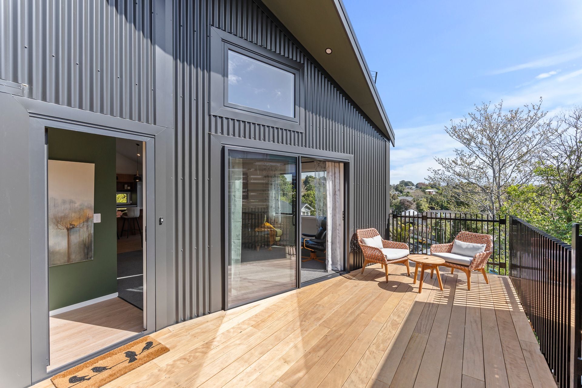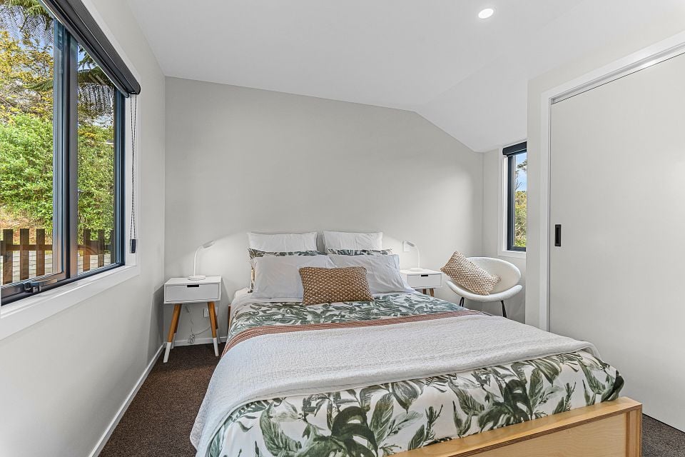 2 double bedrooms upstairs, one with ensuite, the other with adjacent bathroom. Third bedroom/lounge downstairs. Quality fixtures & restful environment throughout.