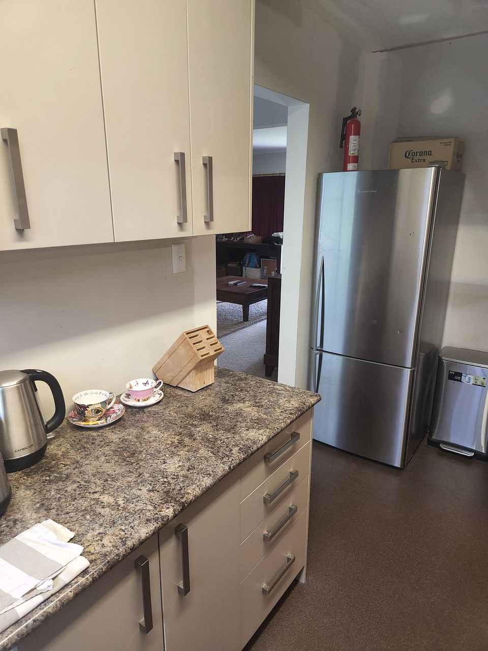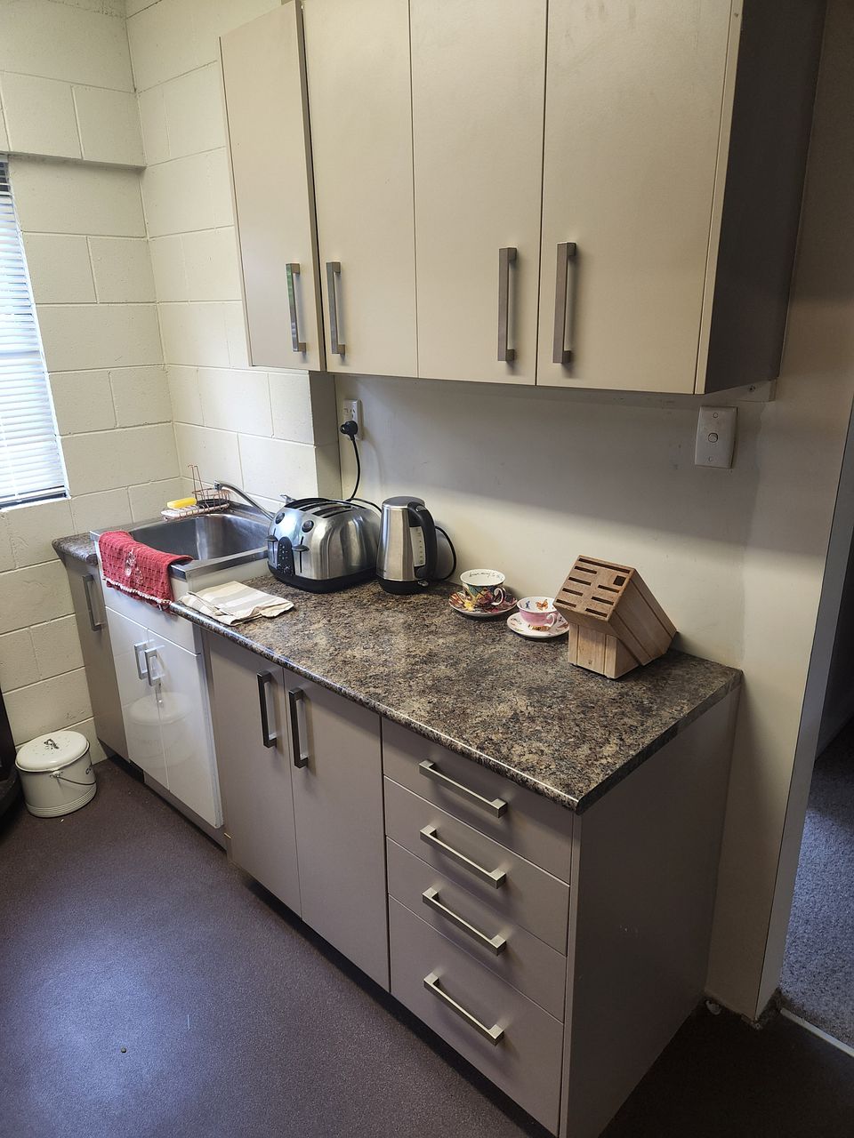 Kitchenette - sink, kettle, toaster, fridge, air fryer.