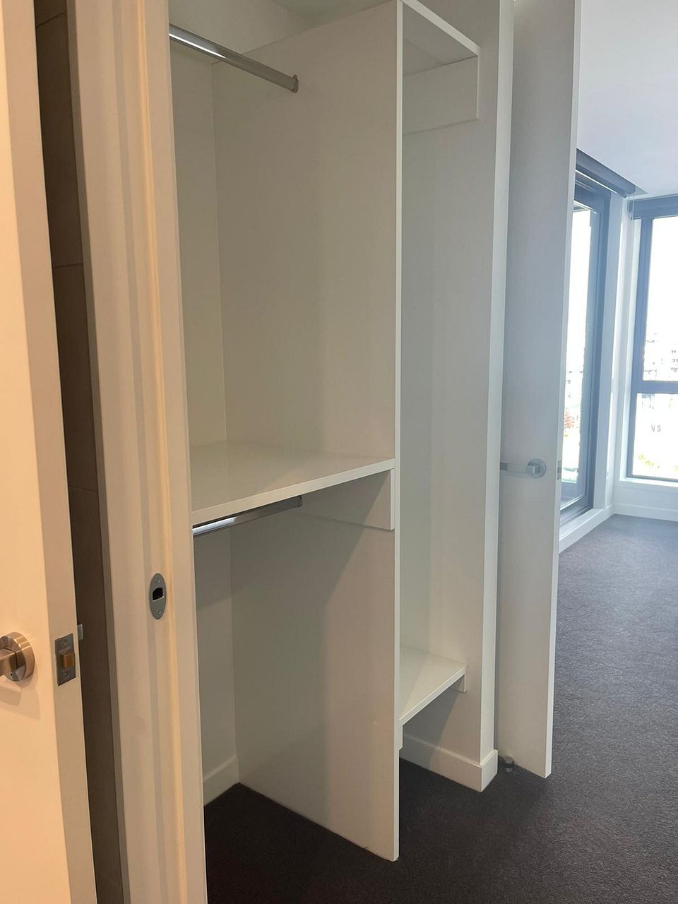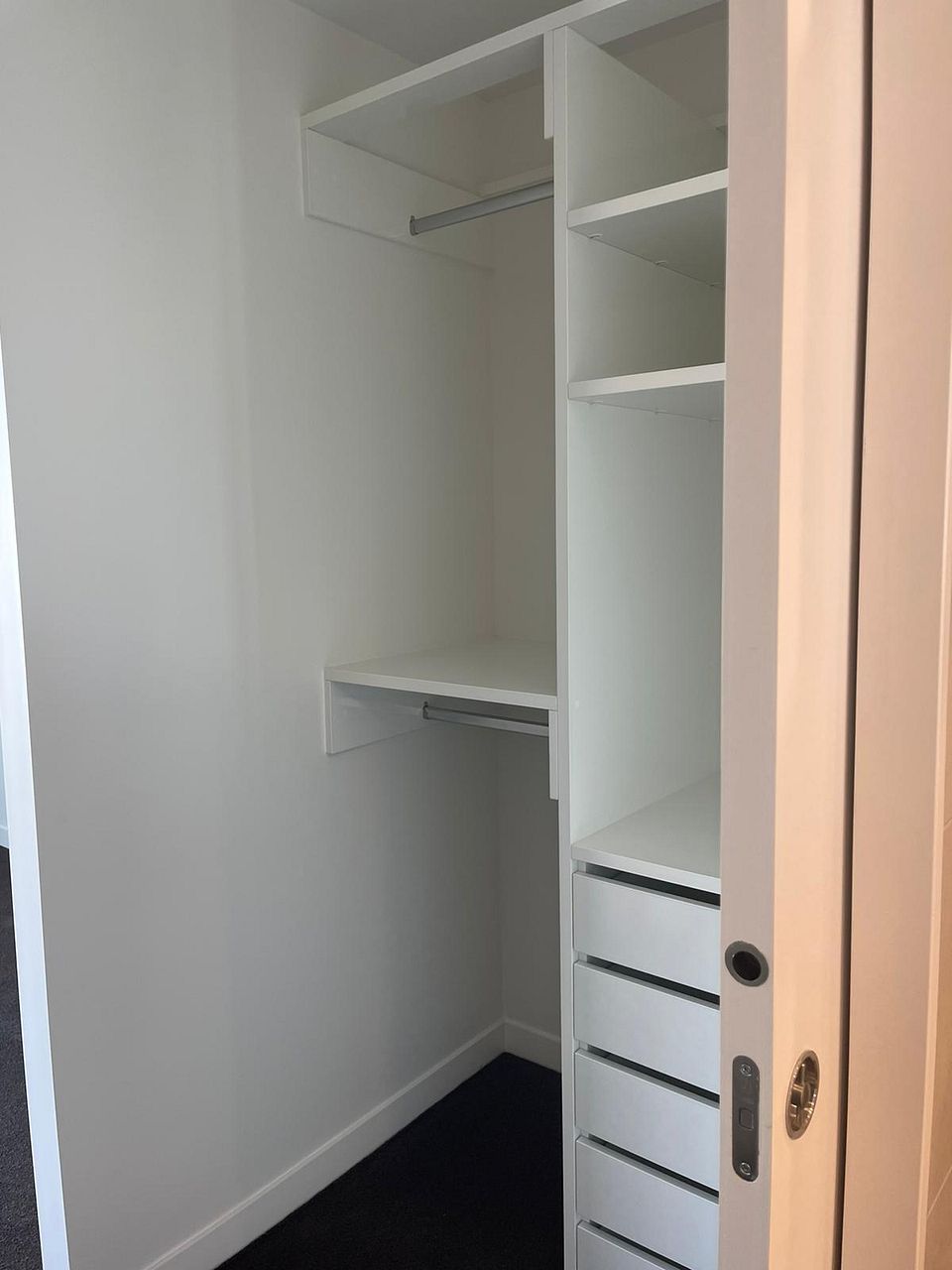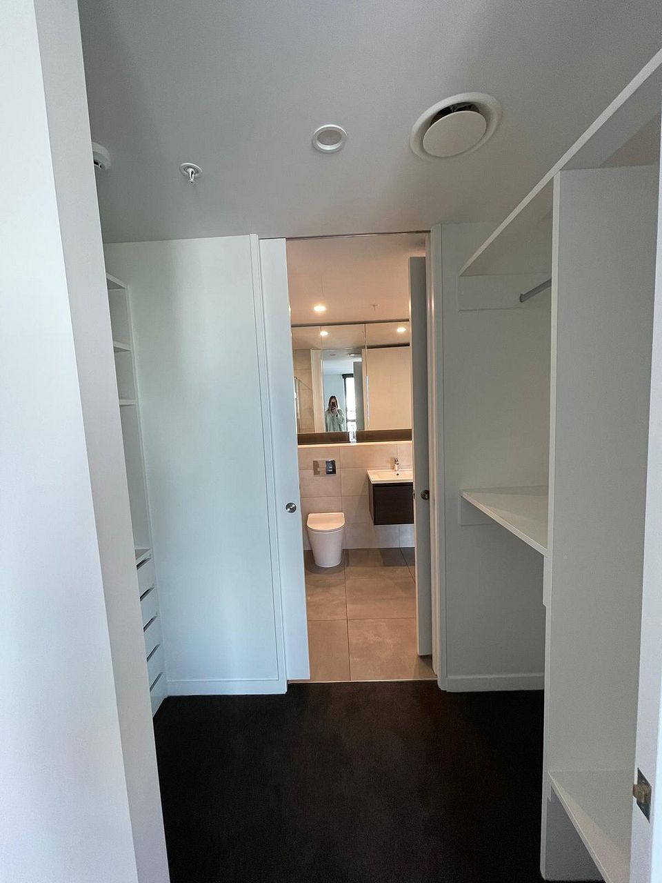 - Master Bedroom: Large master with integrated walk-in wardrobe (with storage/shelving/drawers), ensuite/bathroom access, and amazing natural light with access to the balcony.