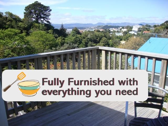 2 bedroom upstairs flat with lovely outlook, fully furnished. Clean and tidy. Great sun. Separate (shared) laundry with washing machine and dryer. Doors open out onto a sunny deck. Built-in wardrobes. Fully equipped kitchen and bathroom. Street Parking. A quieter alternative to city apartment living. Set up for Fibre.