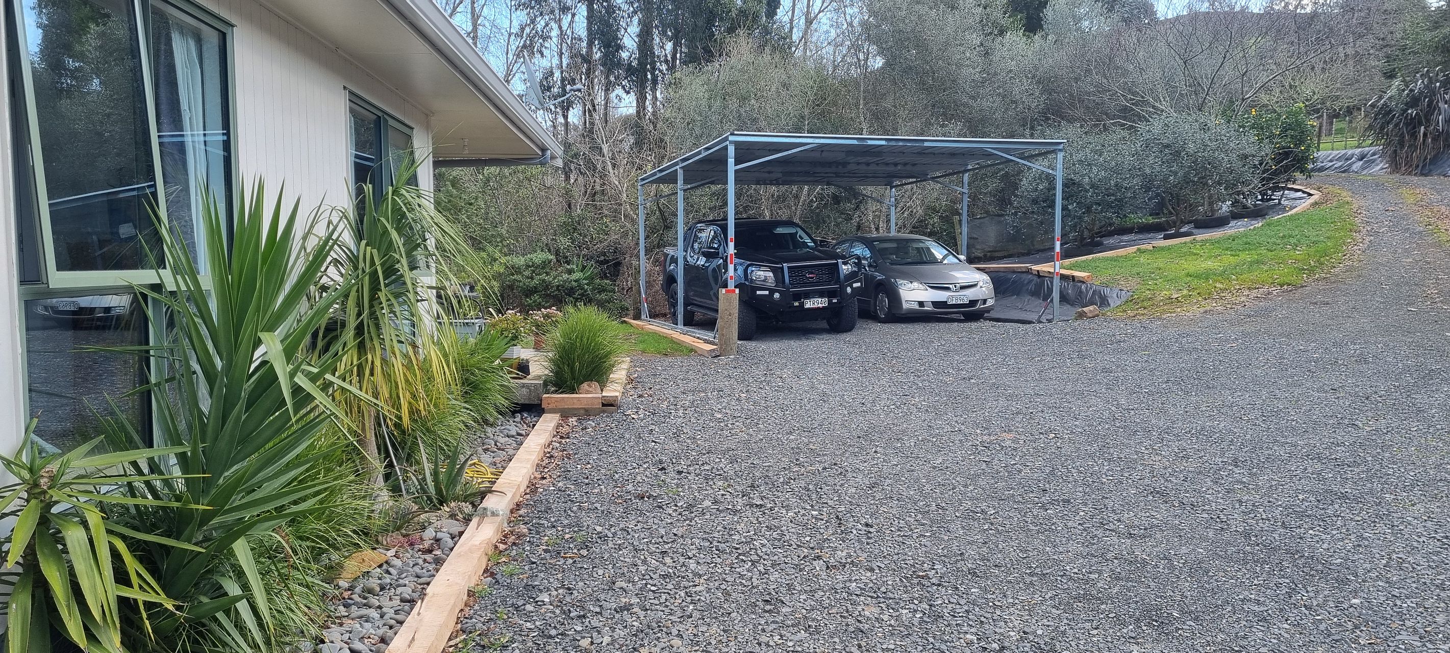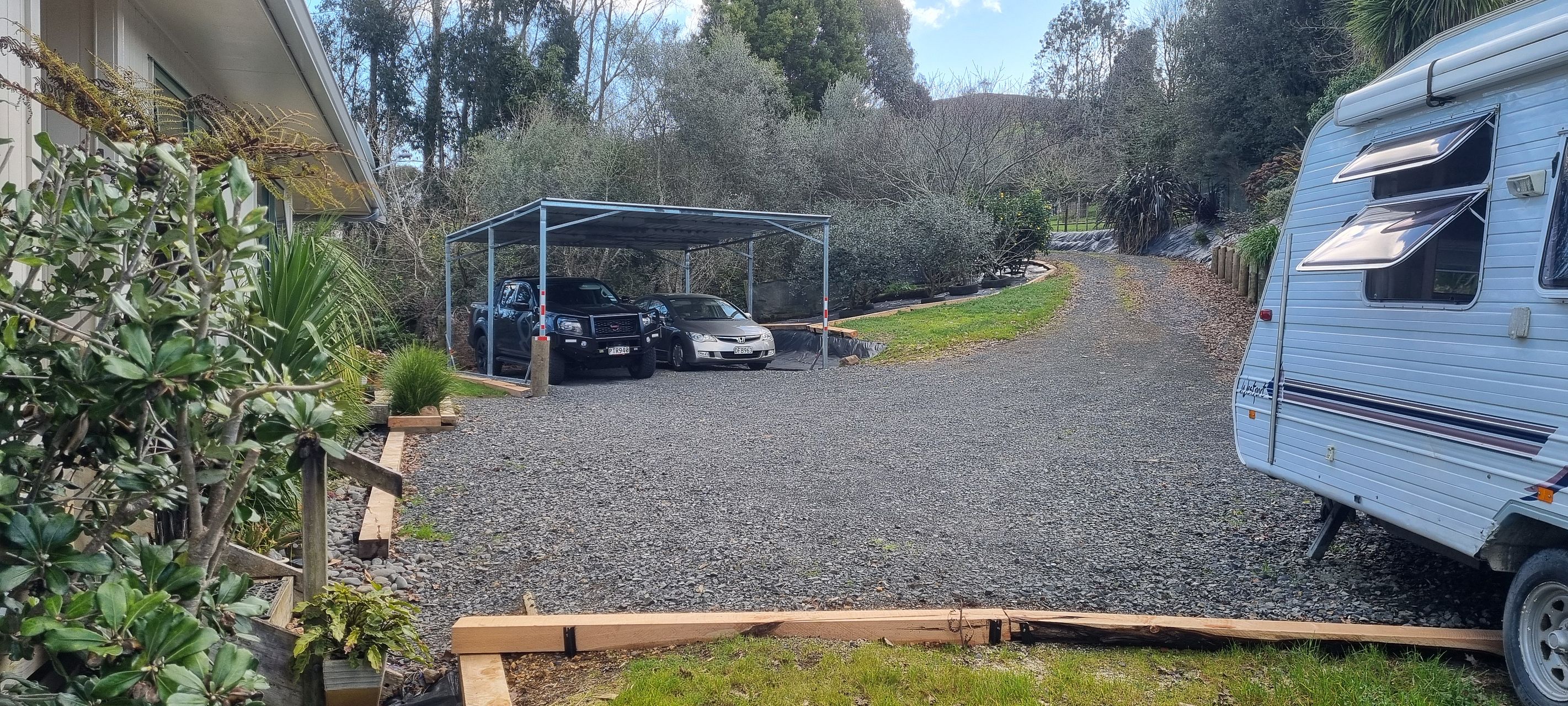 • Garden beds with weedmat and macrocarpa edging for quick easy lawn mow area