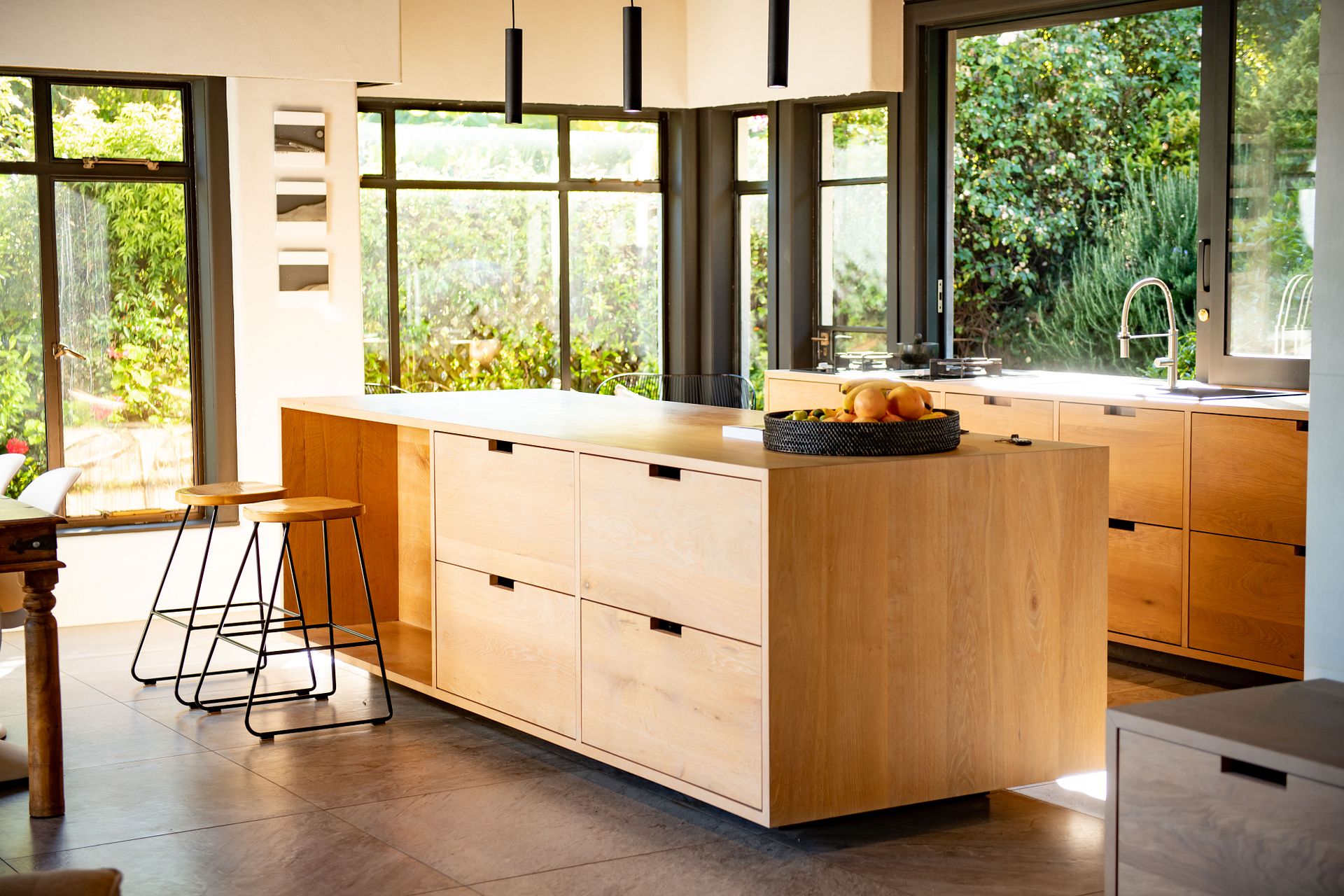 A cleverly designed kitchen and dining/living space is bathed in light with large windows on either side taking in views of garden and sparkling sea. A spacious second lounge is separate.