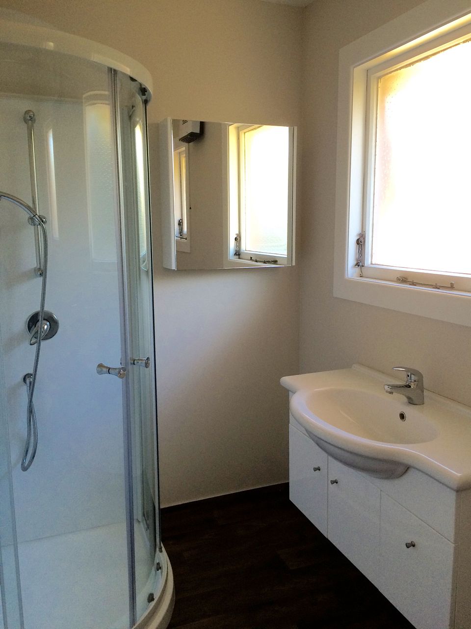 • Modern bathroom with shower, vanity, heater, (no bath).
