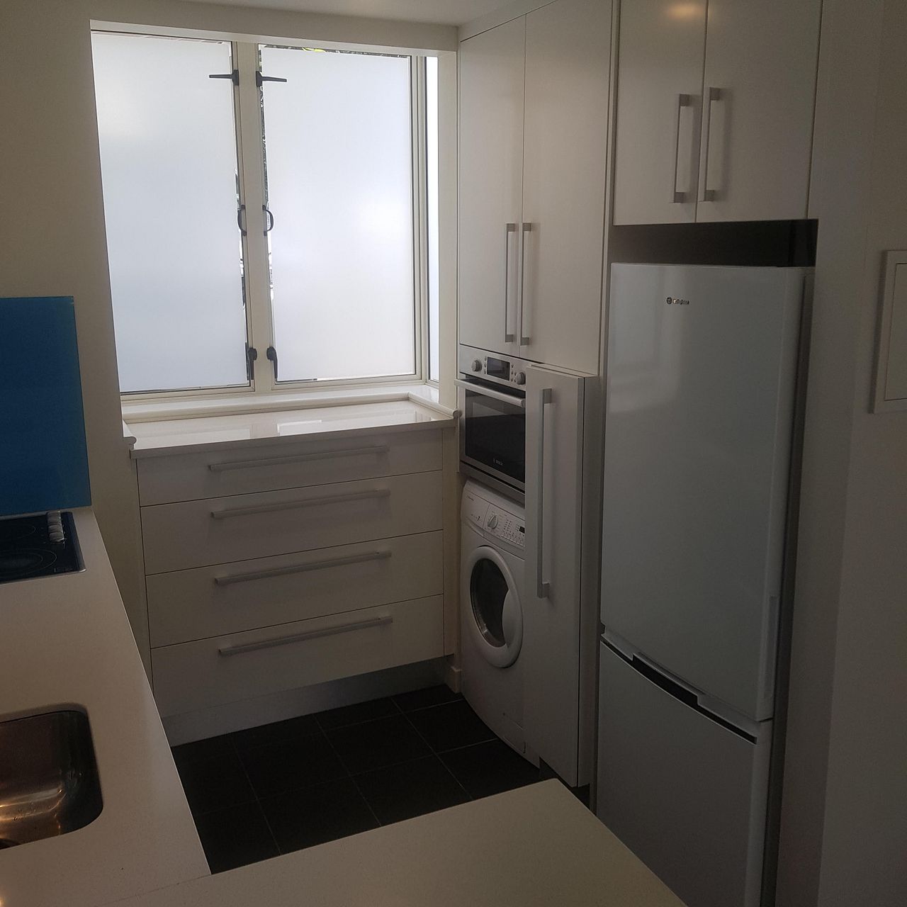 Dishwasher, microwave, washing machine and fridge/freezer.