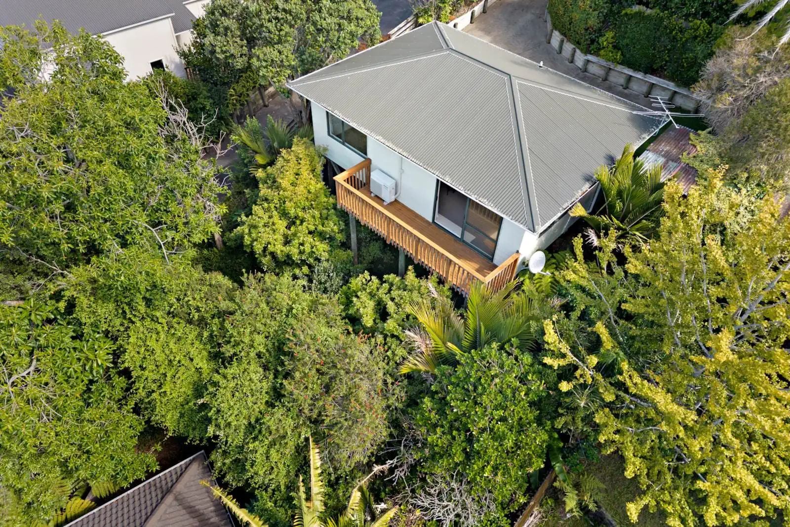Treehouse Vibes: Large windows frame stunning vistas of the surrounding canopy and beyond.