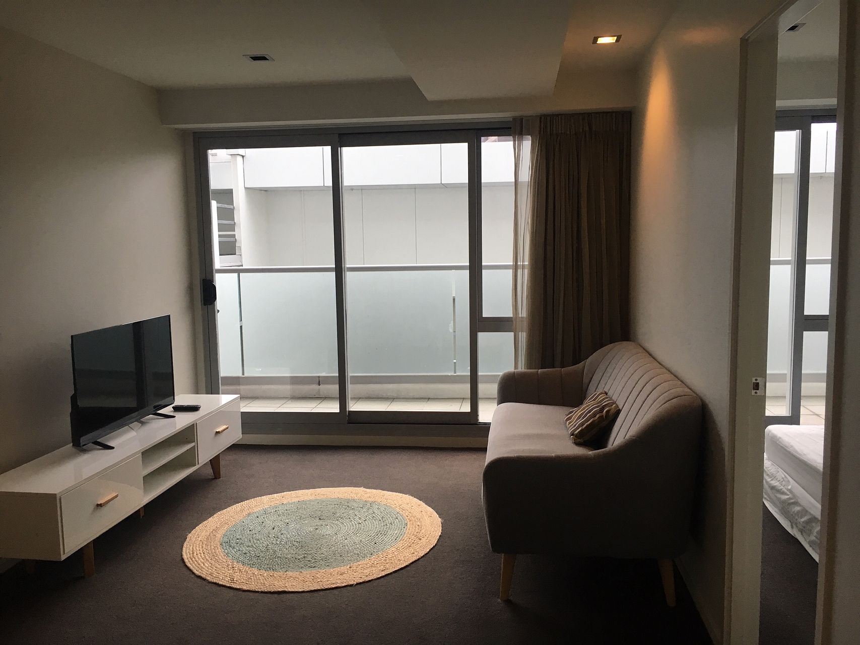 Two sliding doors to a large balcony let the light stream into the space.