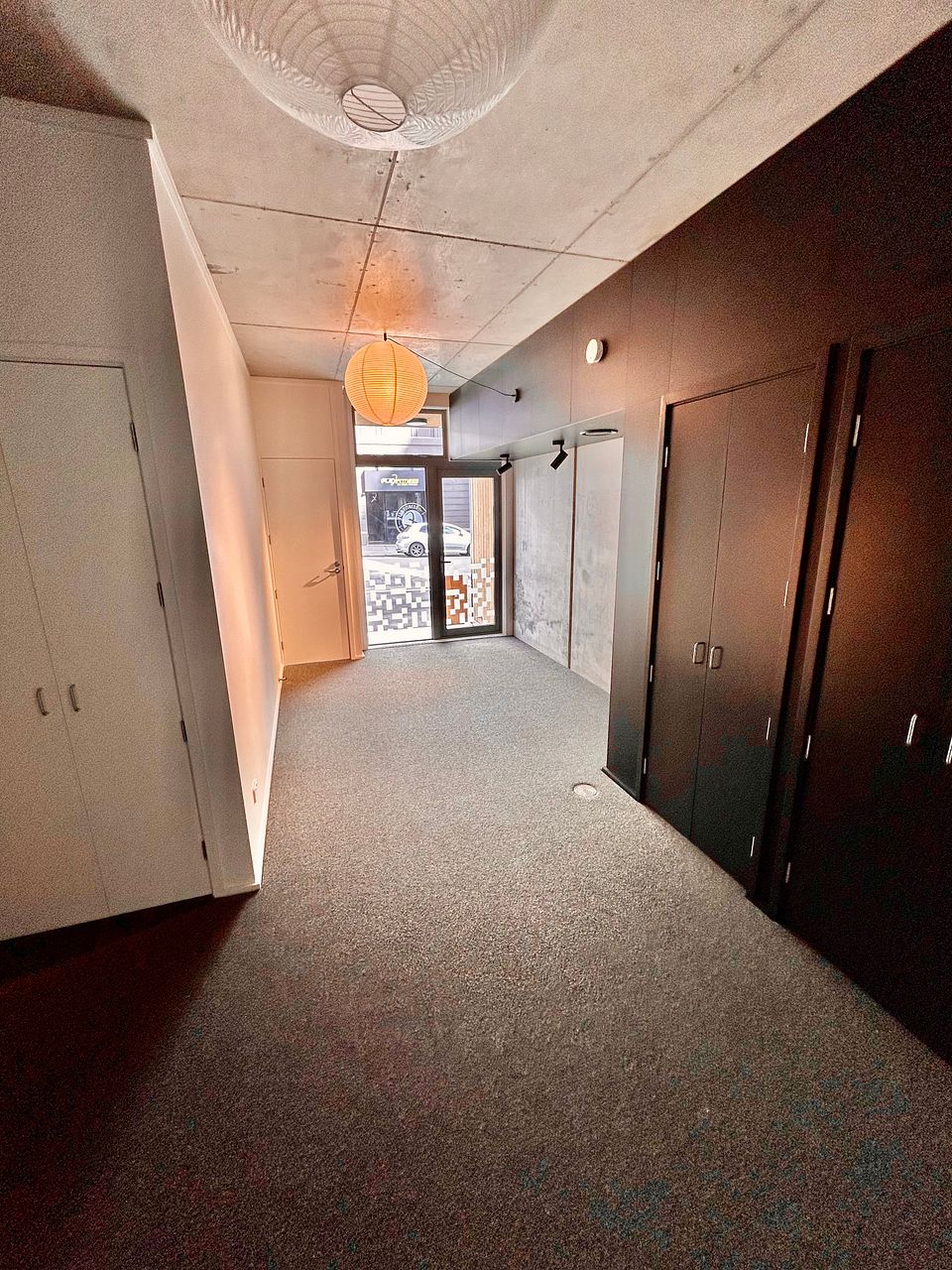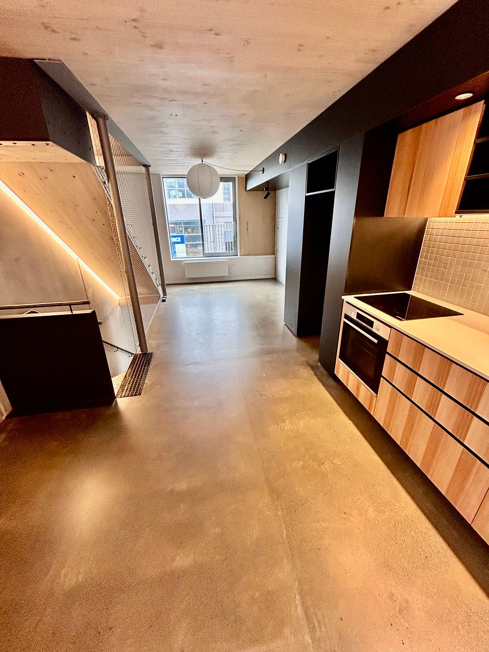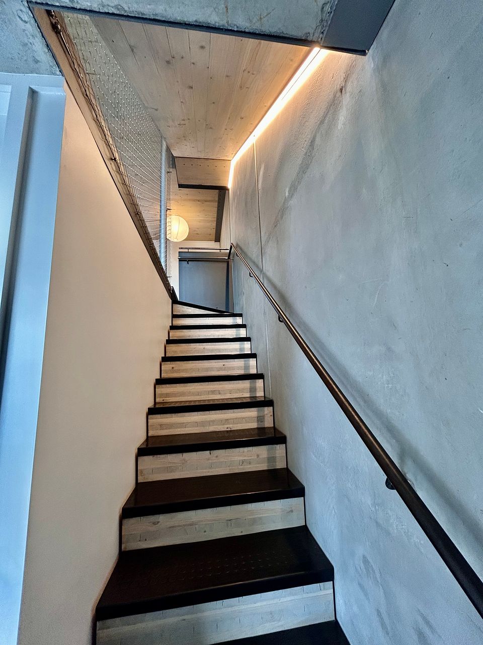 A stunning and spacious brand new 4-story townhouse with industrial-style interior: exposed concrete walls, wooden panel ceilings and strip lighting.