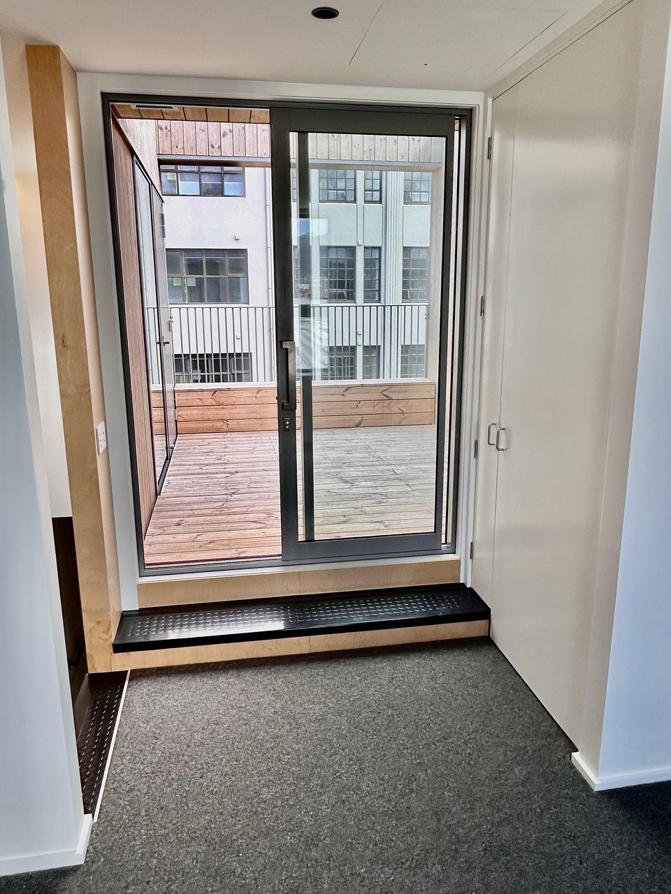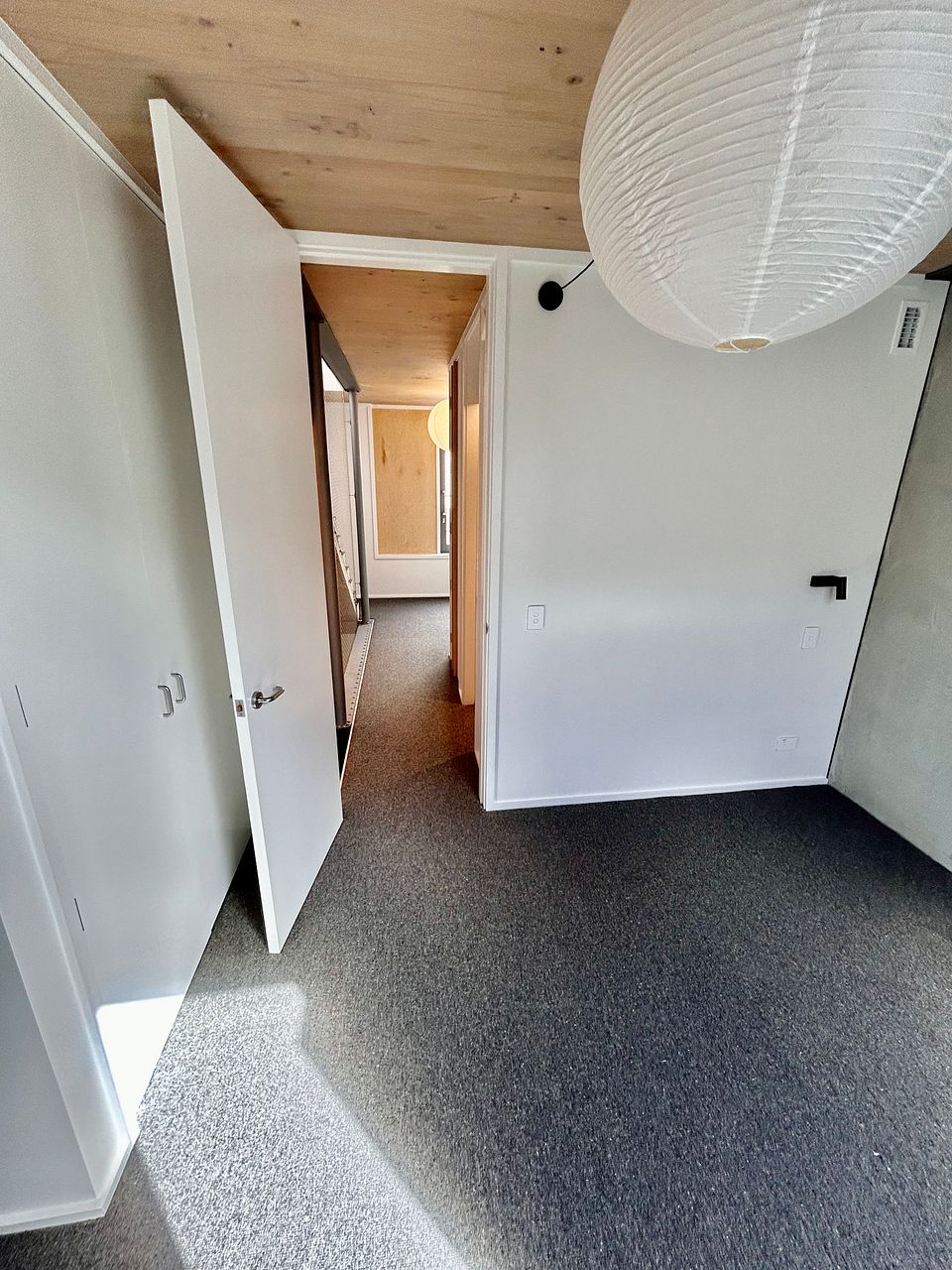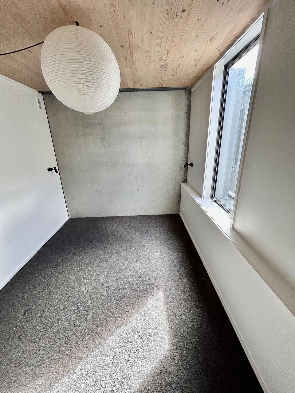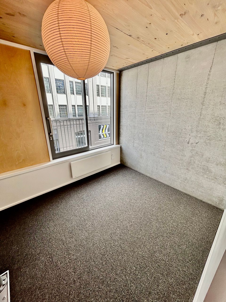 A stunning and spacious brand new 4-story townhouse with industrial-style interior: exposed concrete walls, wooden panel ceilings and strip lighting.