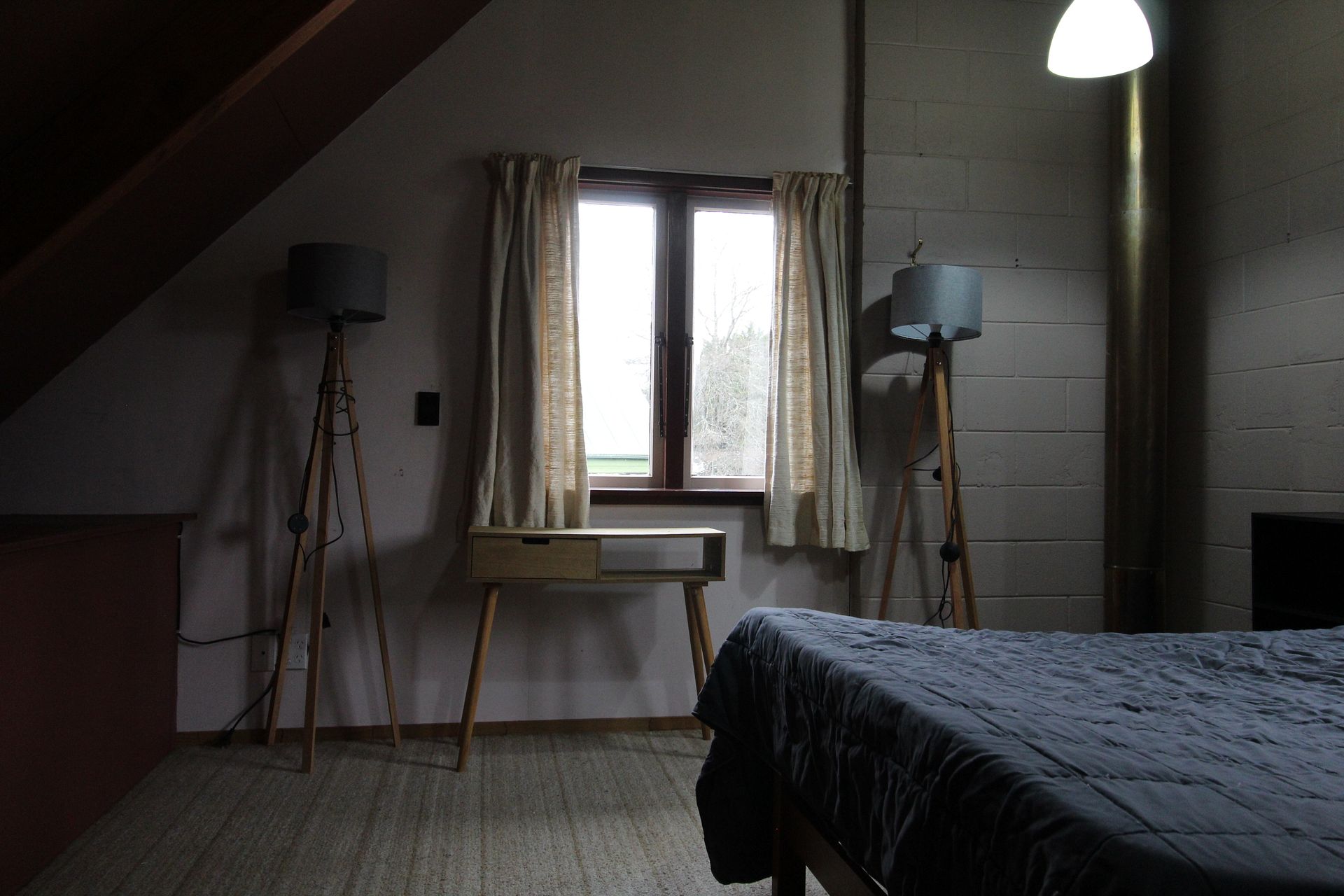 The mezzanine floor upstairs features the a large bedroom area, and down stairs features the living area, kitchen and bathroom.