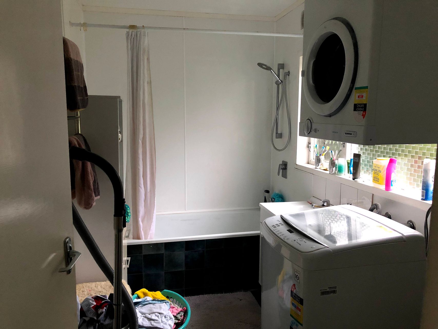 One bathroom with a shower over the bath which also includes the laundry.