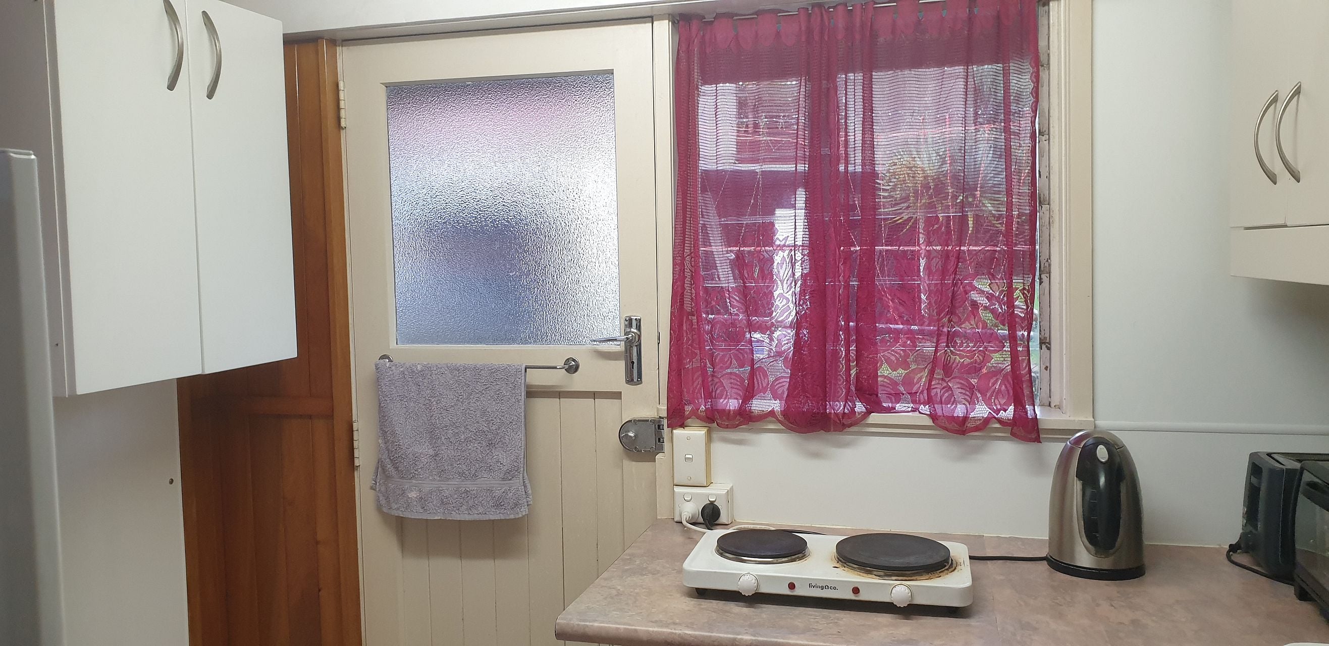 washing machine, fridge, Electric Kettle, Toaster, and a mini oven.