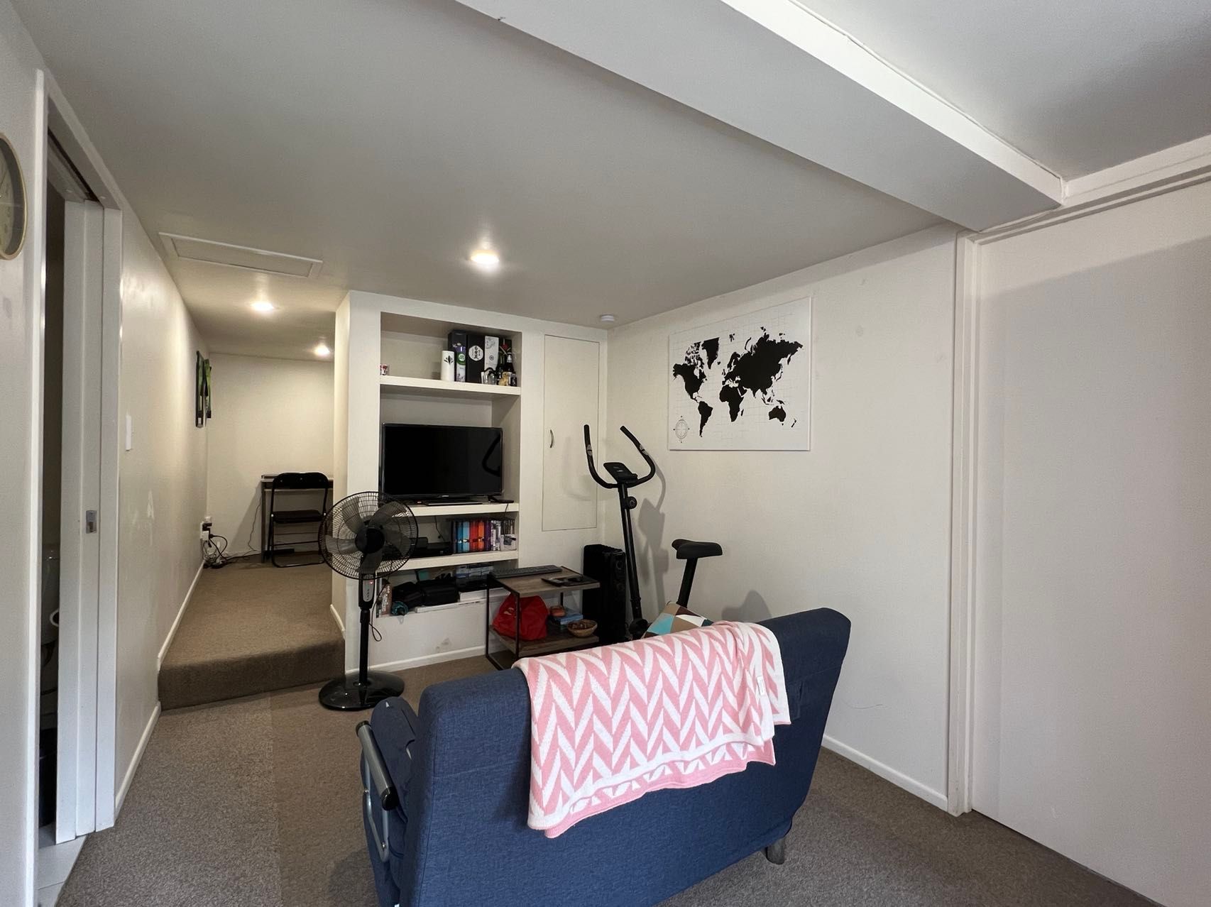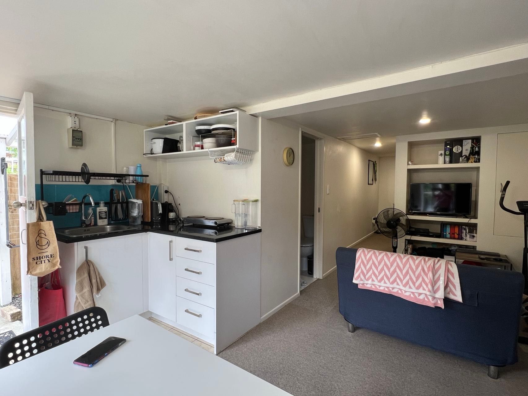 A separate laundry is accessed slightly further up the path from the unit's front door and the water is included in the rent (however power is metered separately from the main house). The unit also has its own fibre connection and is excluded from the rent.