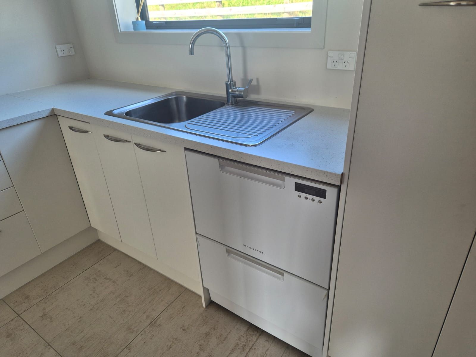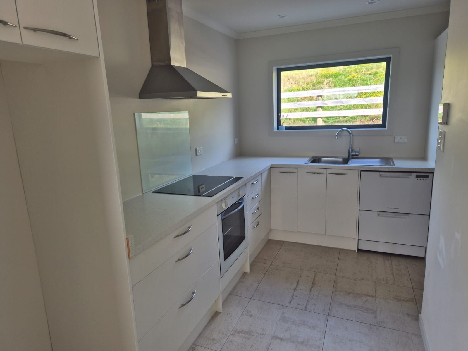 The home features a fully ducted air conditioning system for year-round comfort, an energy-efficient heat pump hot water cylinder, and a modern kitchen complete with a dish drawer. The open-plan living area is light and inviting, with easy flow to the outdoor concrete areas.